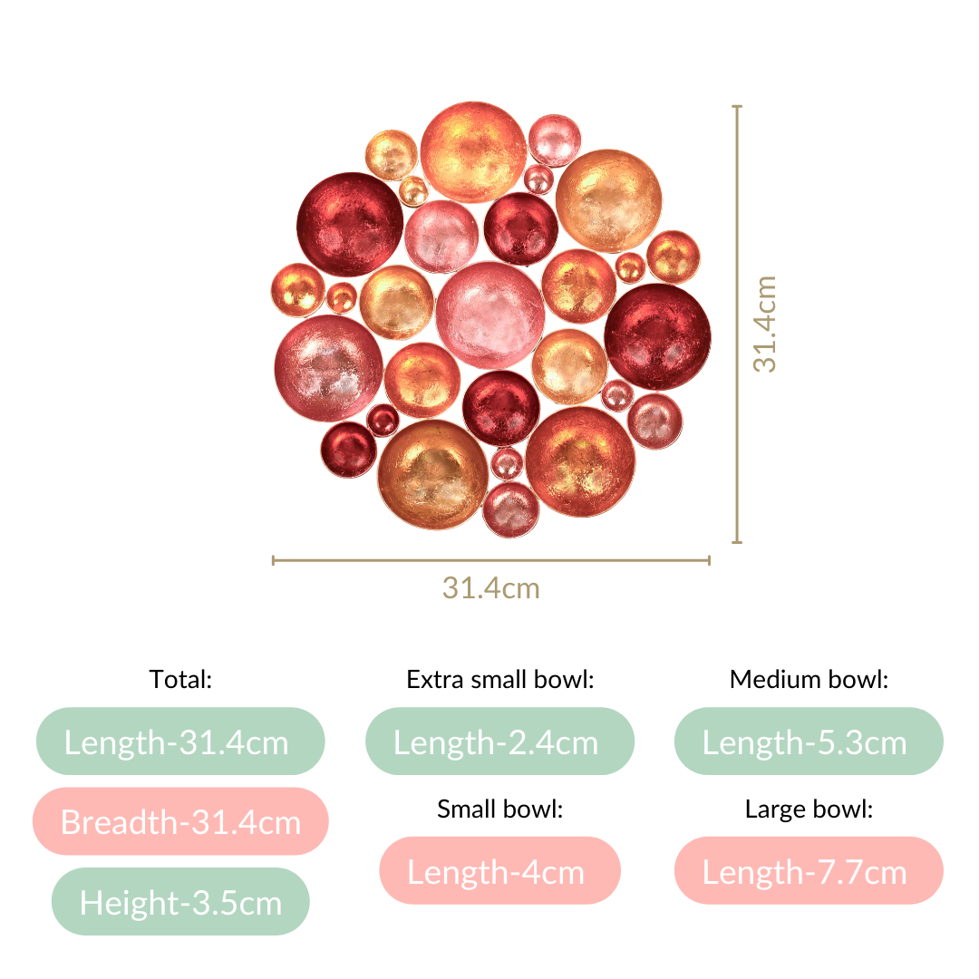 Design: Crafted from premium-quality iron, this decorative tea light holder features four different-sized bowls, forged together to create a striking and cohesive design. Each bowl is finished with luxurious gold spray paint on the outside, while the interiors are coated with vibrant metallic foils in baby pink, red, orange, and gold. This dynamic combination offers a captivating visual contrast that enhances the play of light.