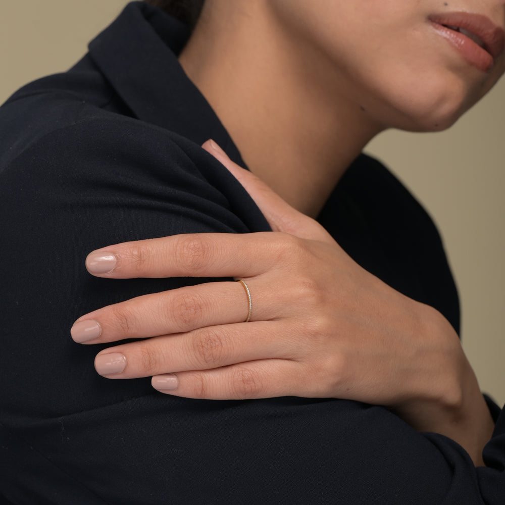 The Delicate Diamond Band is an elegant jewellery piece crafted from stainless steel with 18k gold plating. Featuring sparkling white cubic zirconia stones, it is waterproof and anti-tarnish for everyday wear. Its slim, refined design makes it perfect for stacking or wearing solo, adding a touch of subtle sparkle and timeless sophistication to any outfit or jewellery collection.
