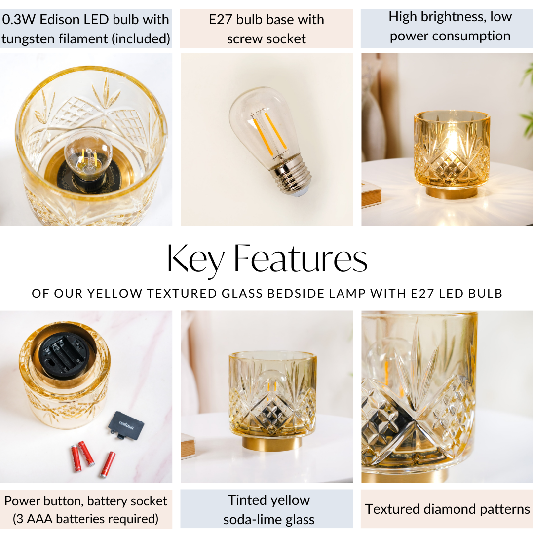Design: The battery lamp features a 0.3-watt Edison LED bulb with a tungsten filament, offering high brightness while consuming minimal power. Its tinted yellow soda-lime glass showcases a textured diamond pattern, adding a vintage touch to modern interiors. The sturdy metal base includes a power button and houses the battery socket for easy operation, making it ideal for a bedside table or accent lighting.