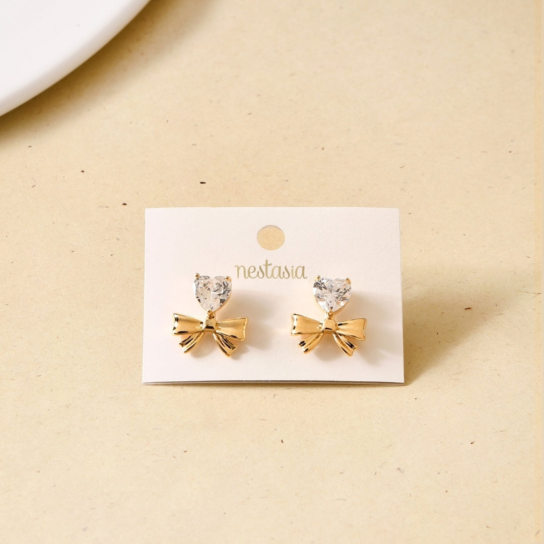 A vision of grace and romance, these gold-toned stud earrings embrace the essence of delicate femininity. Inspired by the coquette aesthetic, they capture a whimsical charm, blending soft allure with vintage elegance. A radiant heart-shaped diamante sits at the center, catching the light with every movement, while a dainty gold bow drapes elegantly below, adding a graceful touch. A perfect harmony of sweetness and elegance, they offer a subtle yet striking statement for those drawn to feminine, vintage-inspired details.