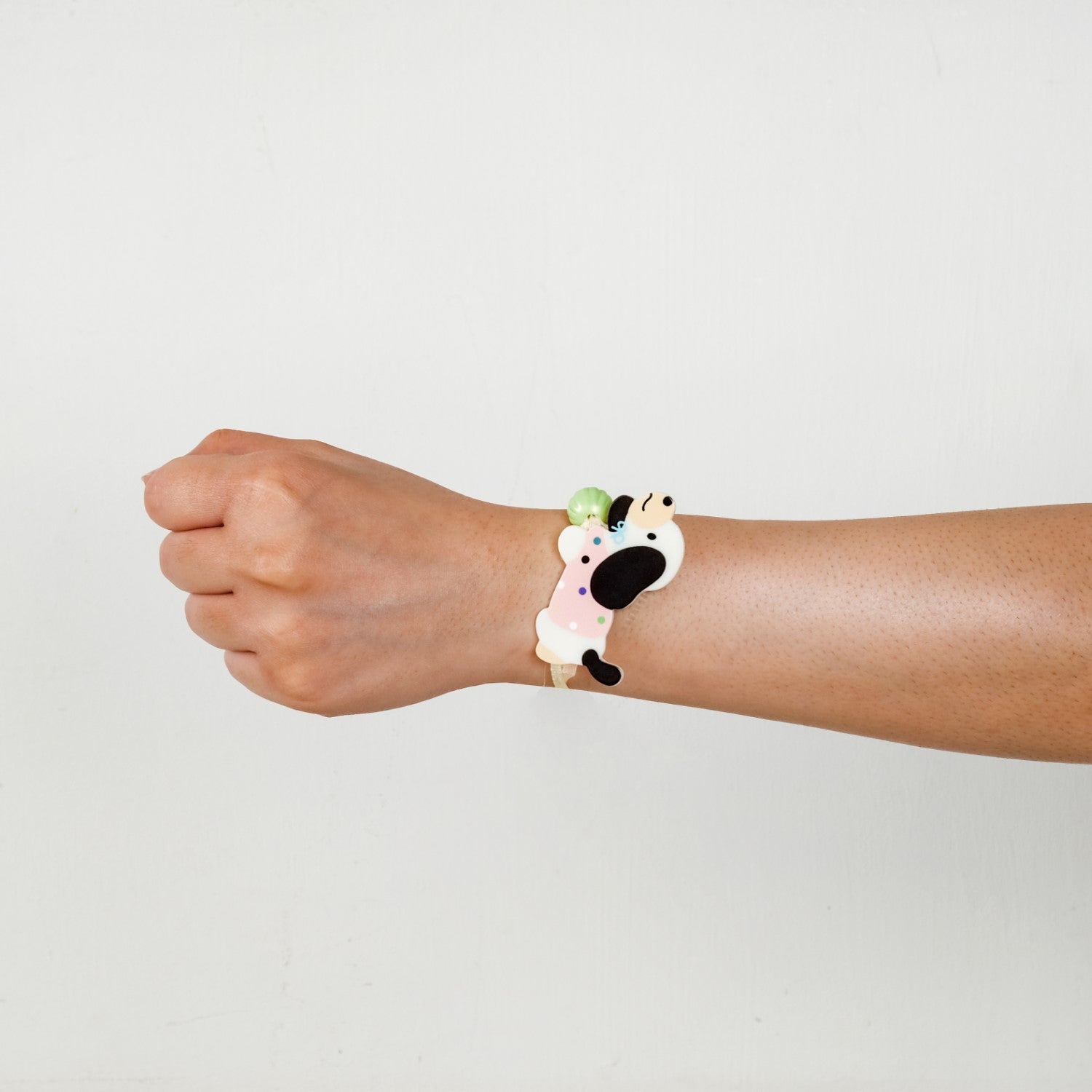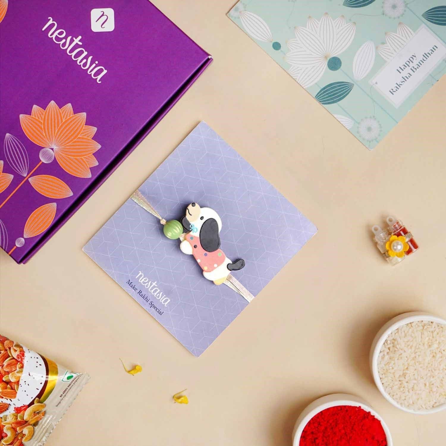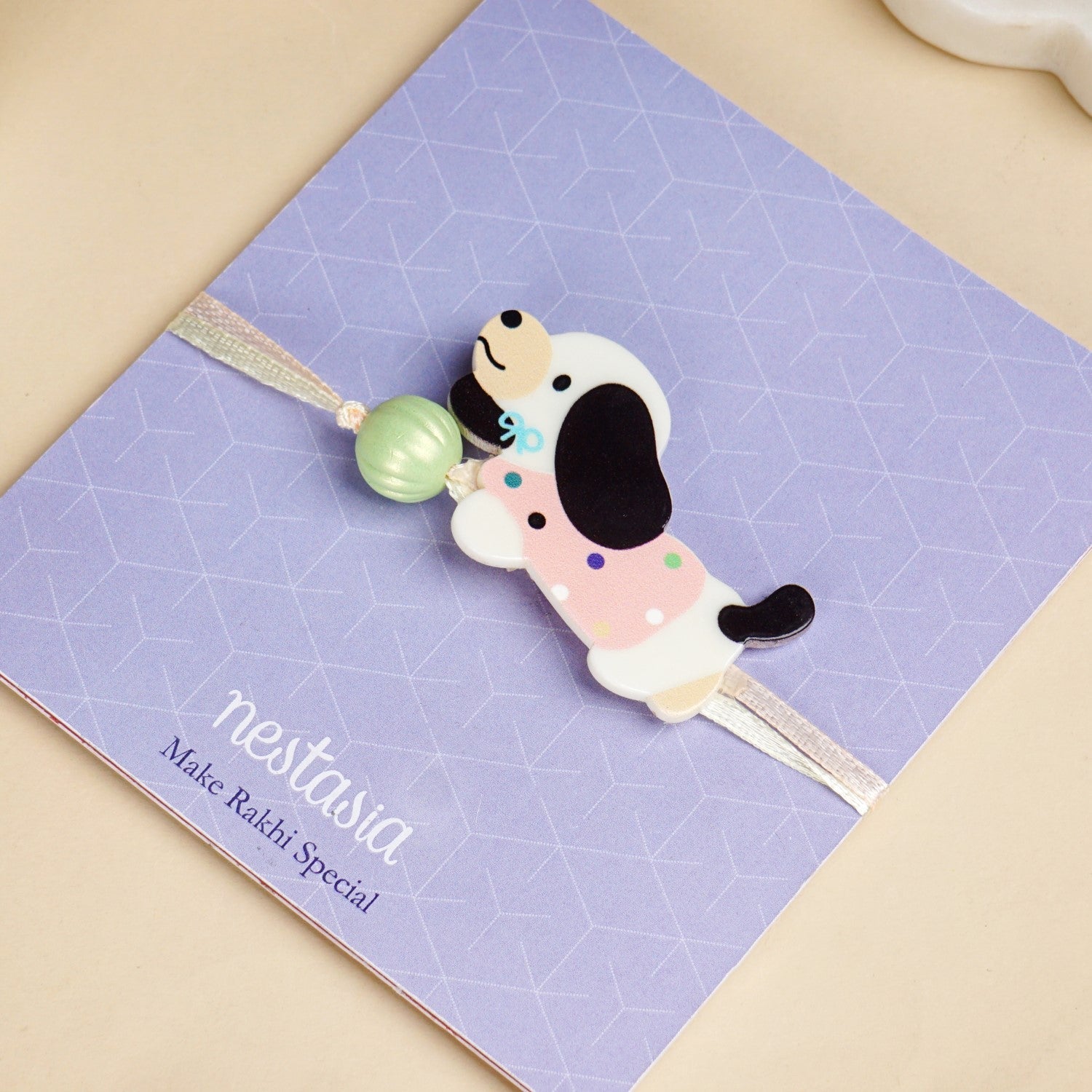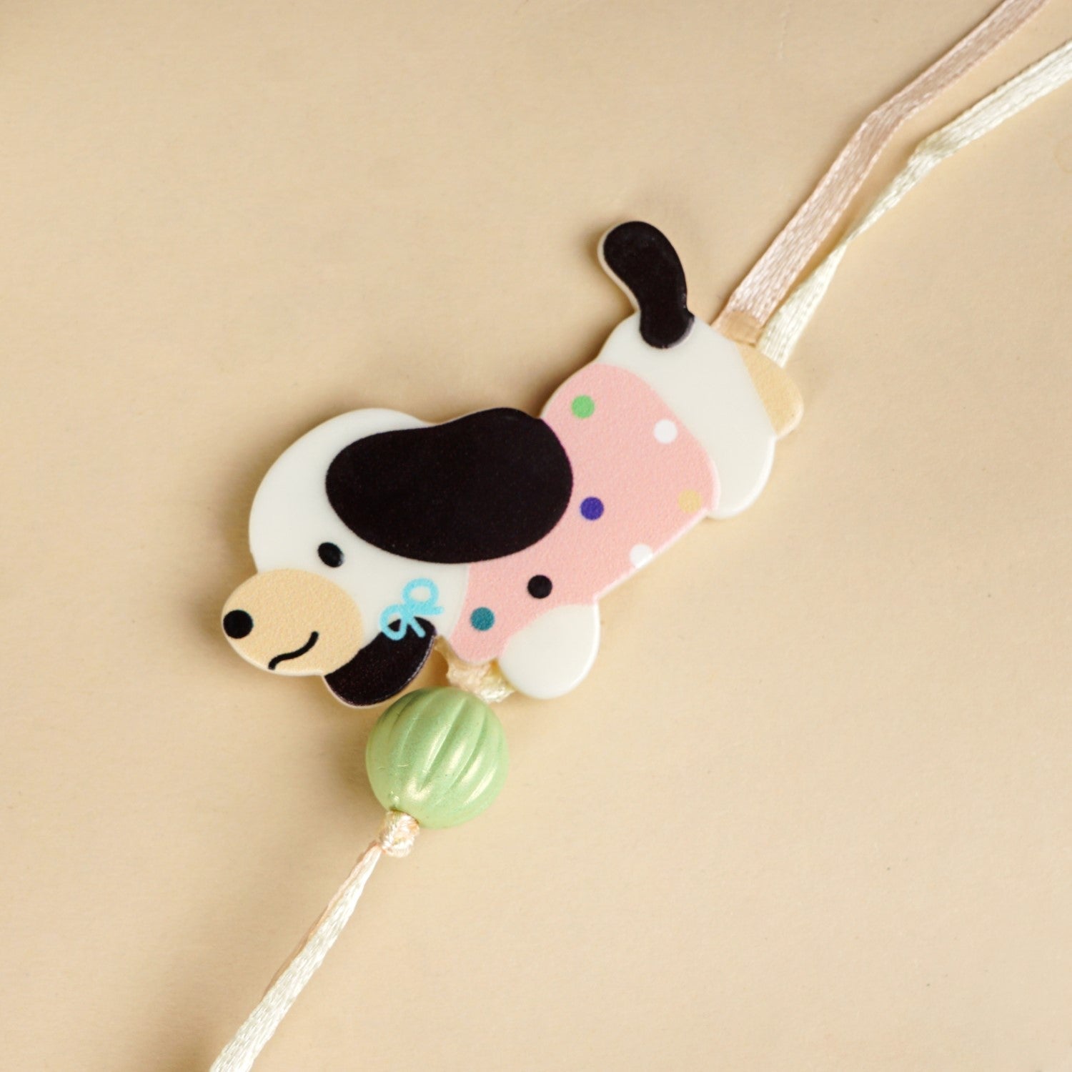 This cute doggo rakhi is even perfect for siblings who love their pet friends too much. The ribbons are in a trendy colour combination of pastel pink and yellow with a medium-sized sage green bead.