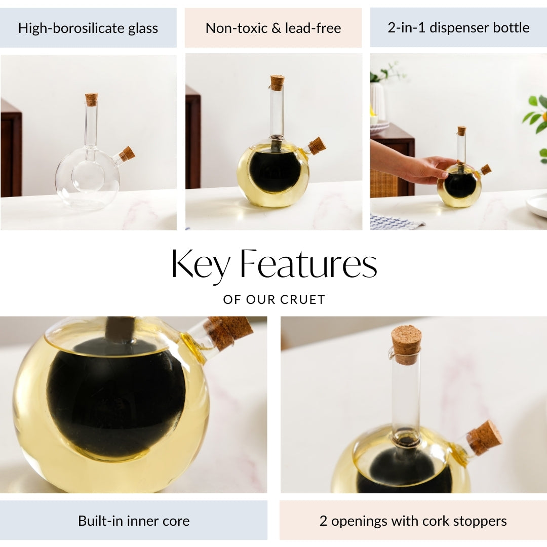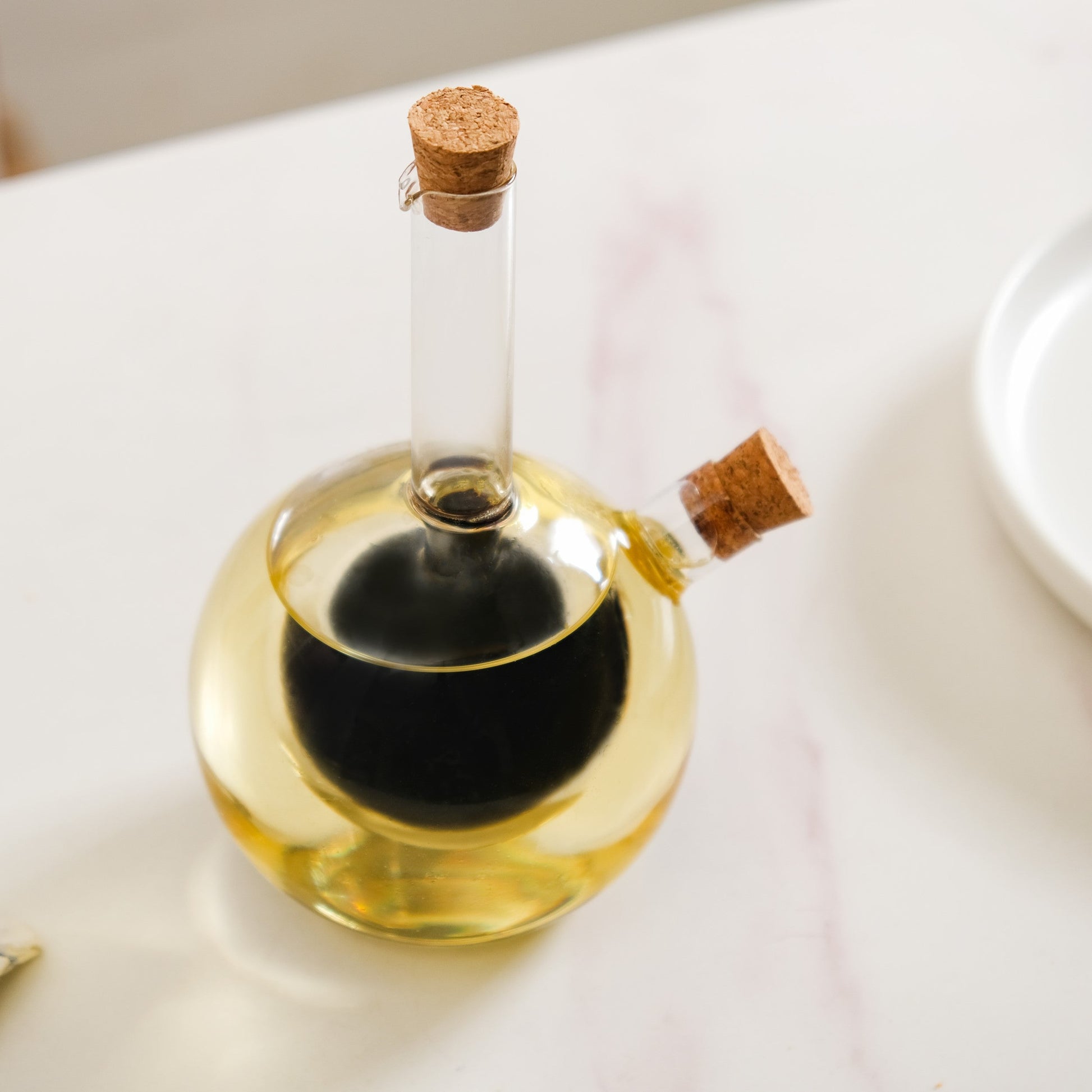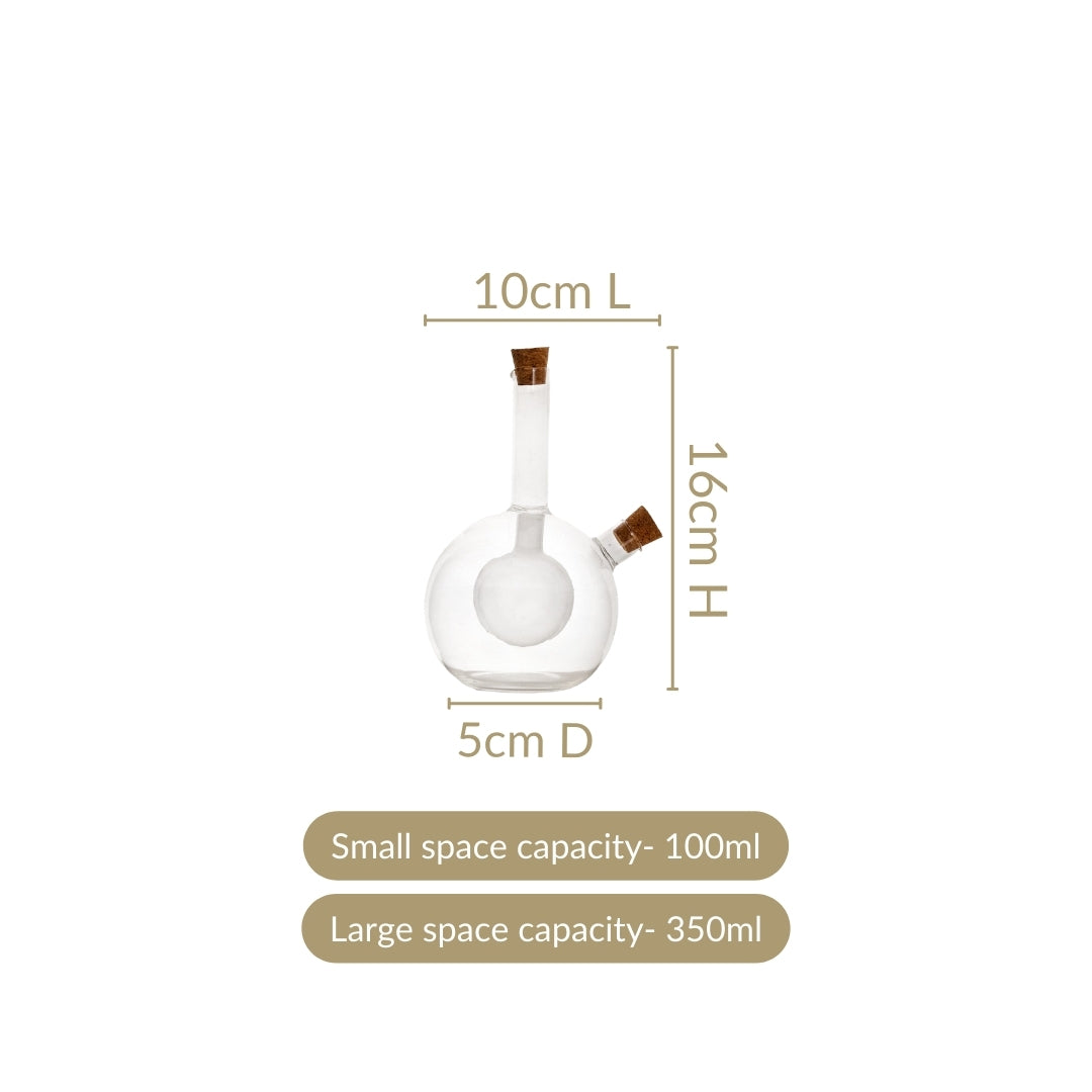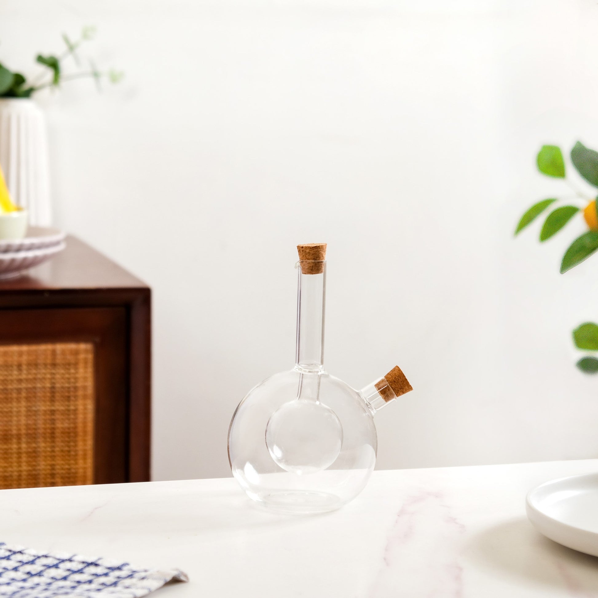 Design: This 2-in-1 dispenser features a smart dual-chamber build. An outer chamber for oil and an inner core for vinegar. Its modern silhouette combines a long curved spout at the top with a shorter side spout, designed for controlled, mess-free pouring. Both openings are topped with cork stoppers that preserve freshness while adding a warm, rustic detail. Crafted from clear borosilicate glass, the rounded form and transparent build highlight the layered liquids inside, making it as visually striking as it is functional.