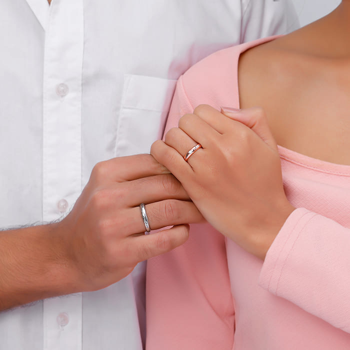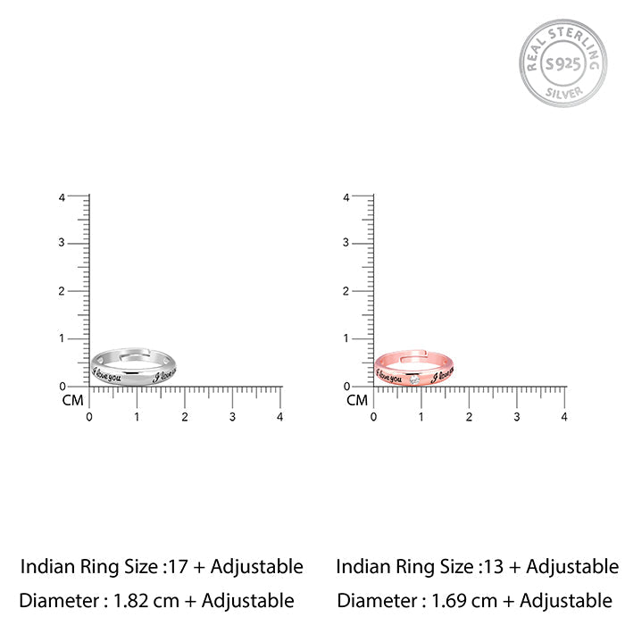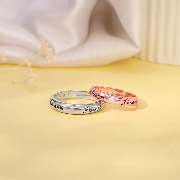 These silver and rose gold couple bands feature the phrase "I love you" engraved on both. The men's silver band has a plain design while the female rose gold band features a zircon.