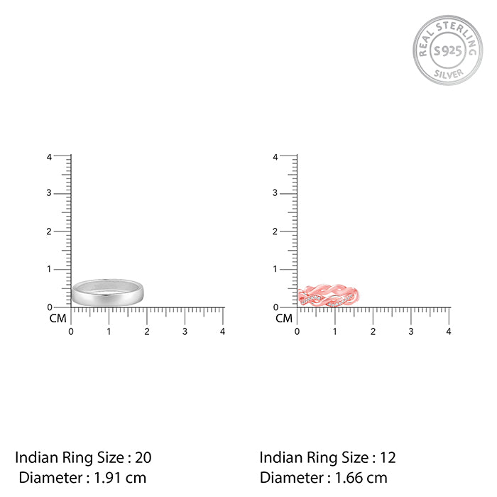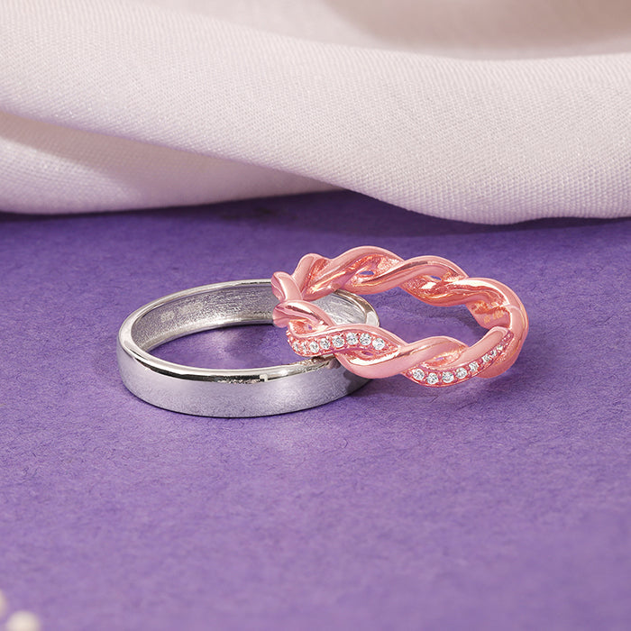 These silver and rose gold couple bands feature a plain, sleek band for men, while the female band is a twisted design set with zircons.