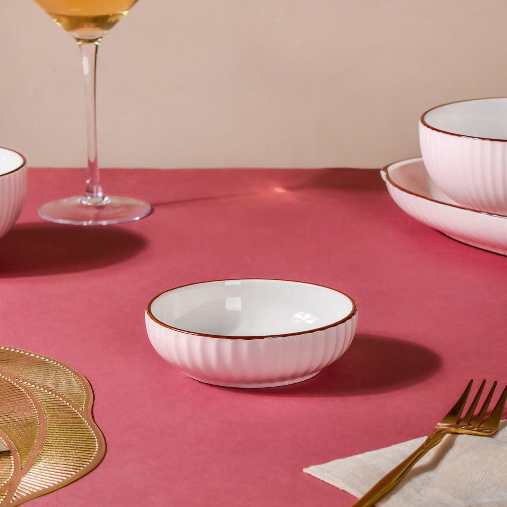 Deep tiny plate with a ceramic finish and textures on the surface, ideal for being used as a side plate. The ceramic bowls have a depth to them and are suitable for use as snack bowls, fruit bowls, or nut bowls. The plates' modern shapes and colours make them stand out in all sorts of table settings - be it formal or informal. The ramekin is best used to serve small portion meals like popcorn or chips during snack time. The product is microwave-friendly, dishwasher safe, and can be used in an oven as well. The small plate has a brown rim which increases the appeal factor and is available in 2 pleasing shades - turqouise and light pink.
