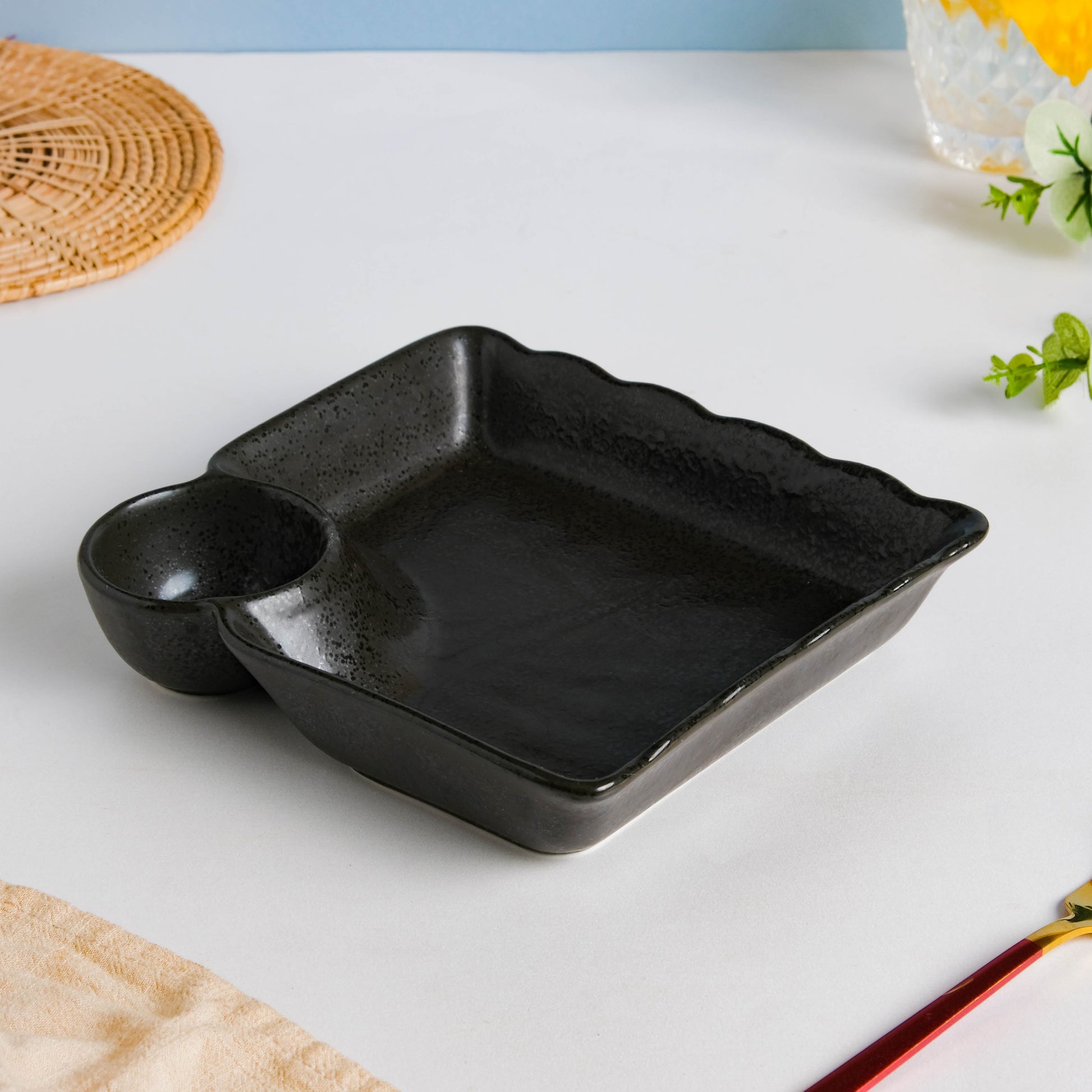 The textured ceramic matte black dip plate is a chip and dip star of any hangout session with friends. The square-shaped snack plate with a wavy rim has an attached dip bowl and is fashioned with a texture over an overlay of black. The sectioned plate is perfect for plating hot and fresh fish and chips with tartare sauce.