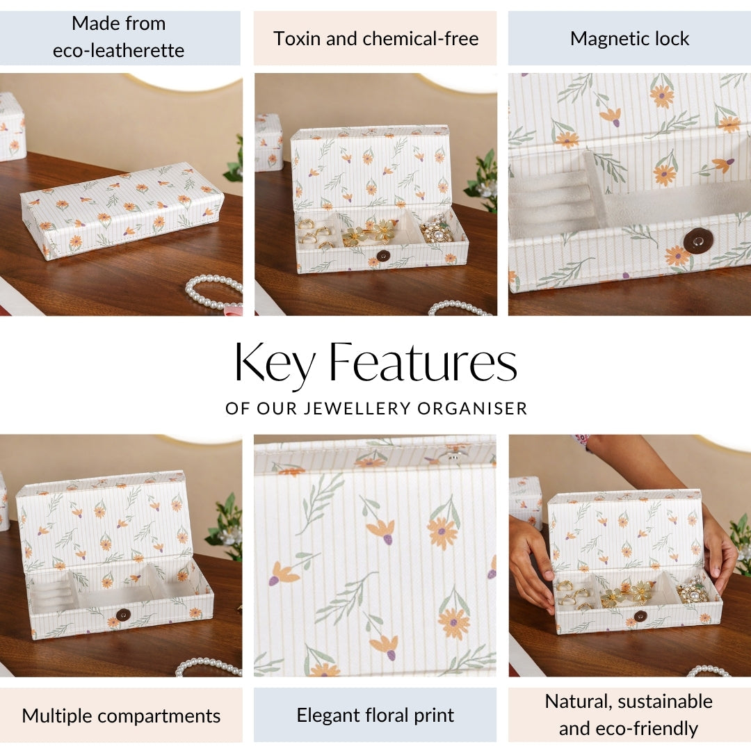 Design: Wrapped in a soft cream base with vertical golden stripes, this jewellery box is adorned with delicate, floral motifs in cheerful shades of orange, green, and plum. The daisy-inspired blooms lend a warm, vintage charm that’s both playful and timeless. Inside, the thoughtful layout features five cushioned ring rolls, two square compartments, and one spacious section, perfectly designed to organise rings, earrings, chains, and tiny keepsakes. A built-in mirror and a ribbon pull-tab add convenience and functionality to the design.