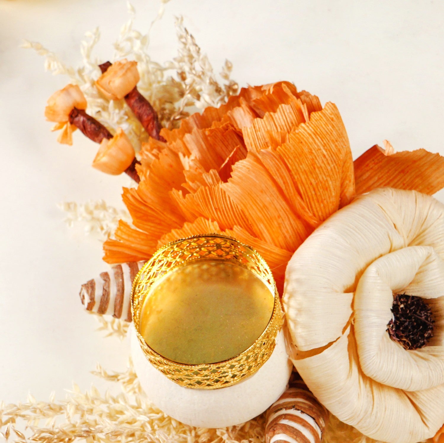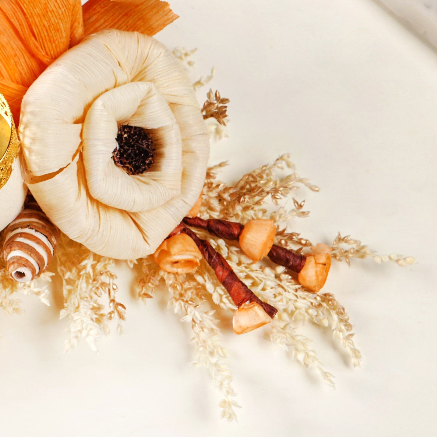 Design: The design features two prominent flowers made of sola pith and corn husk, one in a creamy off-white hue and the other in a vibrant orange, creating a striking colour contrast that adds warmth and visual appeal. These delicate flowers are artfully arranged on a base of naturally dried leaves, providing a rustic yet refined aesthetic. Further enhancing the natural theme are small, mushroom-like floral adornments made from sola and corn husk, adding whimsical detail. A small, ornate gold-colored sheet metal tealight holder with intricate cutwork is nestled among the flowers and foliage, ready to hold a candle.