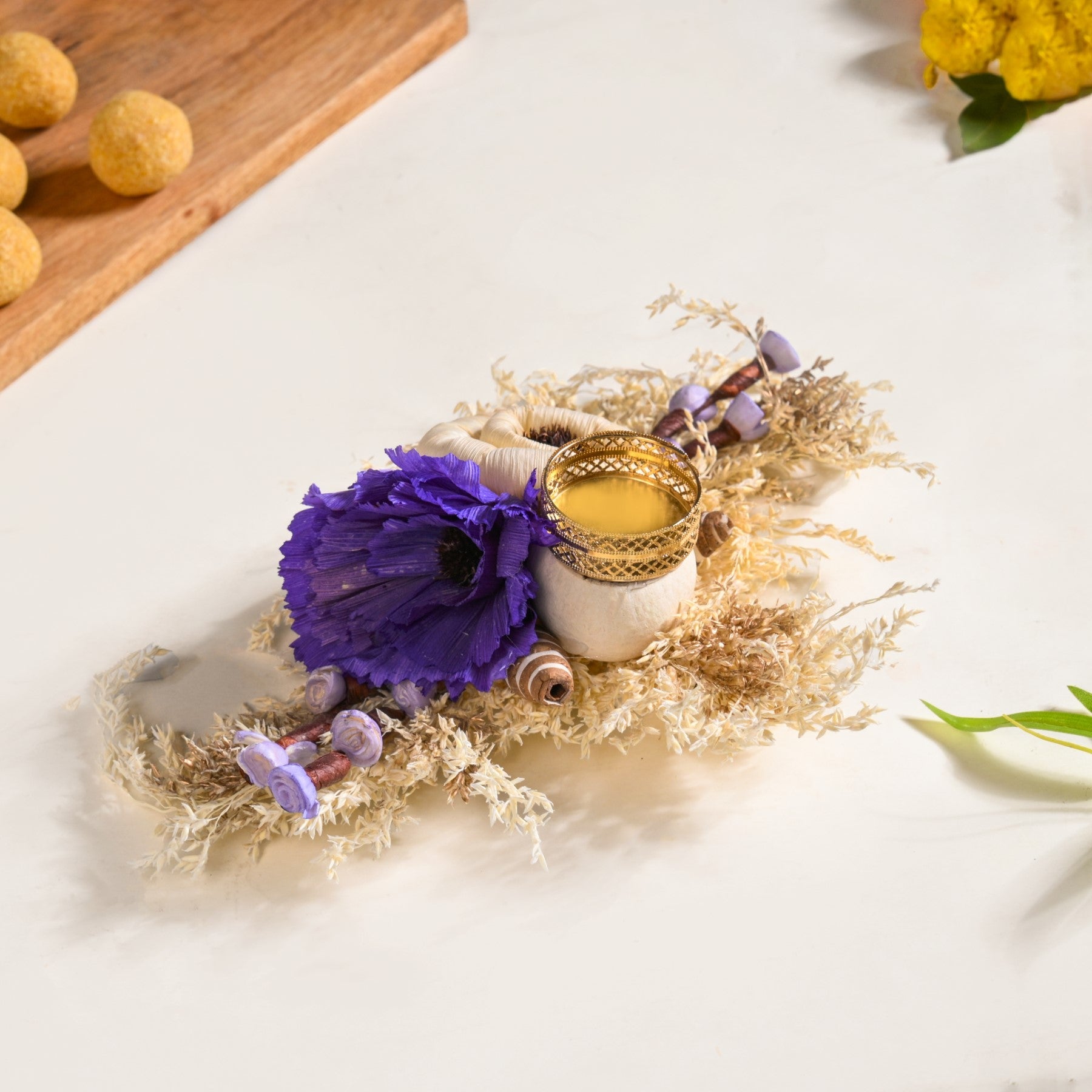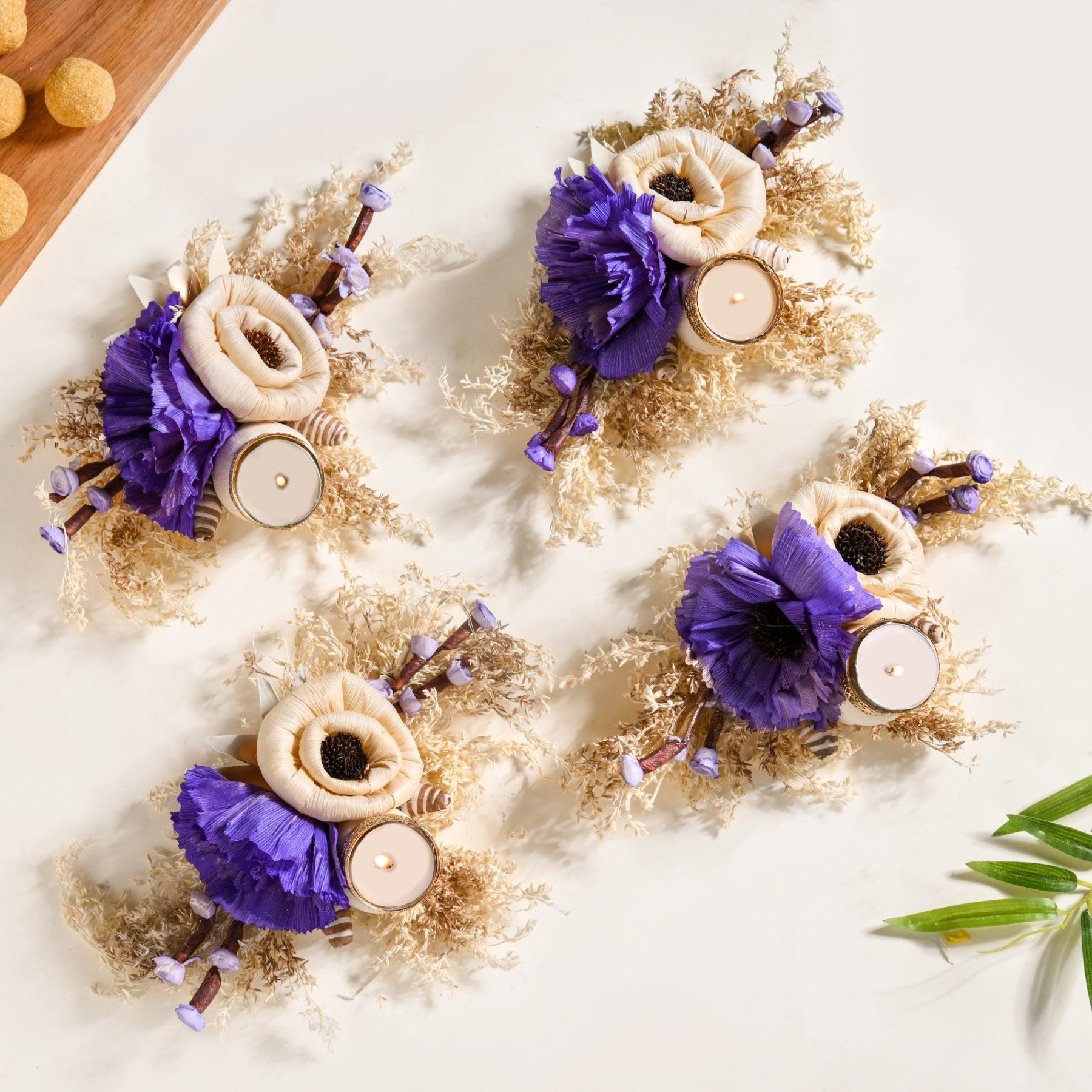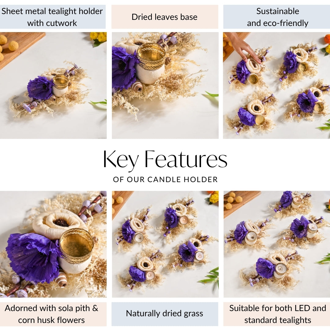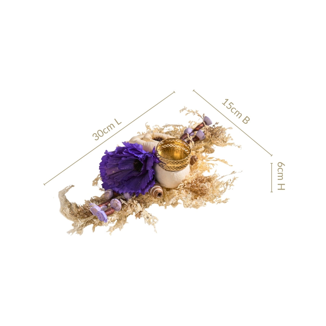 Design: This tealight holder features two prominent flowers, made of sola pith and corn husk, one in a classic creamy off-white and another in a rich, regal purple, offering a sophisticated colour palette that exudes charm and elegance. These meticulously crafted flowers are nestled upon a bed of naturally dried leaves, forming a rustic yet refined foundation. Adding to its unique allure are charming, mushroom-like floral accents crafted from sola and corn husk, lending a touch of whimsical natural beauty. A delicate, ornate gold-colored sheet metal tealight holder with intricate cutwork is gracefully integrated among the floral arrangement, poised to illuminate your space.