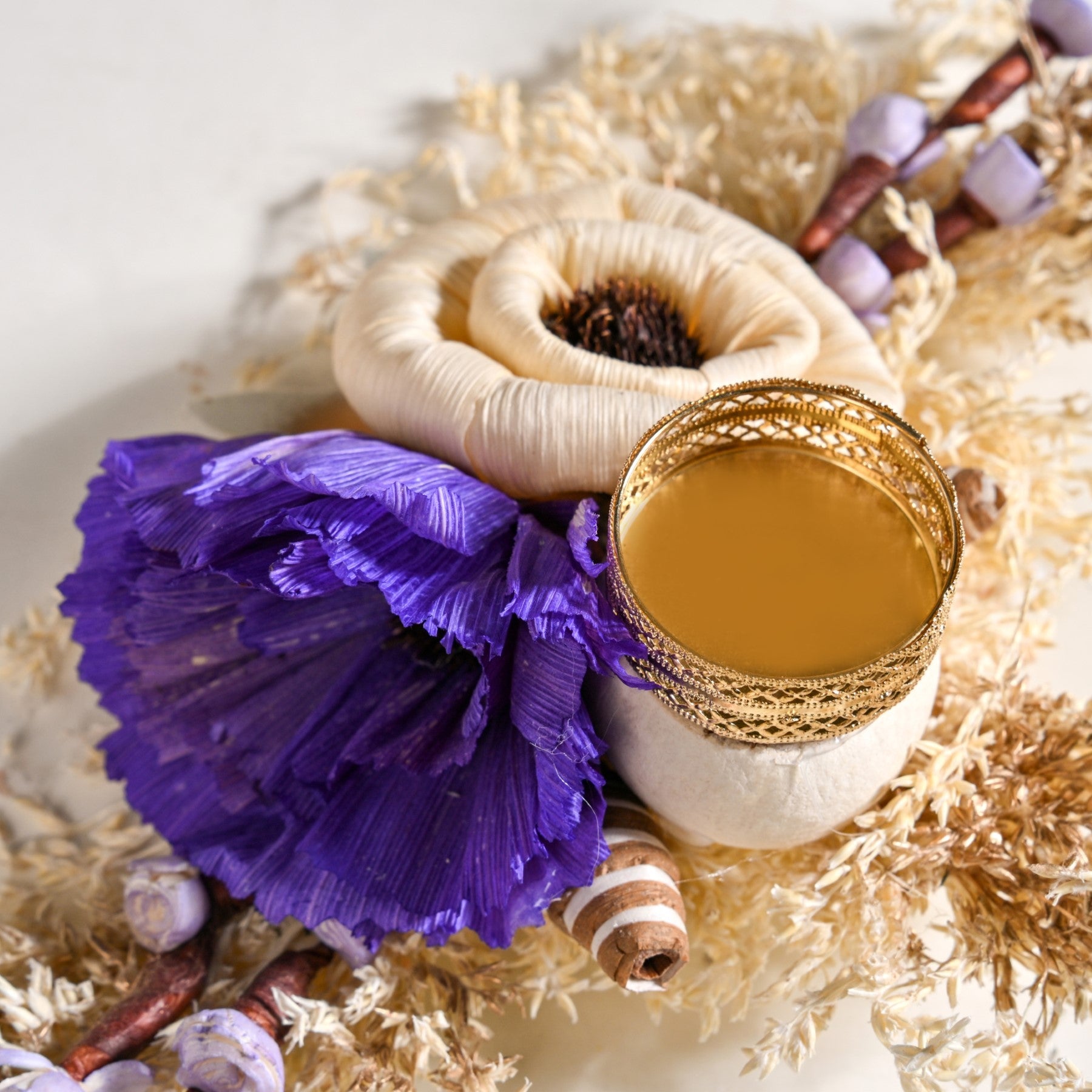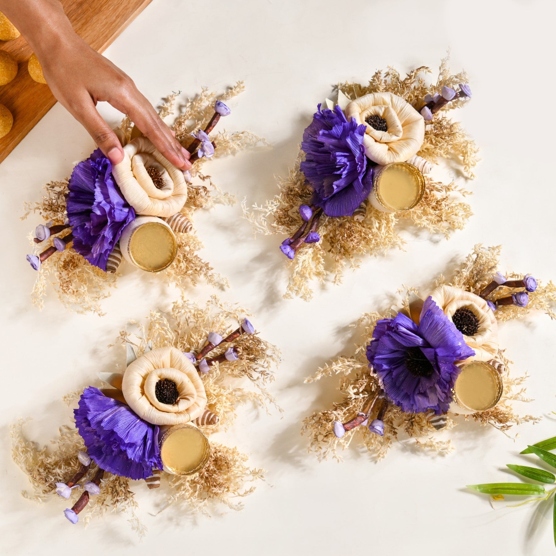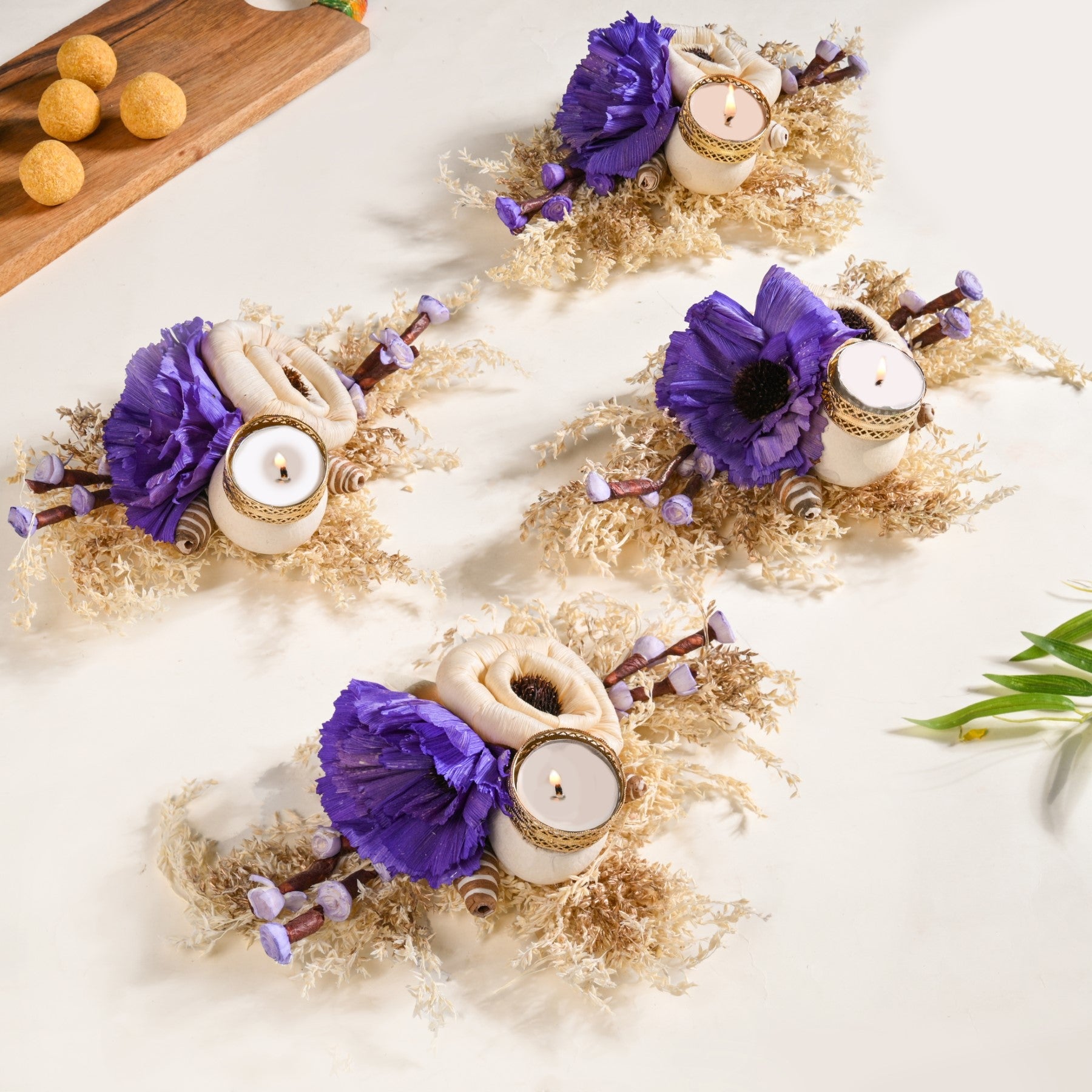 Design: This tealight holder features two prominent flowers, made of sola pith and corn husk, one in a classic creamy off-white and another in a rich, regal purple, offering a sophisticated colour palette that exudes charm and elegance. These meticulously crafted flowers are nestled upon a bed of naturally dried leaves, forming a rustic yet refined foundation. Adding to its unique allure are charming, mushroom-like floral accents crafted from sola and corn husk, lending a touch of whimsical natural beauty. A delicate, ornate gold-colored sheet metal tealight holder with intricate cutwork is gracefully integrated among the floral arrangement, poised to illuminate your space.