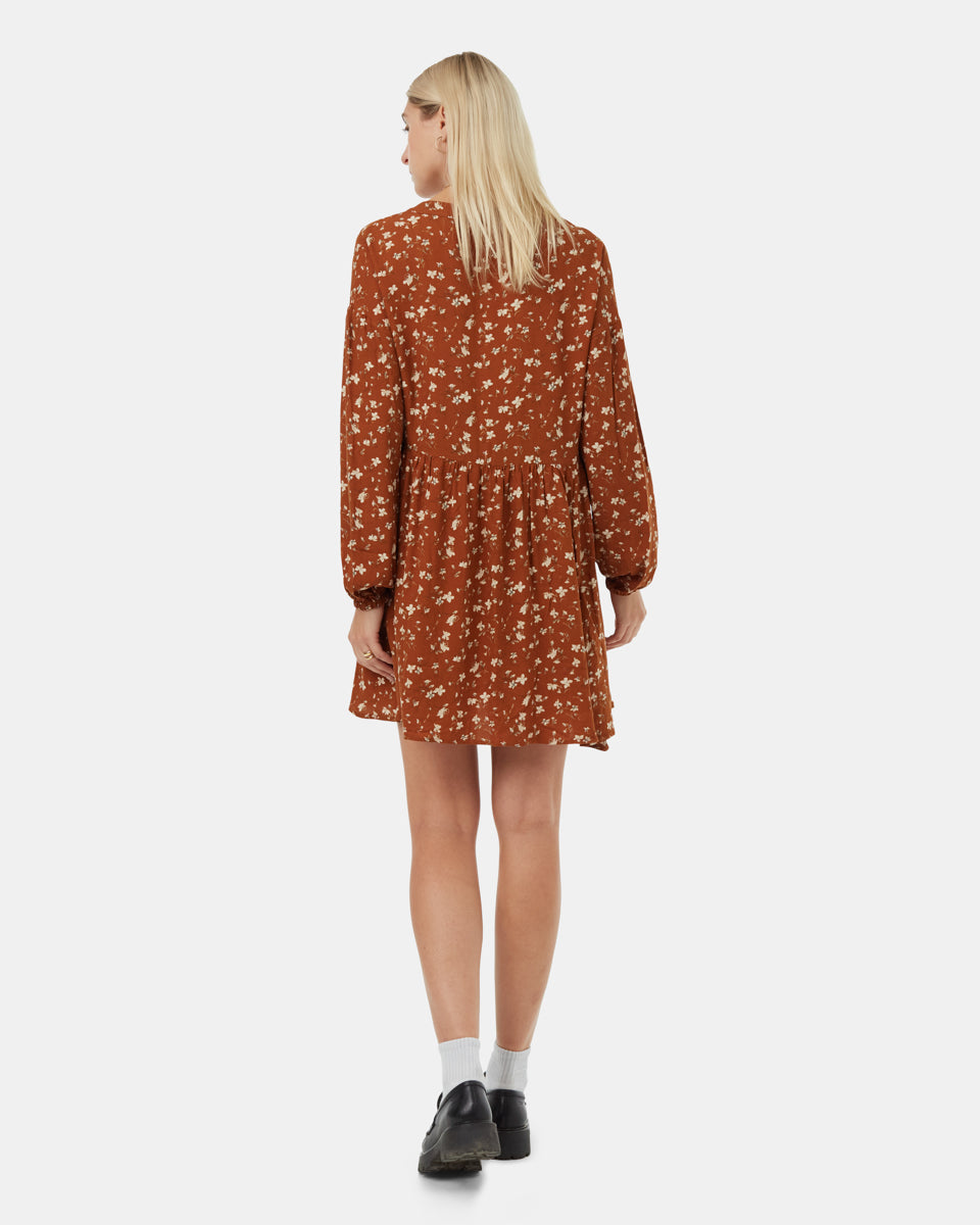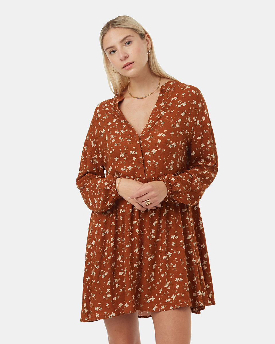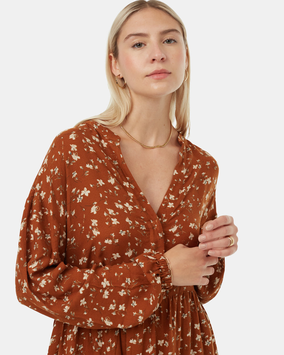 With a flattering v-neck and seasonal palette, this long sleeve dress adds a sophisticated touch to your layered autumn look.