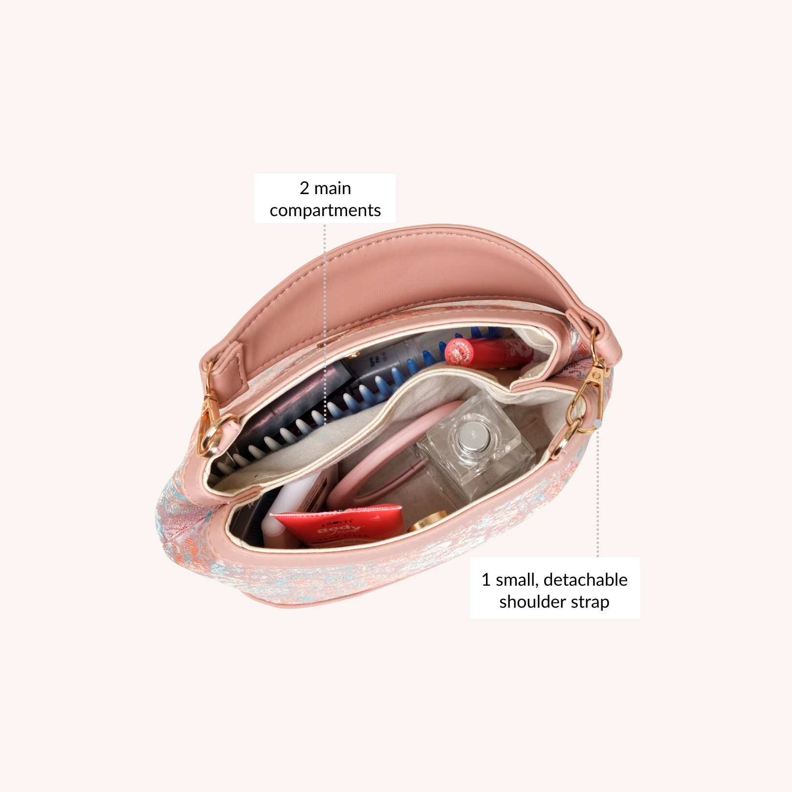 Design: Crafted from luxurious PU leather, the Eden boasts a sophisticated pink frame that effortlessly captures attention. The intricate jacquard floral motif, featuring a delicate colour palette exudes feminine elegance while adding a refreshing touch. The bag’s gold hardware detailing enhances its elegance, while the soft canvas inner lining provides a gentle touch and durability. With two main compartments secured by a convenient magnetic button closure, this bucket handbag keeps your belongings organized. The detachable strap provide versatile carrying options, allowing you to carry it as a bucket bag or as a chic clutch.