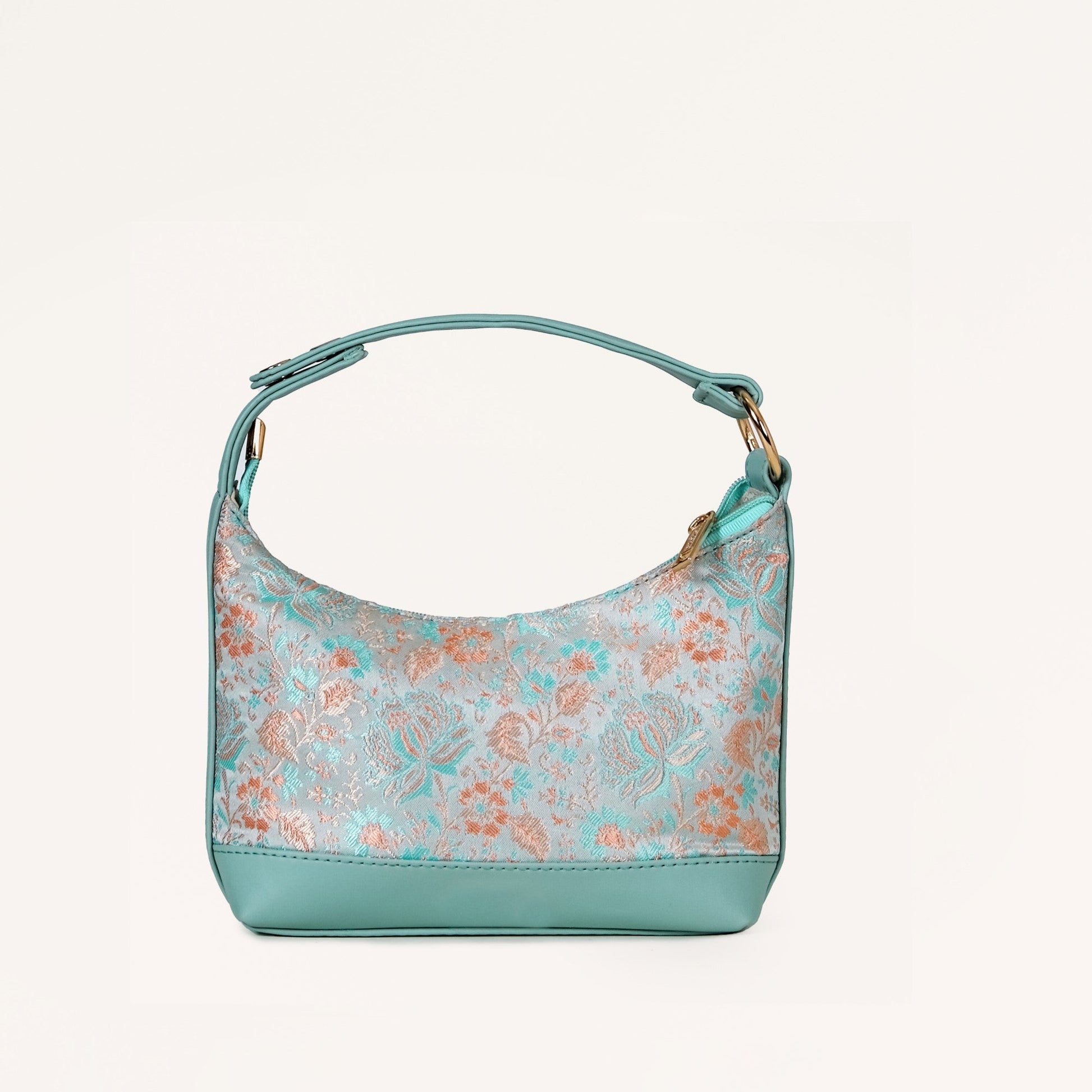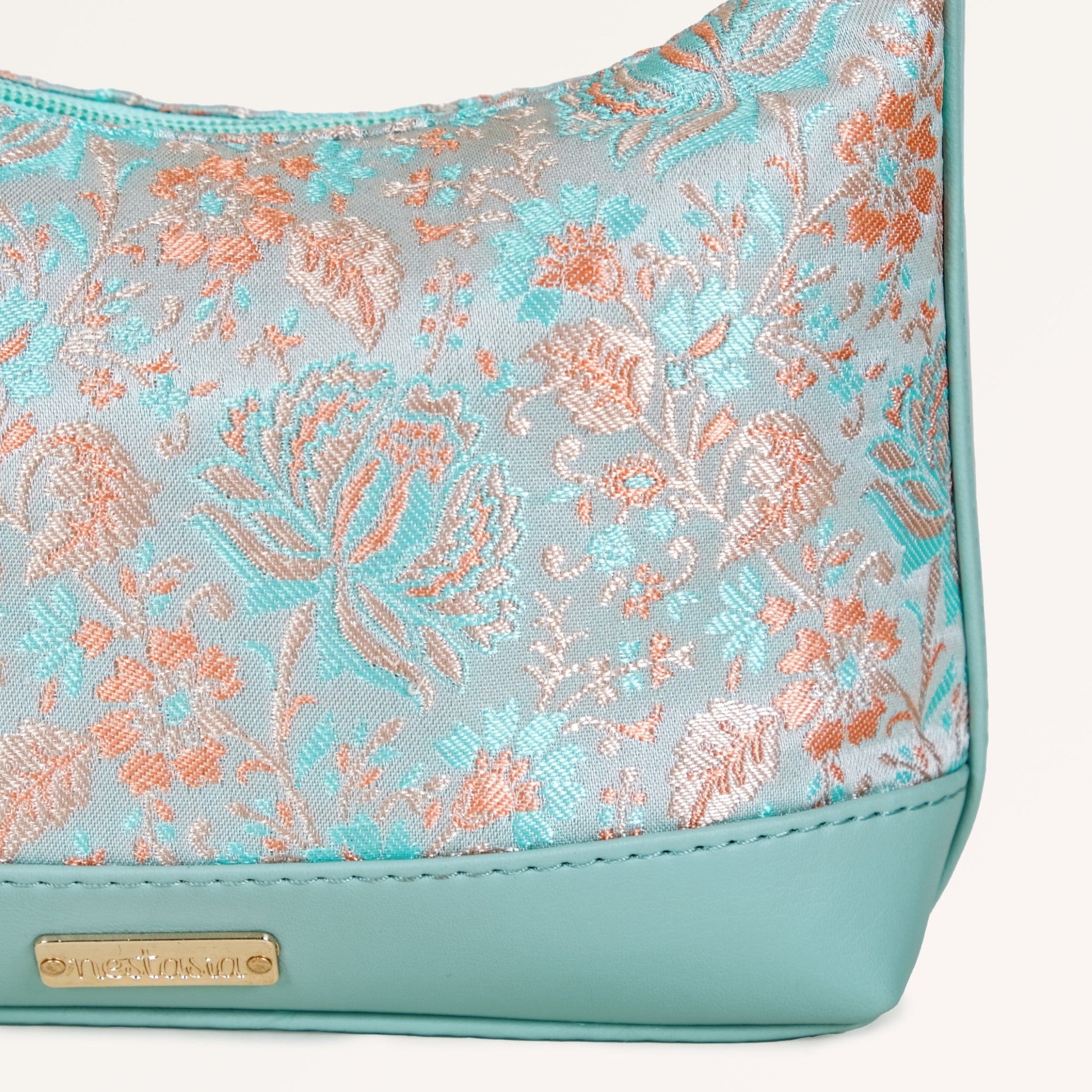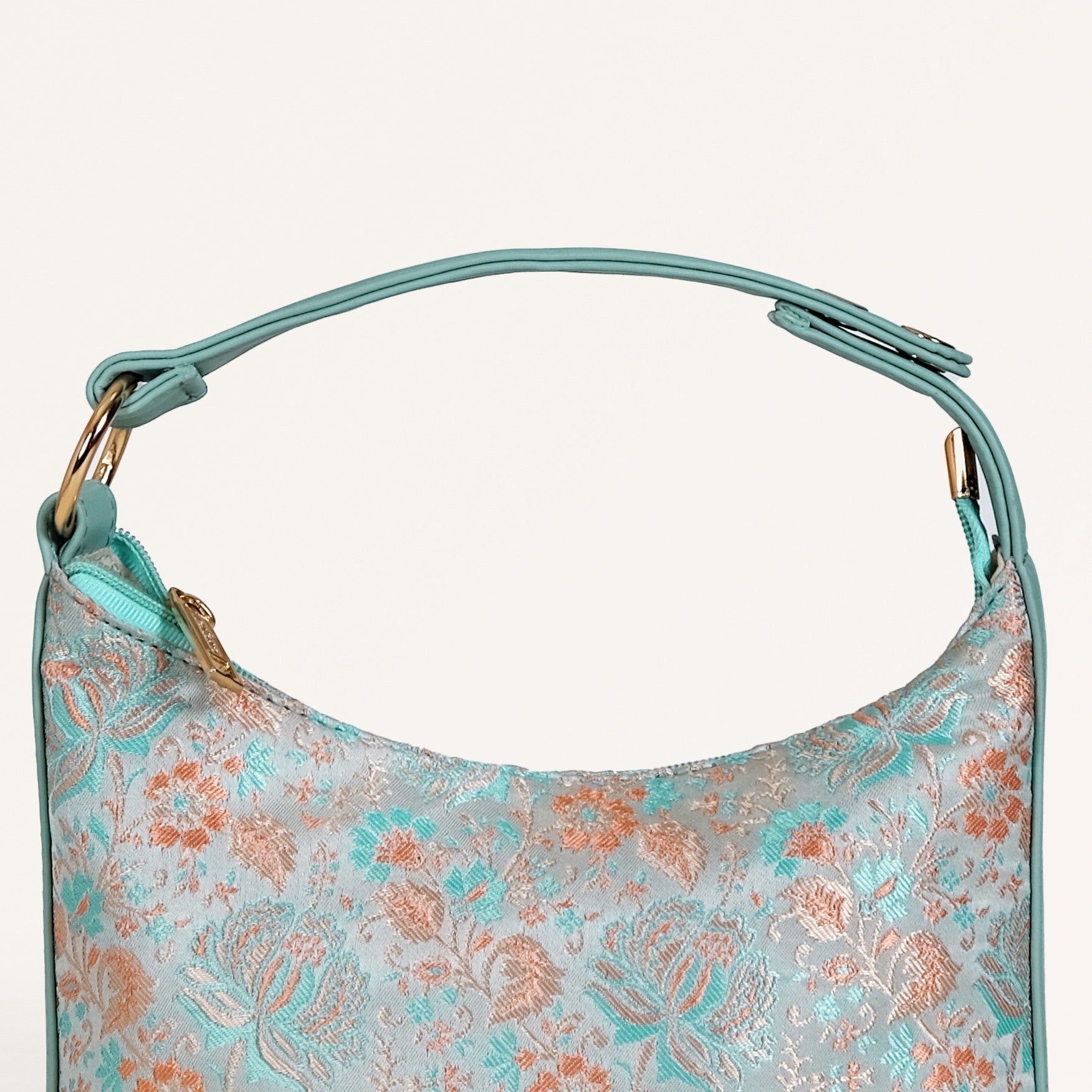 Design: Meticulously handcrafted to showcase artisanal finesse, the Eden shoulder bag is a must-have fashion accessory. Showcasing a stunning mint green frame that is complemented by an intricate floral motif in a vibrant palette, this bag exudes sophistication and artistic flair. Inside, you'll find a soft canvas lining that provides durability and keeps your essentials safe while on the go. The thoughtful design features one main compartment, along with a spacious interior side pocket for organization. A smooth zipper system ensures easy access, and the elegant gold hardware detailing adds a luxurious finish. The bag is completed with a small shoulder strap featuring a dual-button extension, allowing for a customizable fit to suit your style.