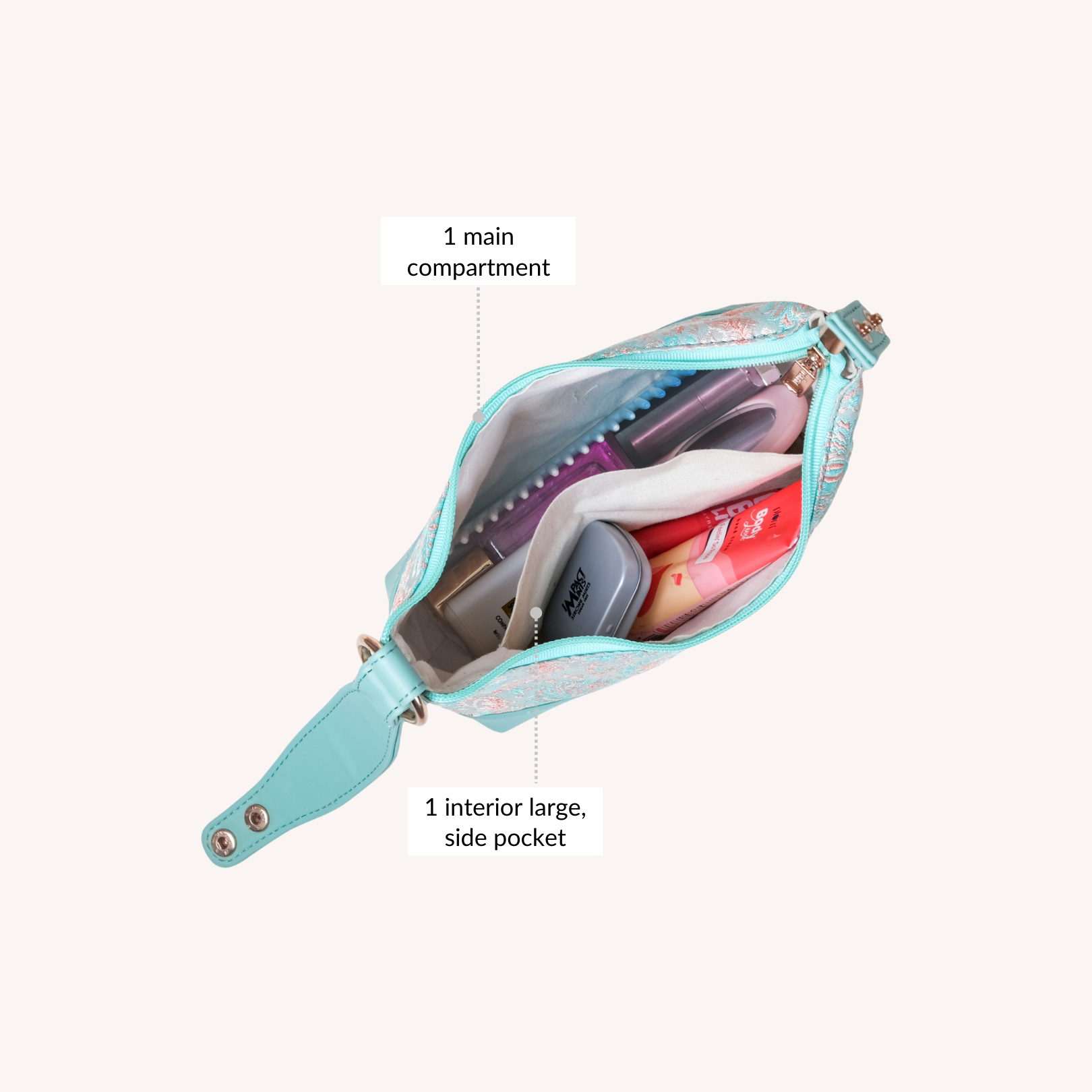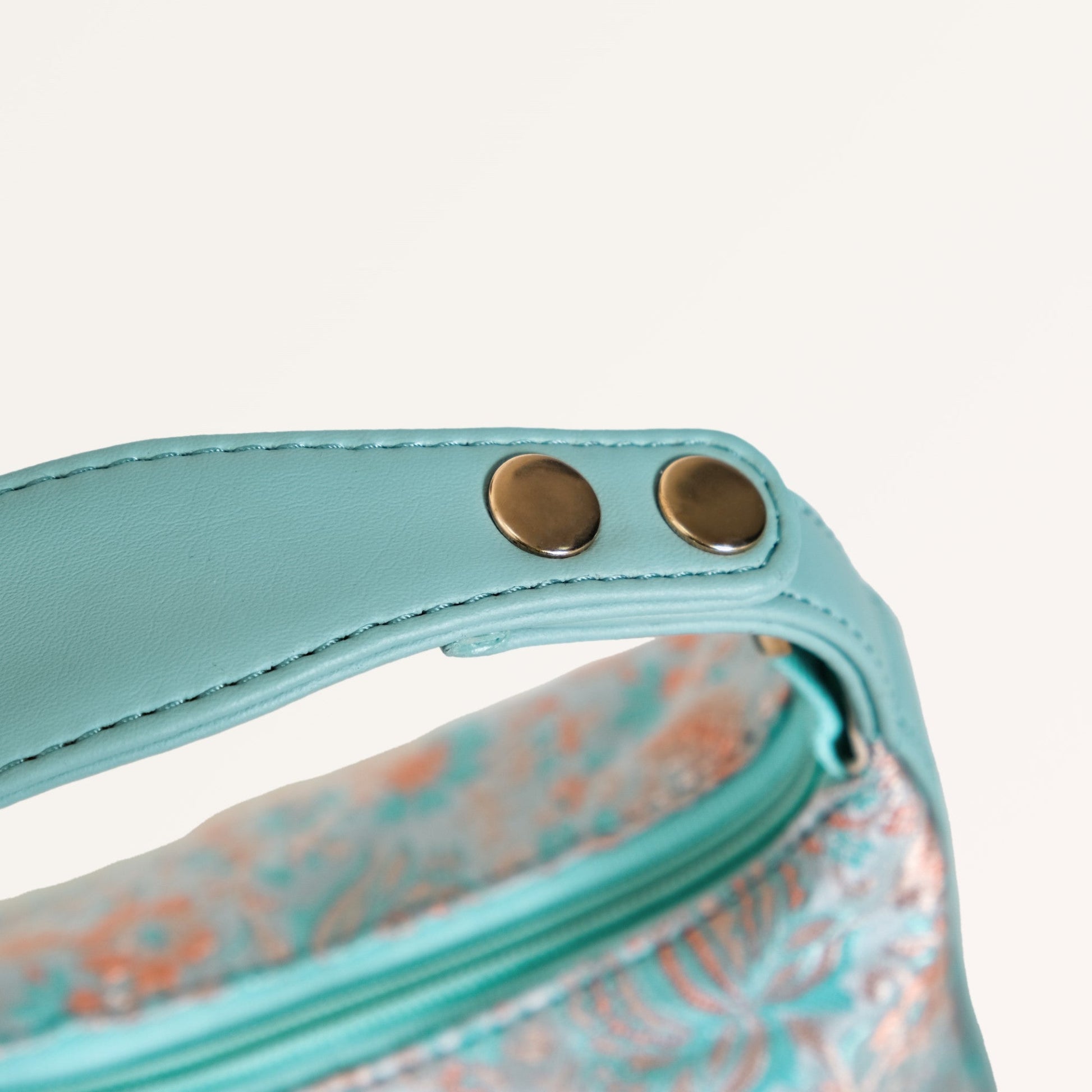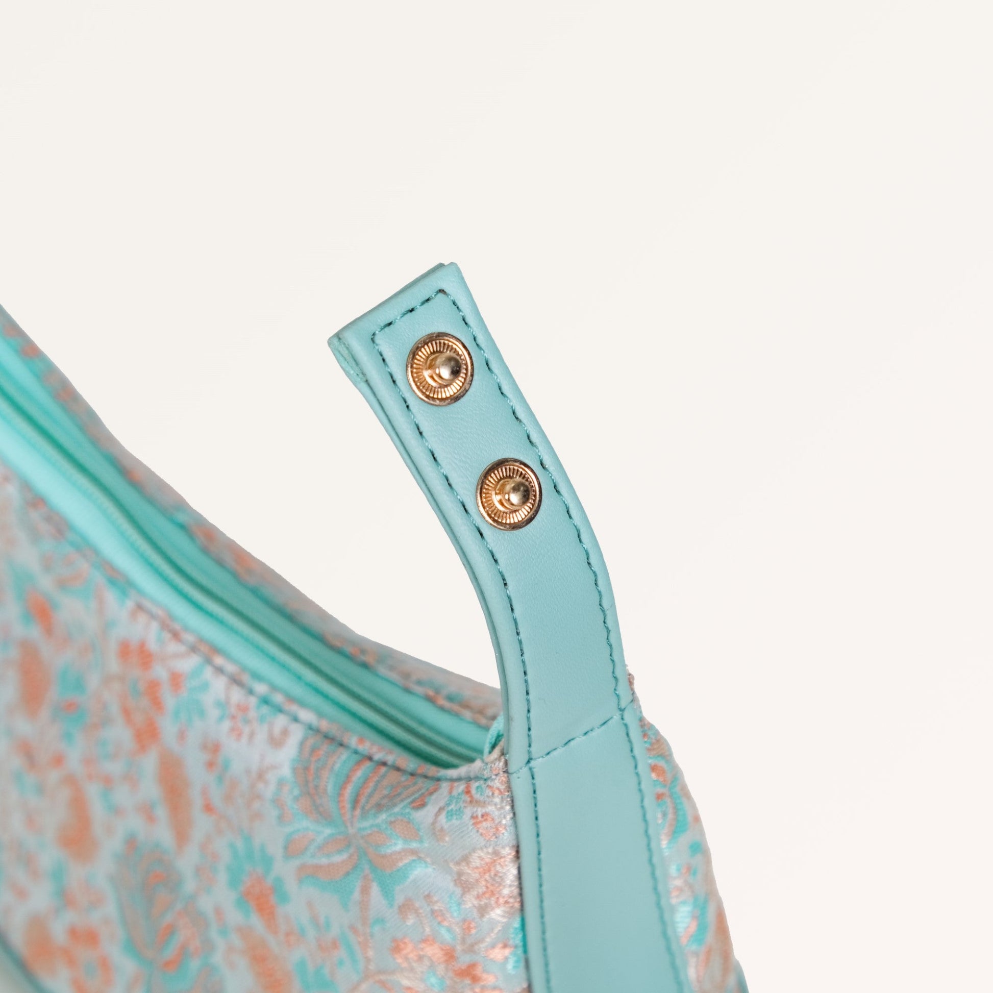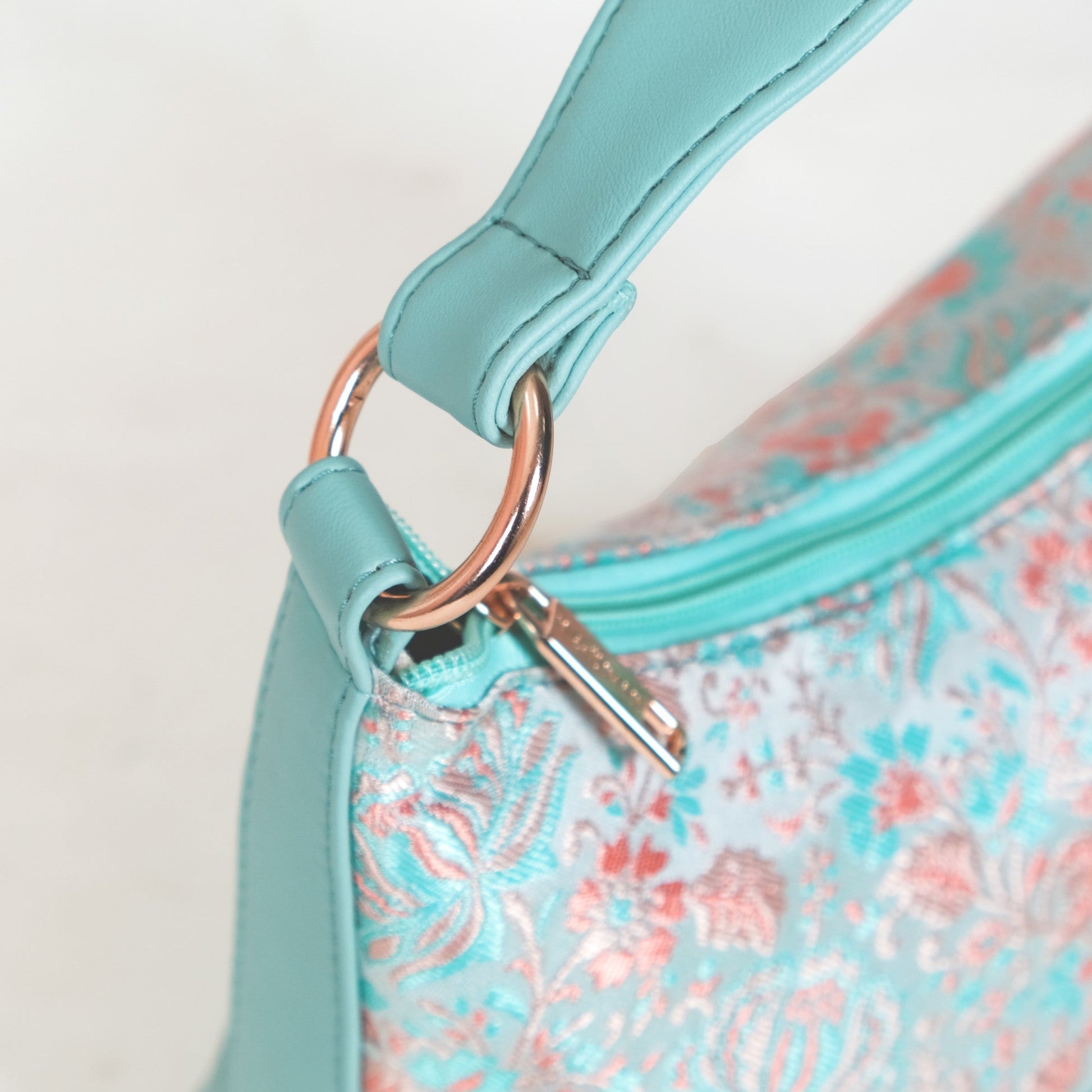 Design: Meticulously handcrafted to showcase artisanal finesse, the Eden shoulder bag is a must-have fashion accessory. Showcasing a stunning mint green frame that is complemented by an intricate floral motif in a vibrant palette, this bag exudes sophistication and artistic flair. Inside, you'll find a soft canvas lining that provides durability and keeps your essentials safe while on the go. The thoughtful design features one main compartment, along with a spacious interior side pocket for organization. A smooth zipper system ensures easy access, and the elegant gold hardware detailing adds a luxurious finish. The bag is completed with a small shoulder strap featuring a dual-button extension, allowing for a customizable fit to suit your style.