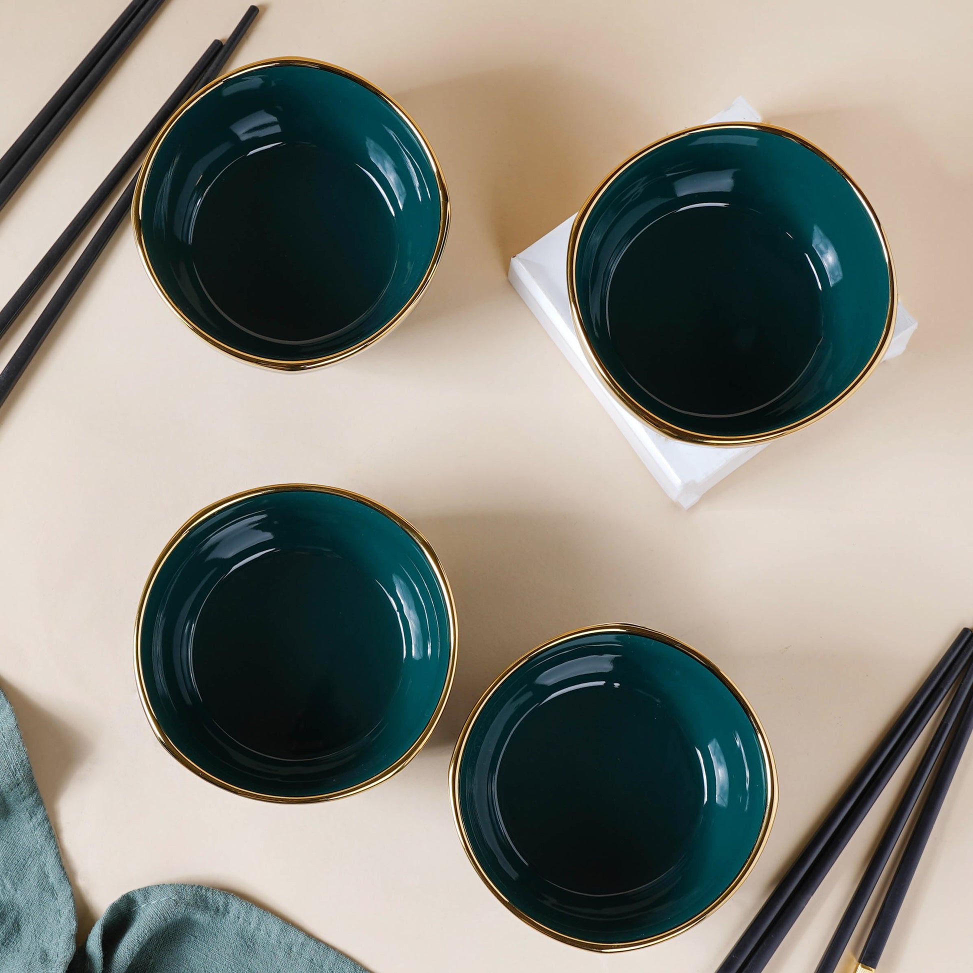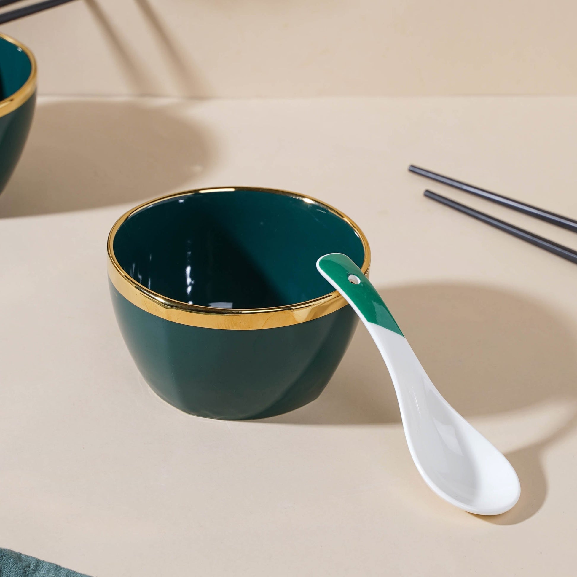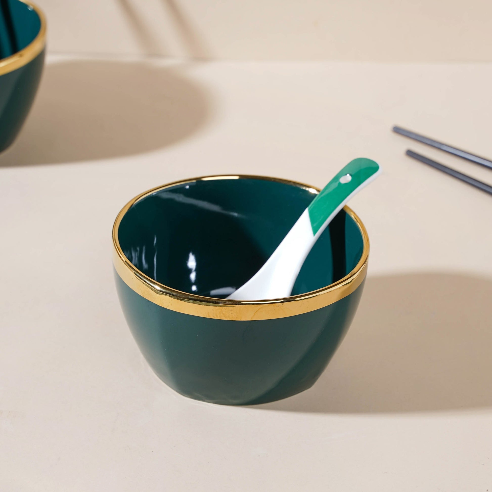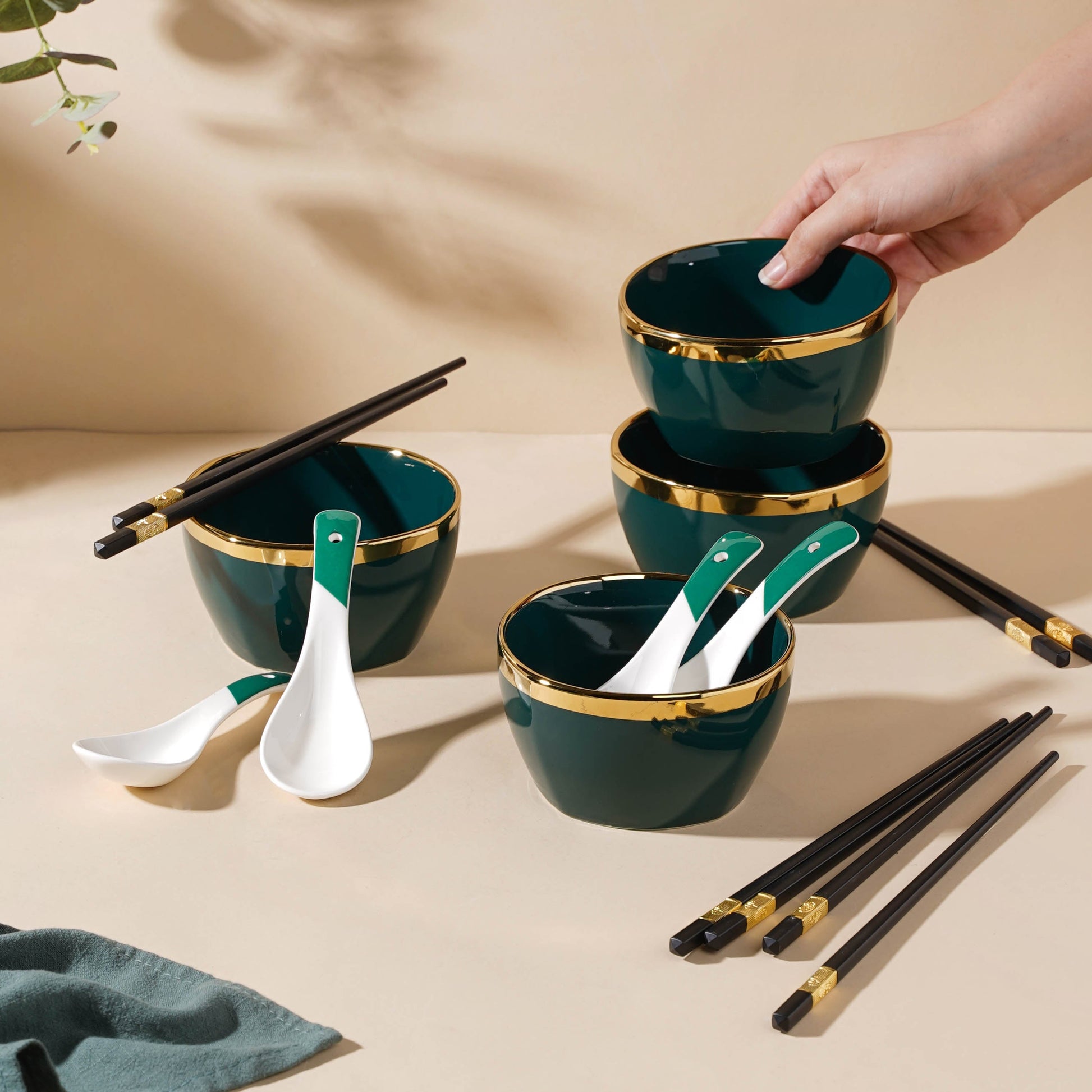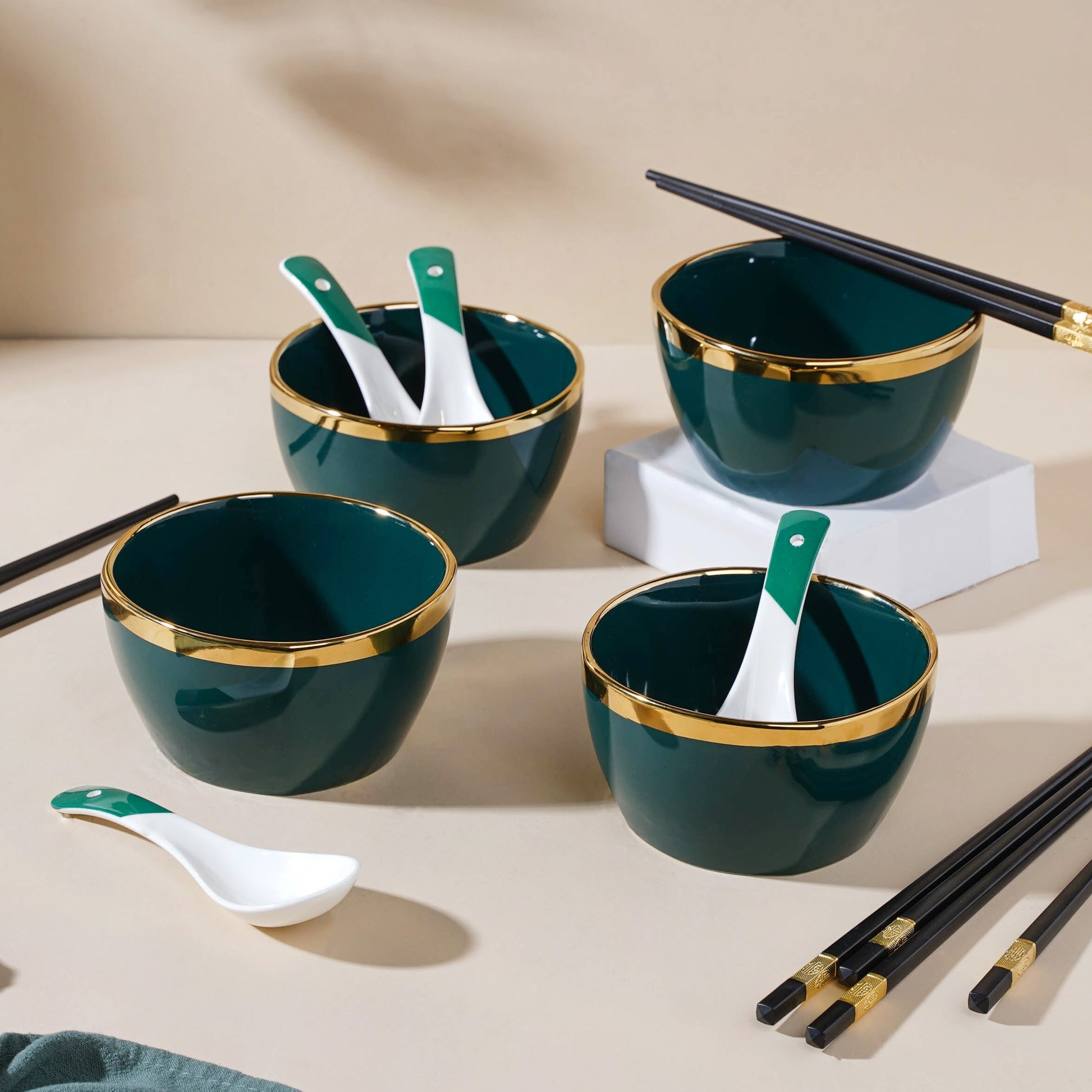 The set of 4 ceramic soup bowls features a glazed emerald finish and lustrous golden rim that graces the table with sophistication and luxe. The set comprising 4 soup spoons and 4 pairs of chopsticks makes the set ideal to be used as ramen bowls, bowls for snacks, and bowls for soup. The elaborate sheen and modern design of the bowl exudes elegance on the tabletop.