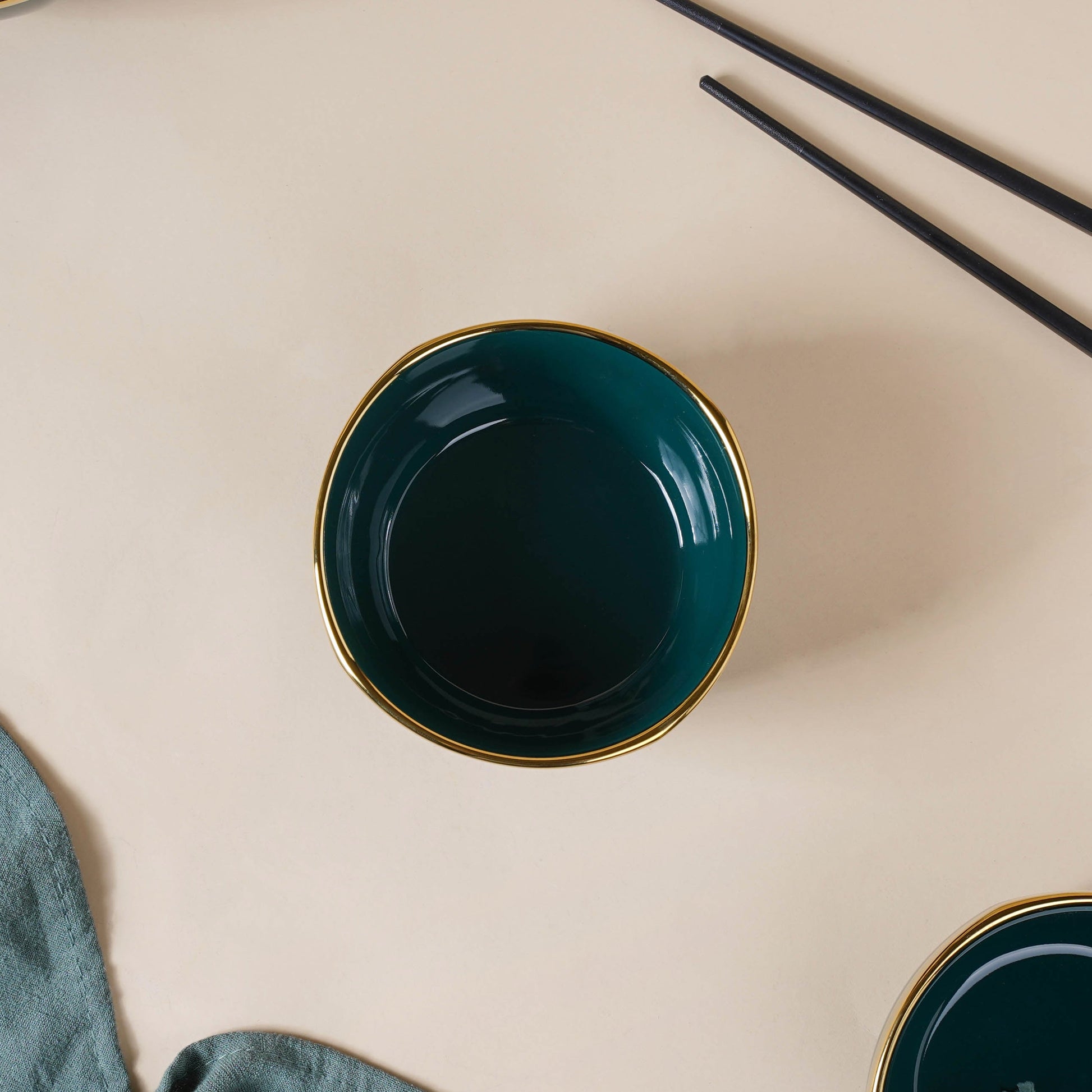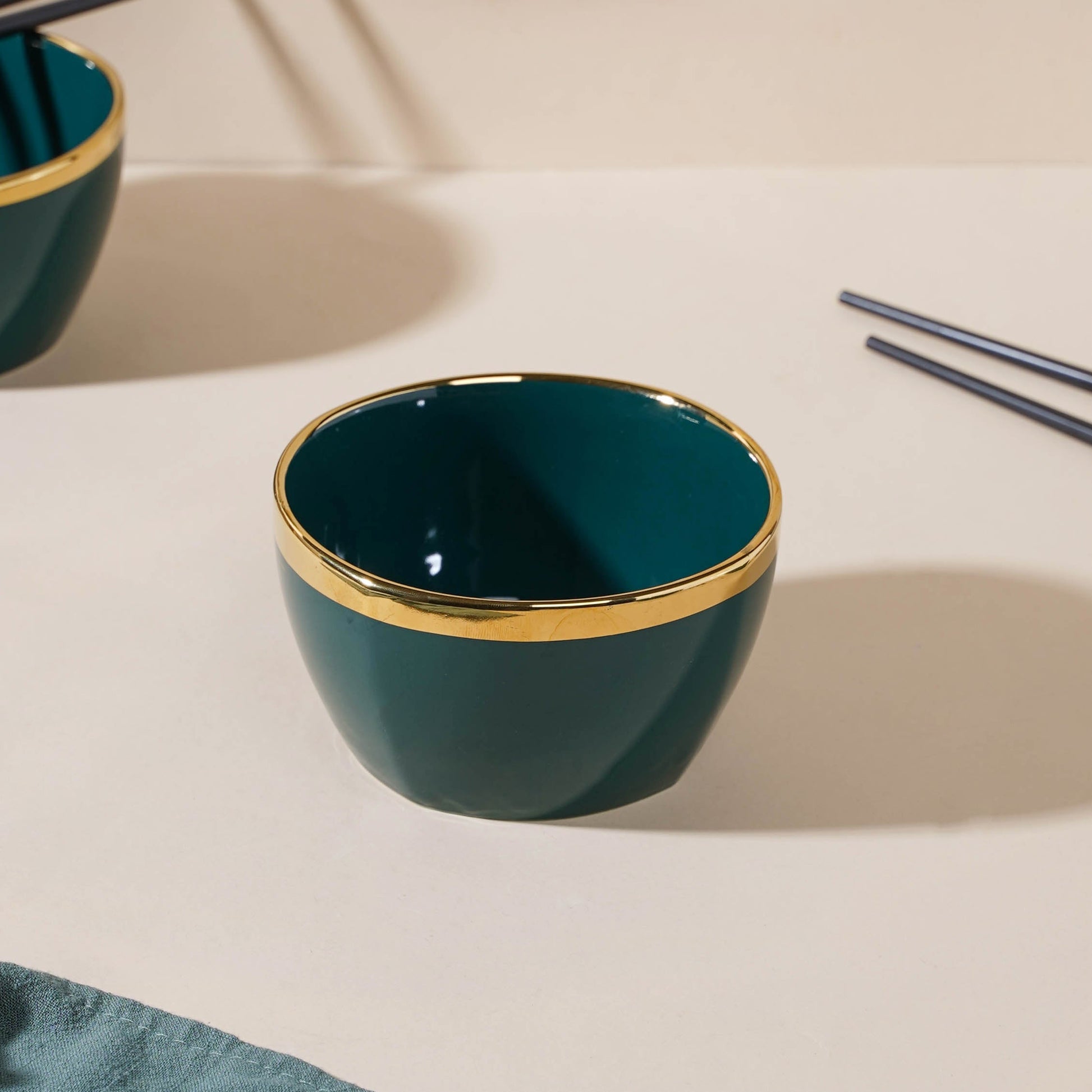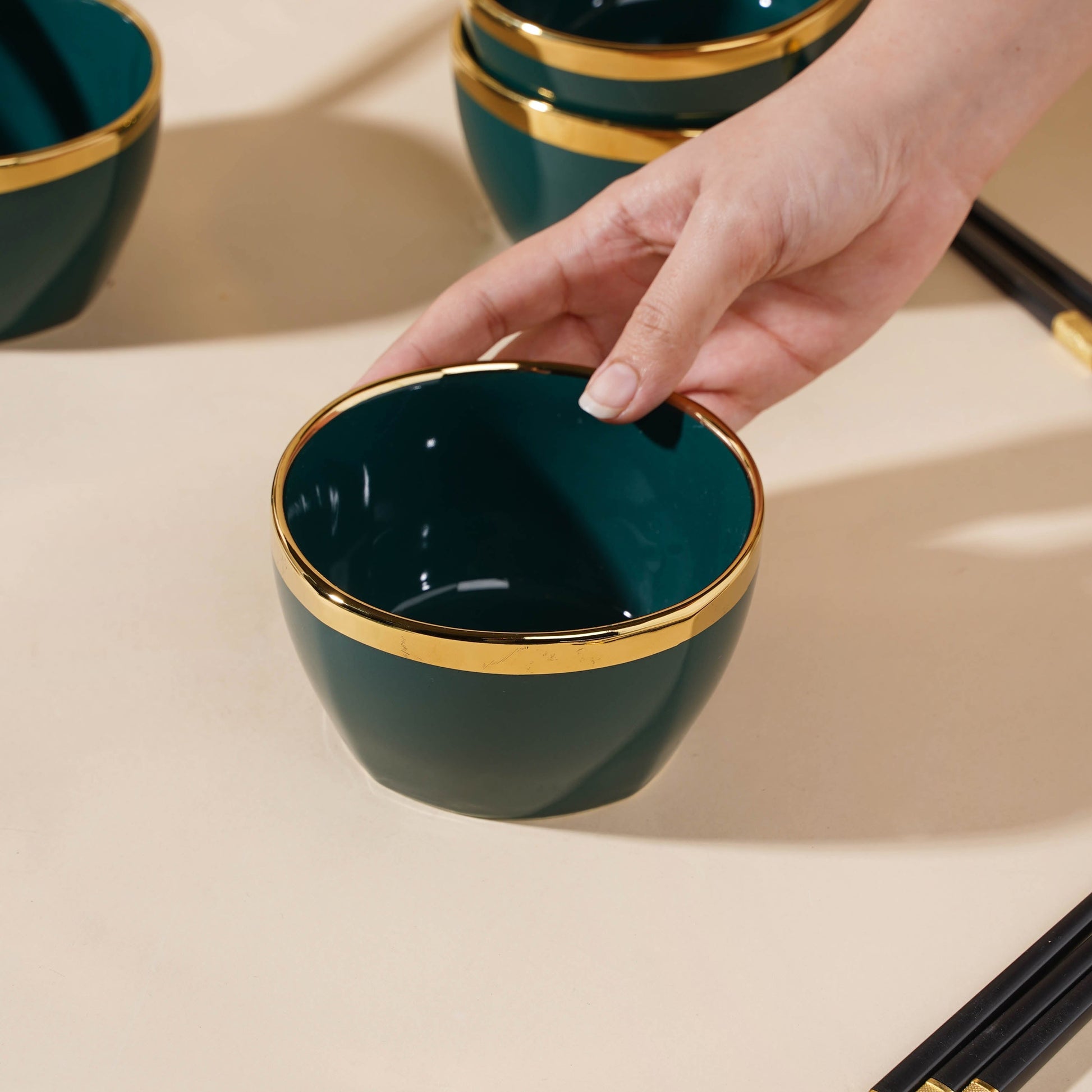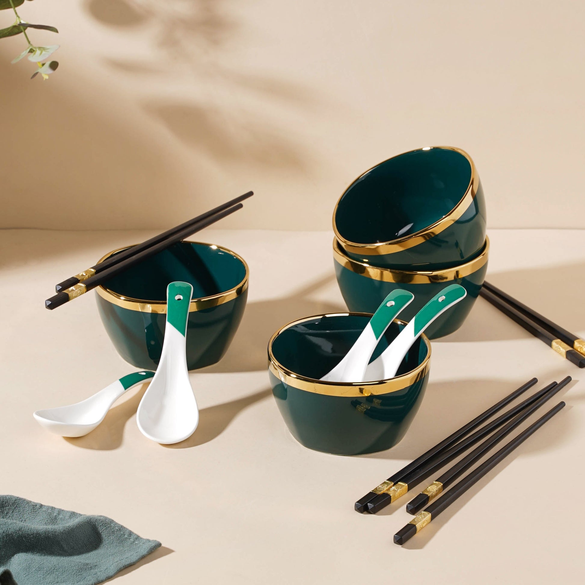 The set of 4 ceramic soup bowls features a glazed emerald finish and lustrous golden rim that graces the table with sophistication and luxe. The set comprising 4 soup spoons and 4 pairs of chopsticks makes the set ideal to be used as ramen bowls, bowls for snacks, and bowls for soup. The elaborate sheen and modern design of the bowl exudes elegance on the tabletop.