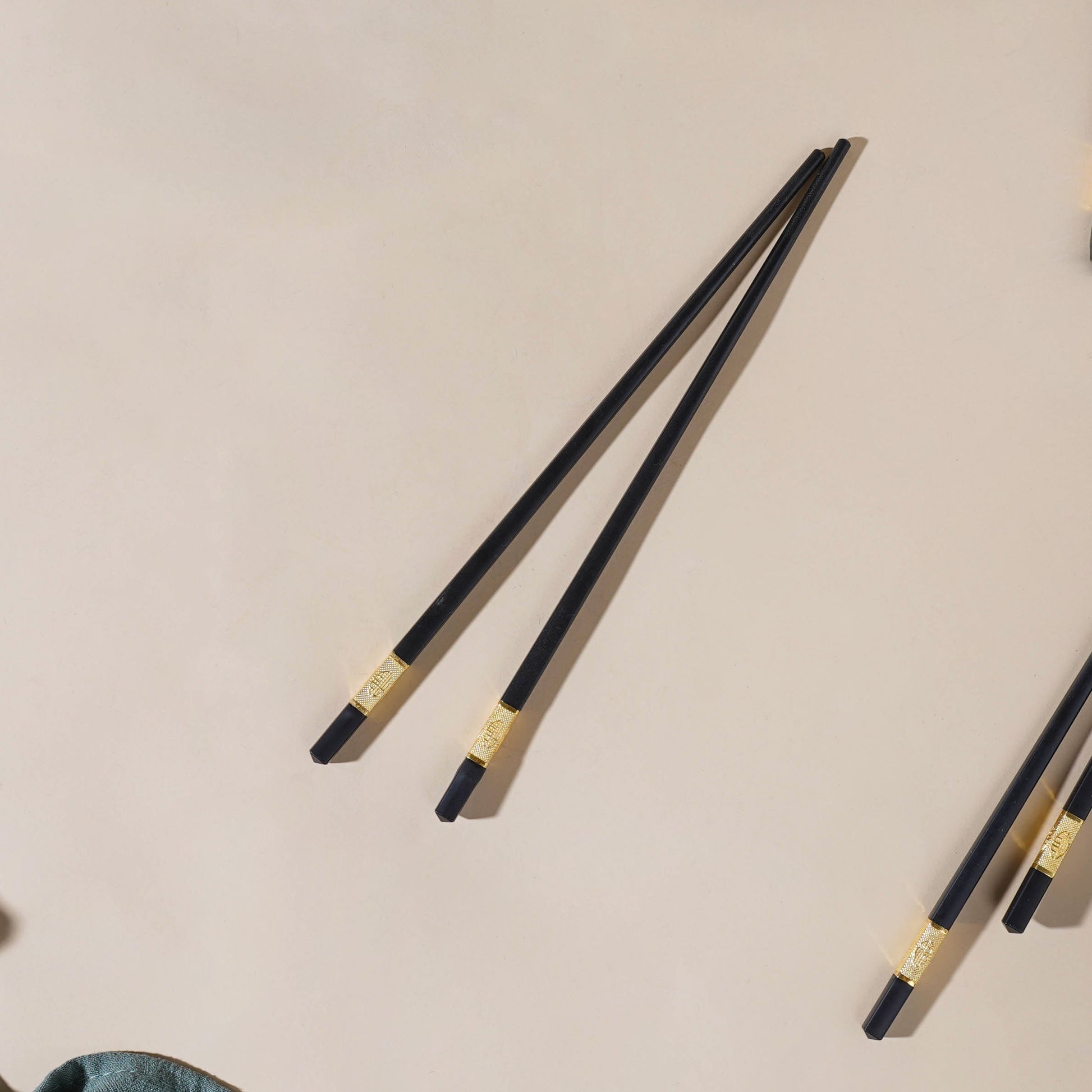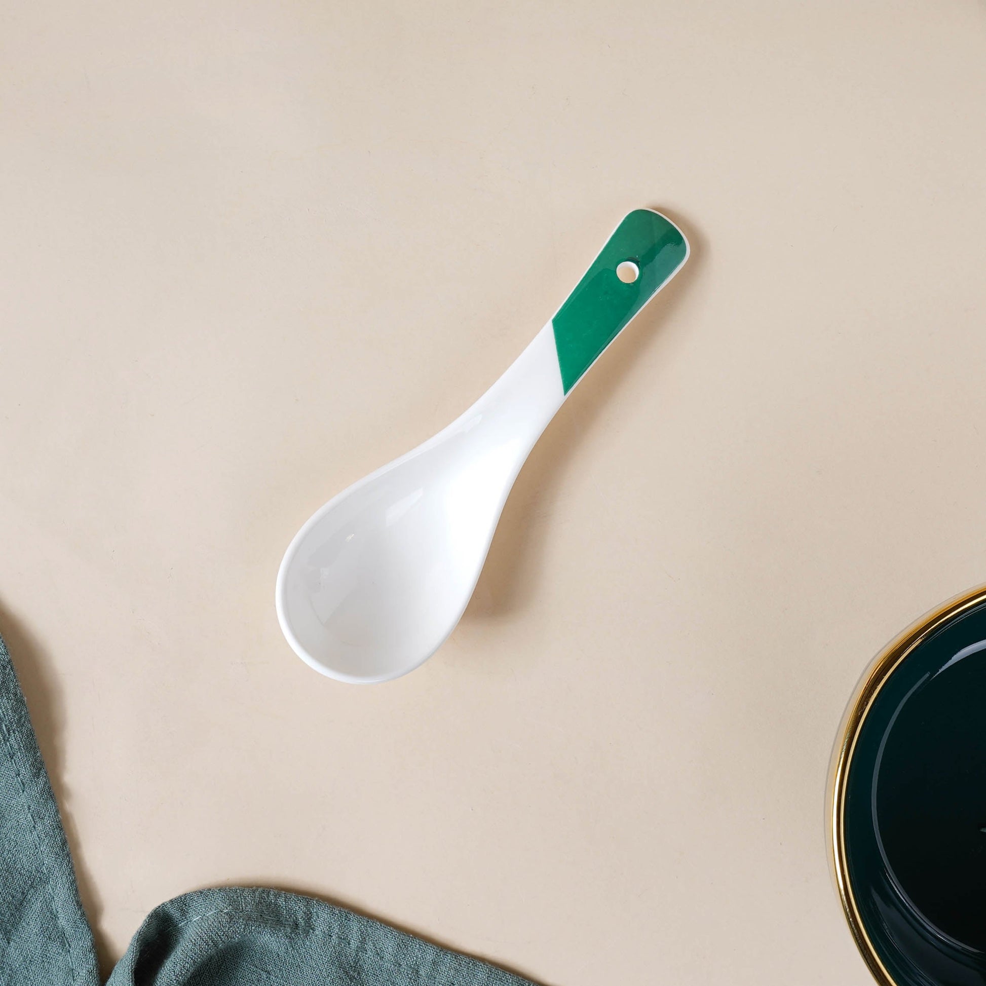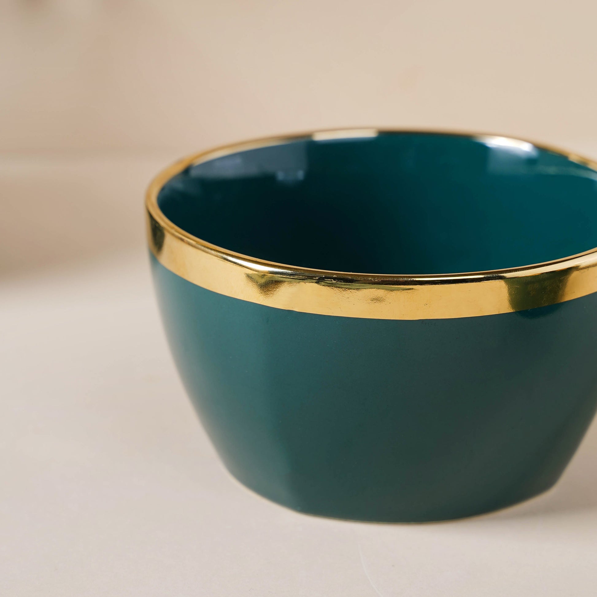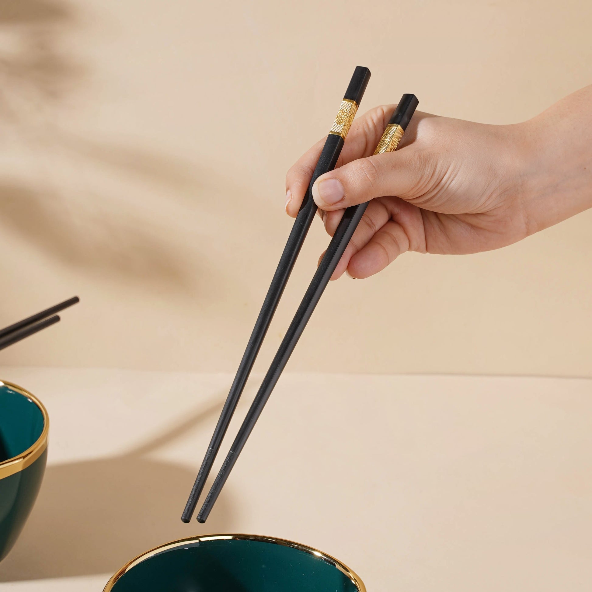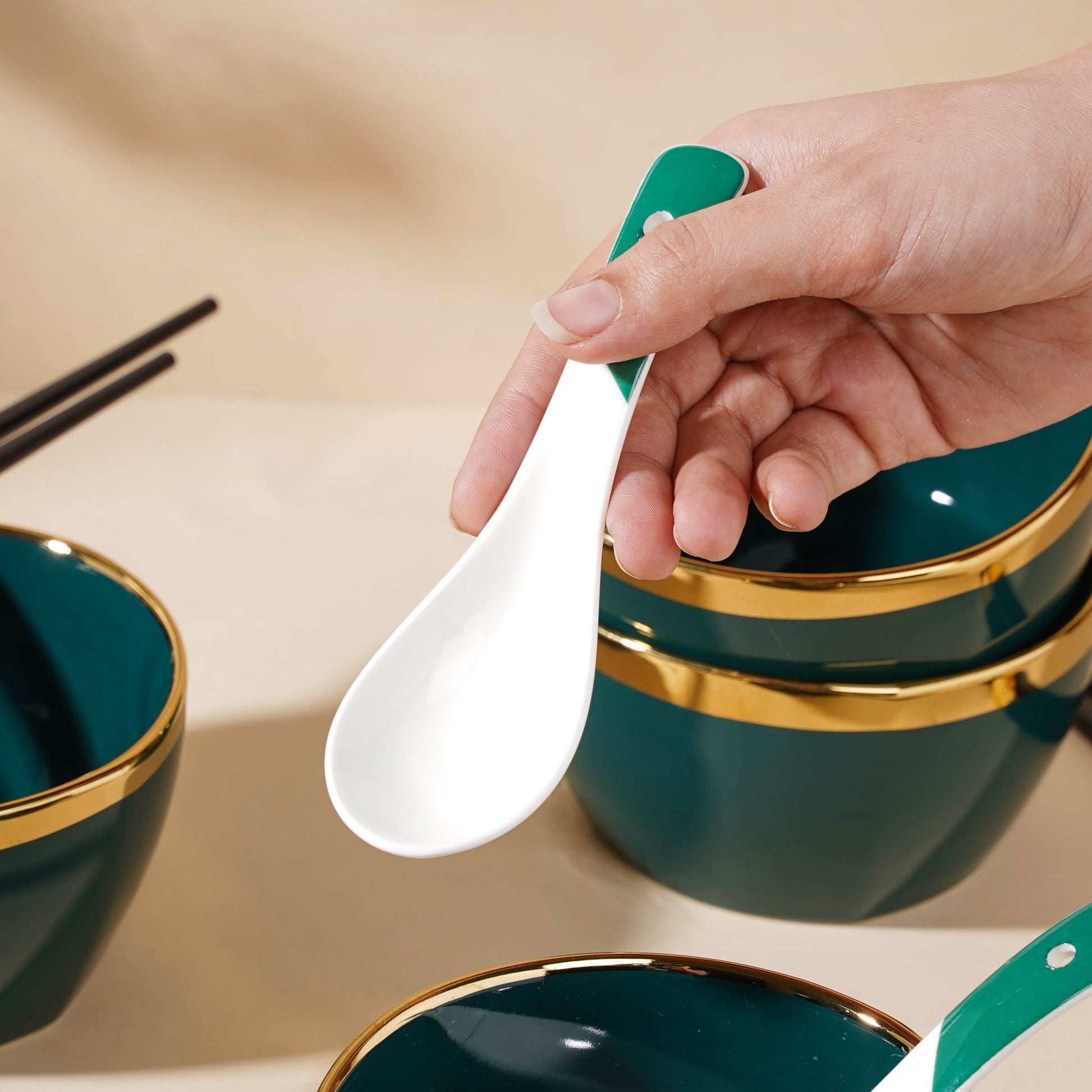 The set of 4 ceramic soup bowls features a glazed emerald finish and lustrous golden rim that graces the table with sophistication and luxe. The set comprising 4 soup spoons and 4 pairs of chopsticks makes the set ideal to be used as ramen bowls, bowls for snacks, and bowls for soup. The elaborate sheen and modern design of the bowl exudes elegance on the tabletop.