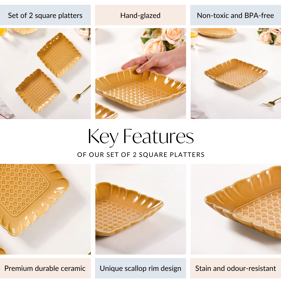 Elegant Scallop Rim Square Platter Set Of 2 Yellow Ochre 8 Inch