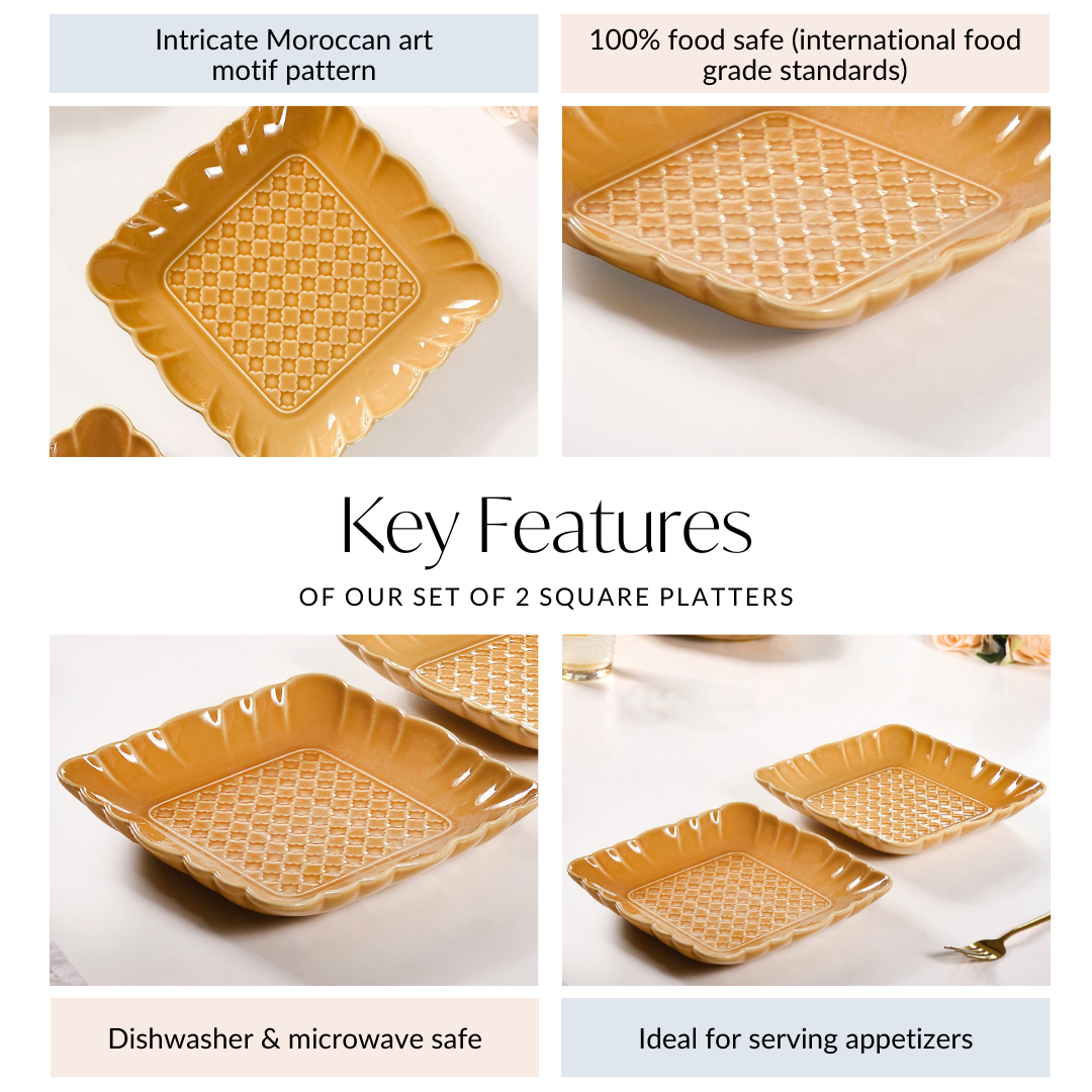 Say hello to your new pièce de résistance for all your culinary adventures, our Moroccan square platter, which is bound to make all your guests start talking. Made from top-quality ceramic, these square platters do it all. Dishwasher-safe and microwave-friendly, it effortlessly withstands the rigours of modern life while maintaining its timeless charm. The unique scallop rim design adds a touch of whimsy, while the intricate Moroccan art motif pattern and rich yellow ochre hue transport you to the bustling markets of Marrakech. And to top it all off, it's non-toxic and BPA-free, complying with the highest international food-grade standards. Like we said, it's the platter that can do it all! So, whether you're serving hors d'oeuvres or choosing to elegantly display this ceramic square platter on your coffee table, you don't want to miss your chance to get your hands on this beauty!