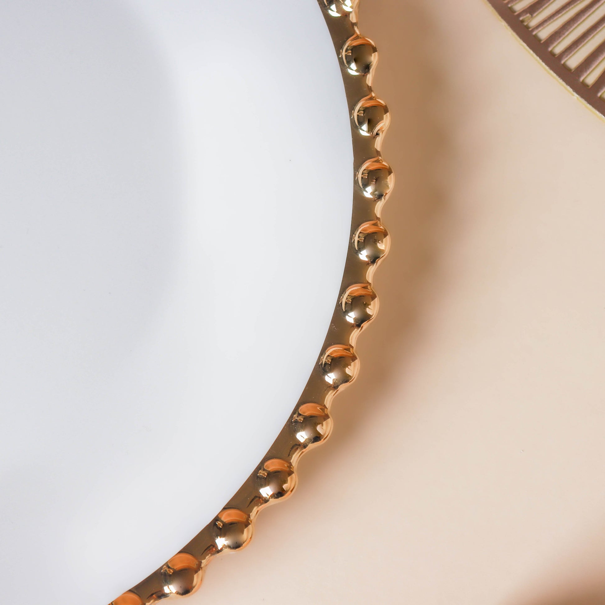 The classic dinner plate in glazed ceramic is embellished with a gold rim that has a subtle and classy vibe which enhances any contemporary table décor. The gold rim dinner plate is a spectacular choice for any contemporary décor. The plate will complement any dinner plate or ceramic bowl to lay the table. The plate can be paired with other pieces from the Elysian collection to set an aesthetic table.