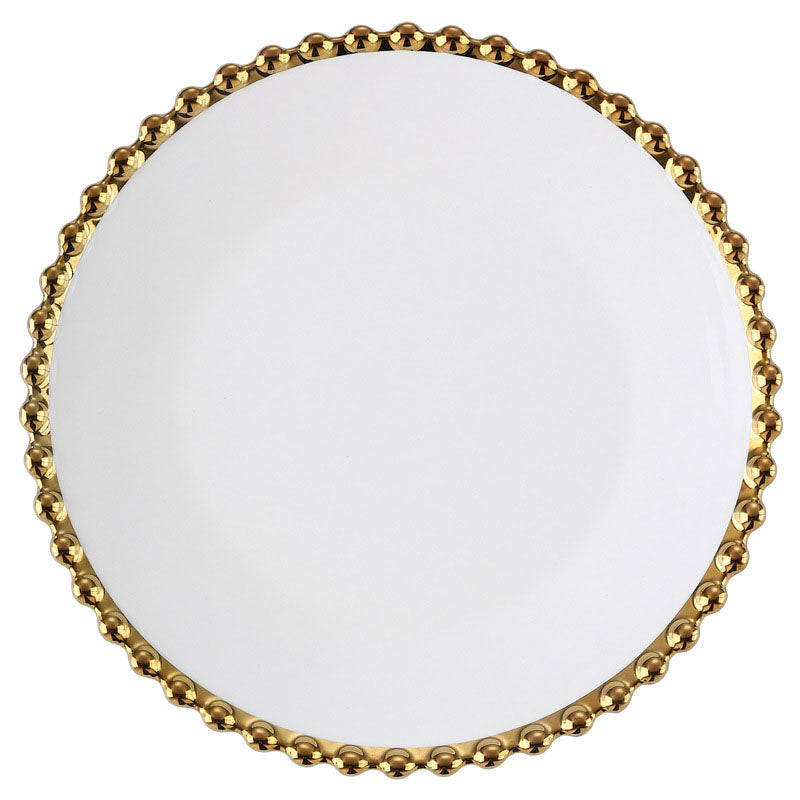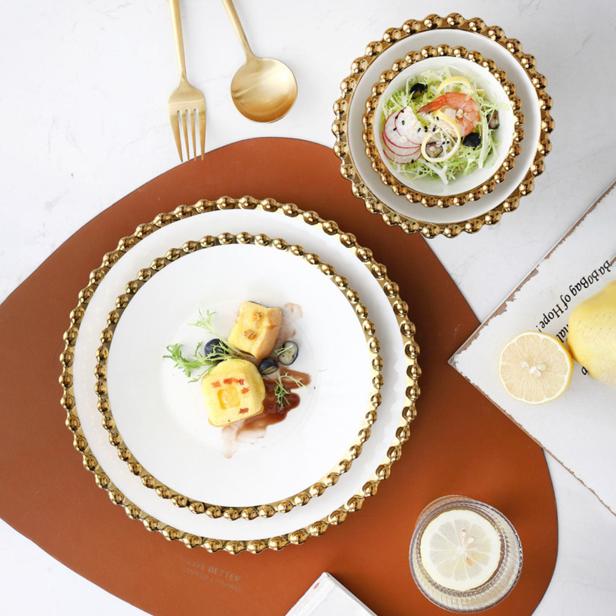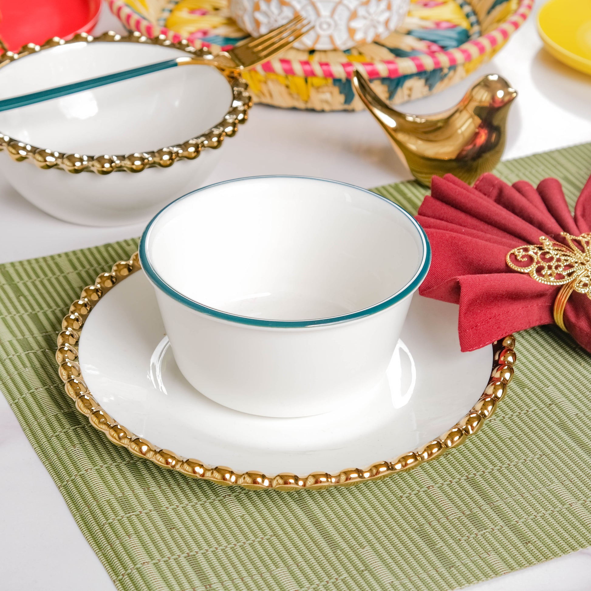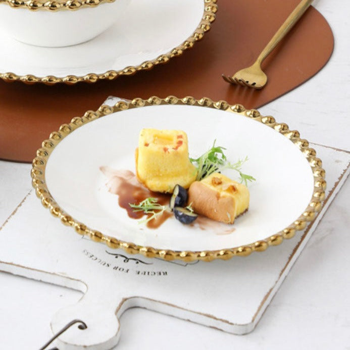Nestip: Lay the table for a Sunday brunch with this gold rim ceramic plate along with textured drinkware glass for an aristocratic look.