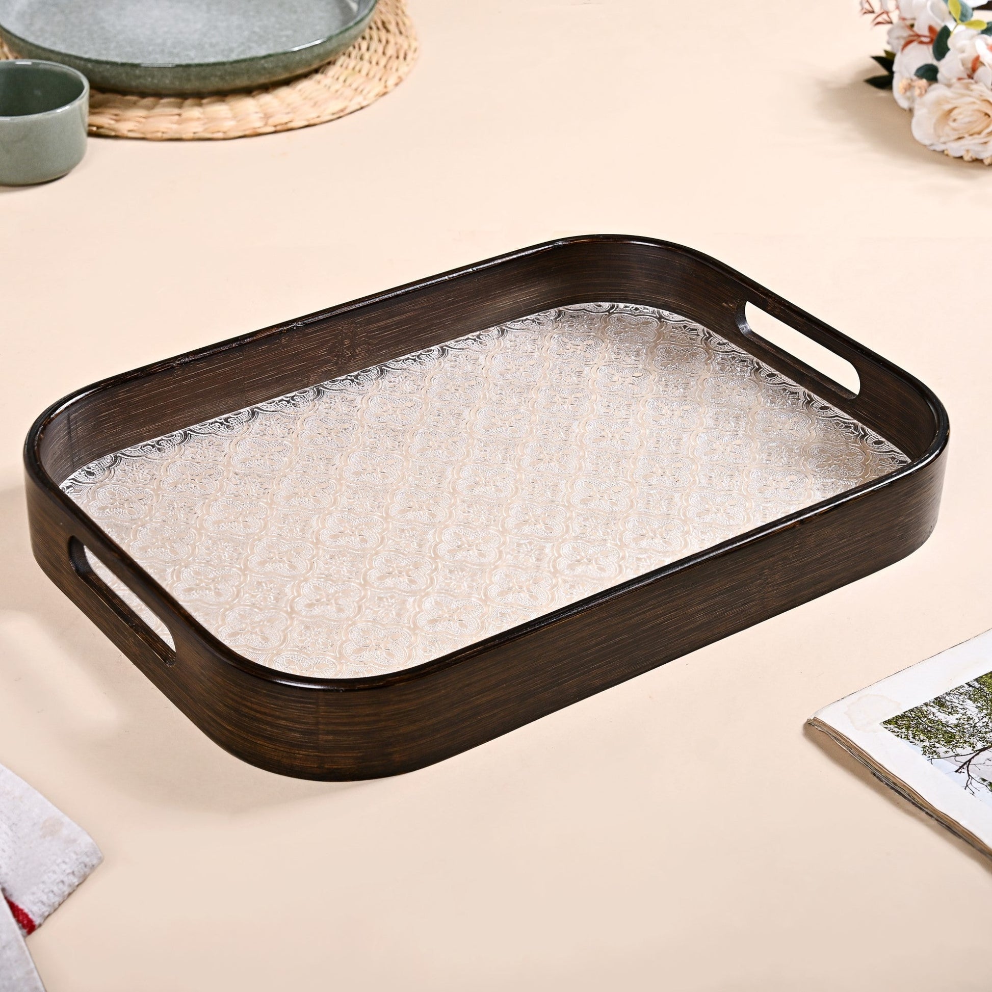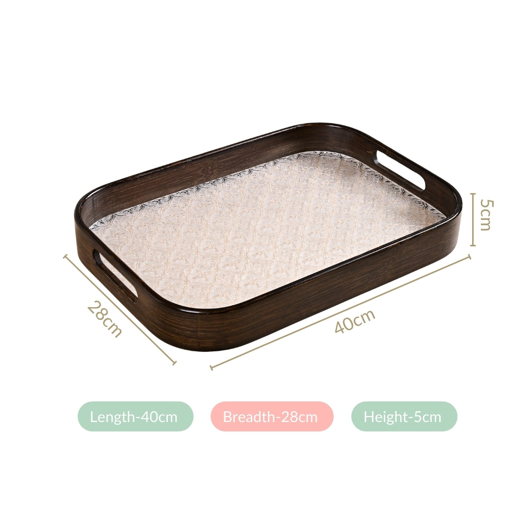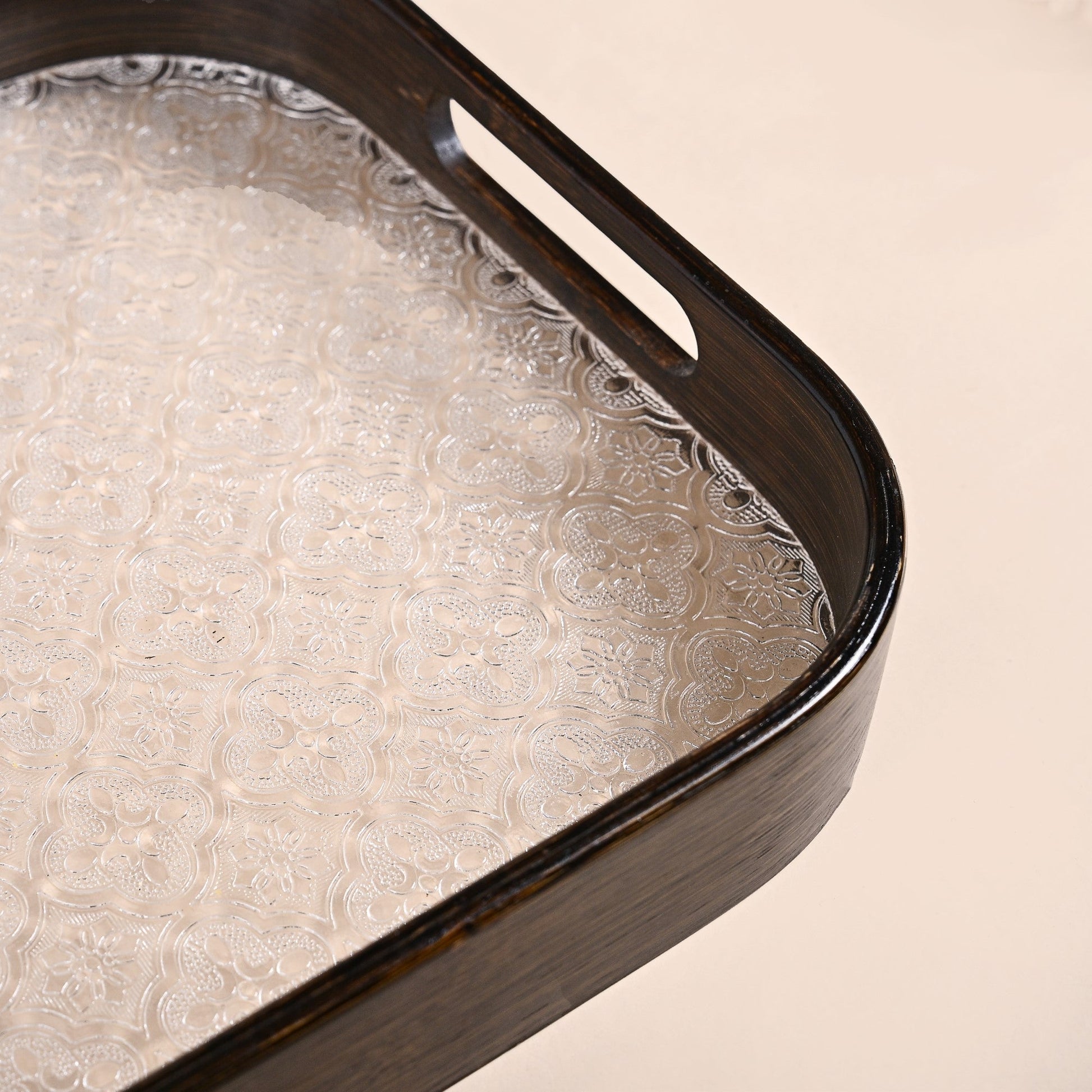 Design: Featuring a natural bamboo wood frame and a transparent acrylic plate, this serving tray adds a touch of modern simplicity to your table. The embossed design on the acrylic surface enhances its visual appeal while creating a unique texture. Easy-grip handles on both sides ensure effortless portability.