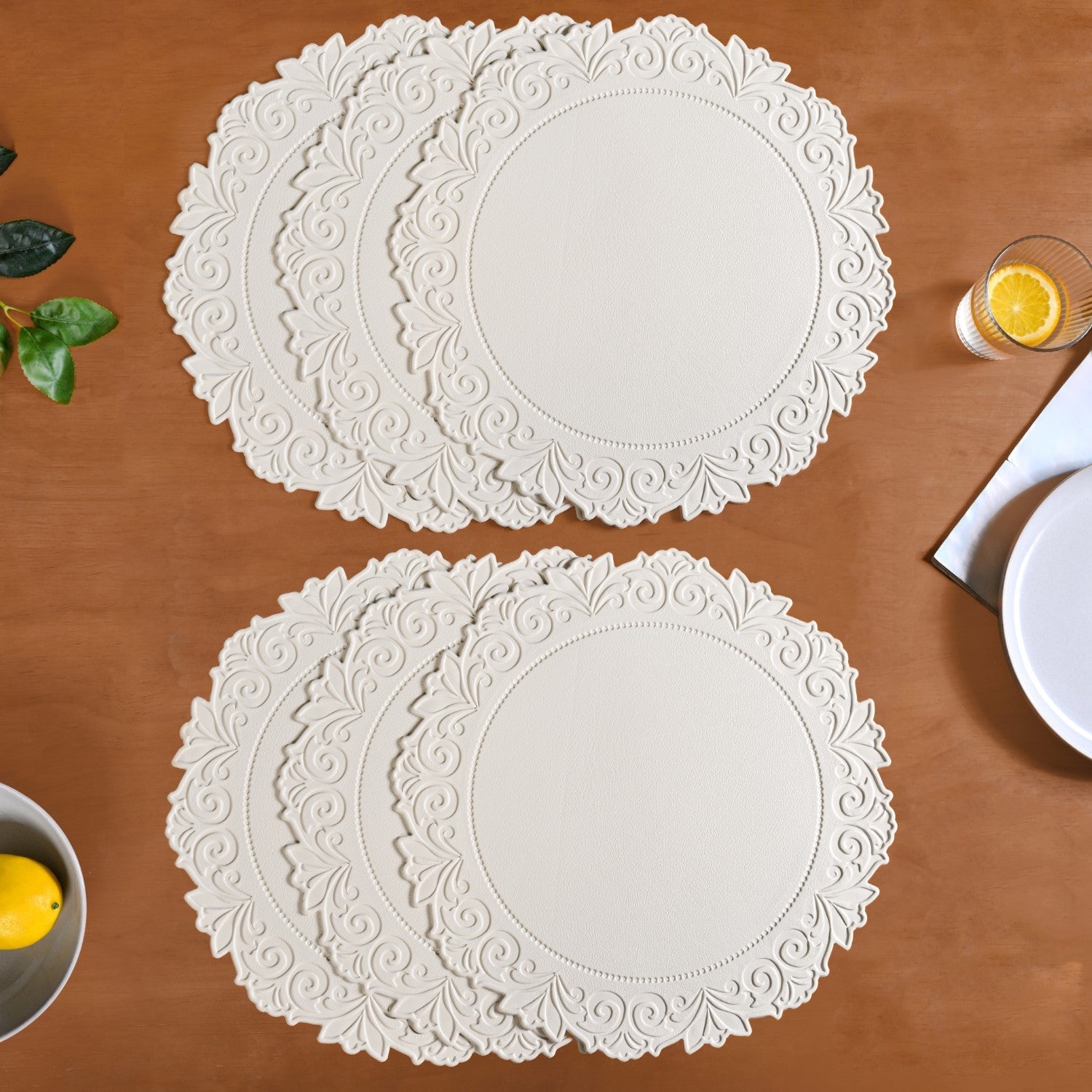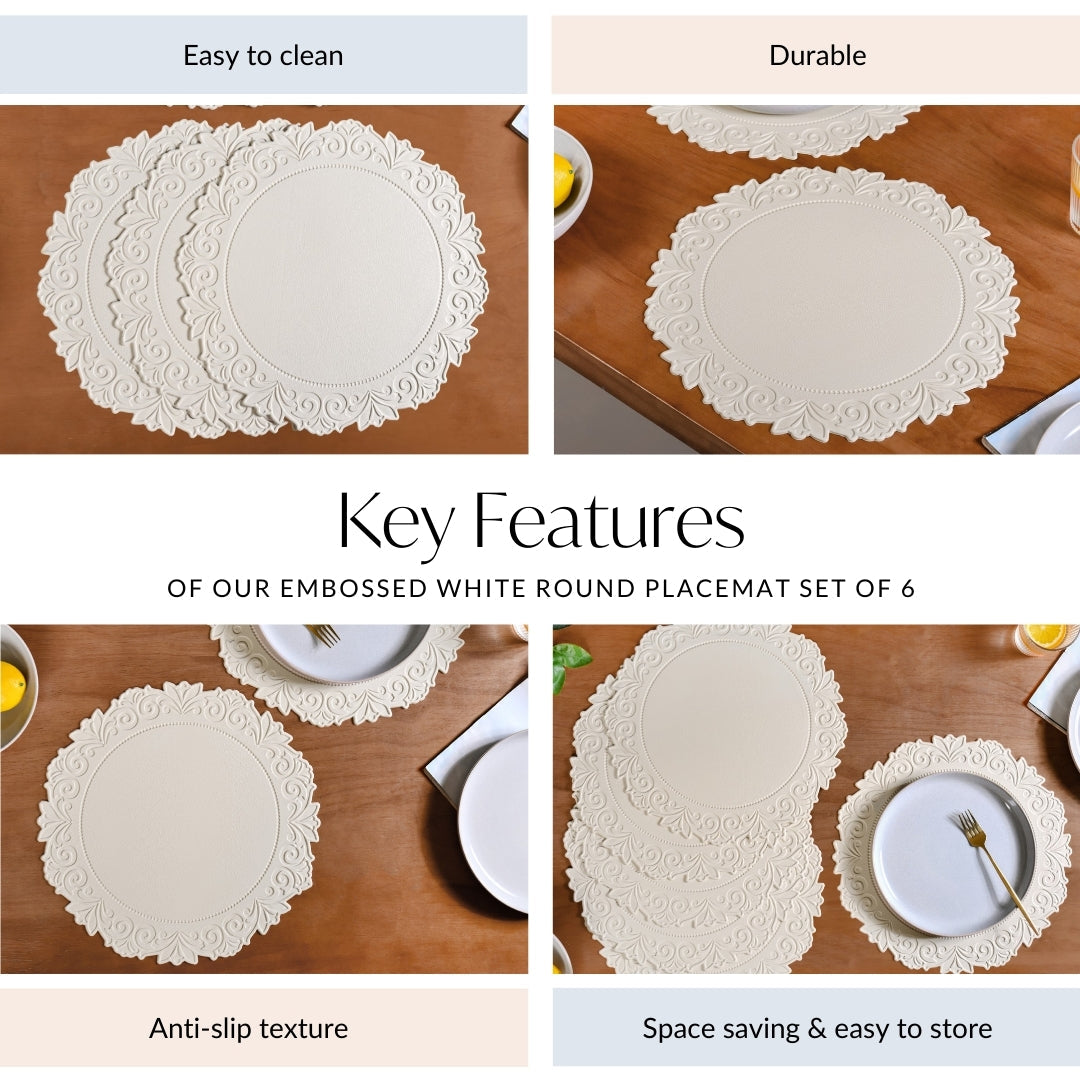 Design: This set of six round placemats boasts a stunning embossed design that adds texture and elegance to your table. Crafted in a serene white shade, each mat features delicate flower patterns that radiate an ethereal charm. The non-slip textured backing keeps them securely in place, combining practicality with sophistication for everyday dining. Perfectly versatile, they effortlessly complement any decor.