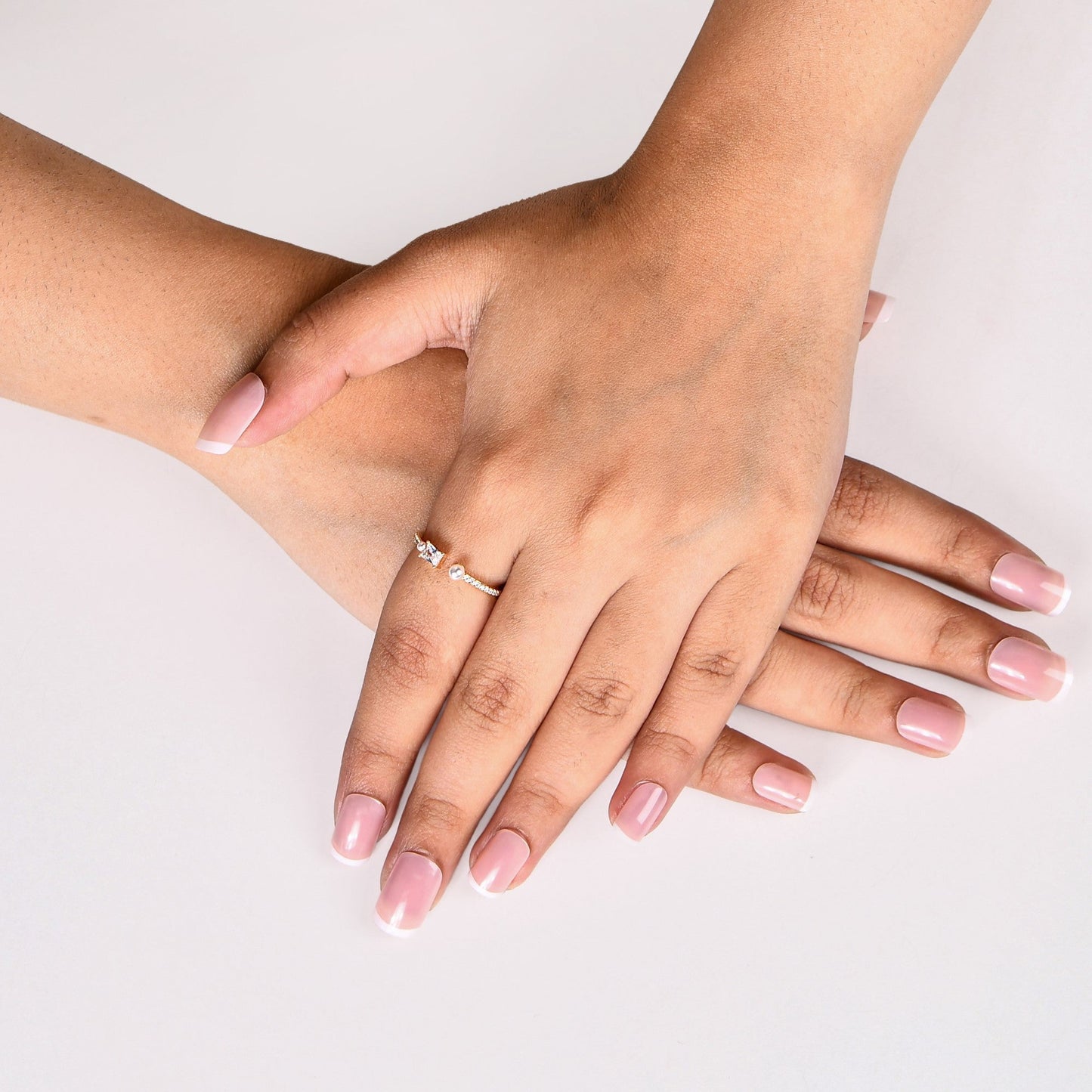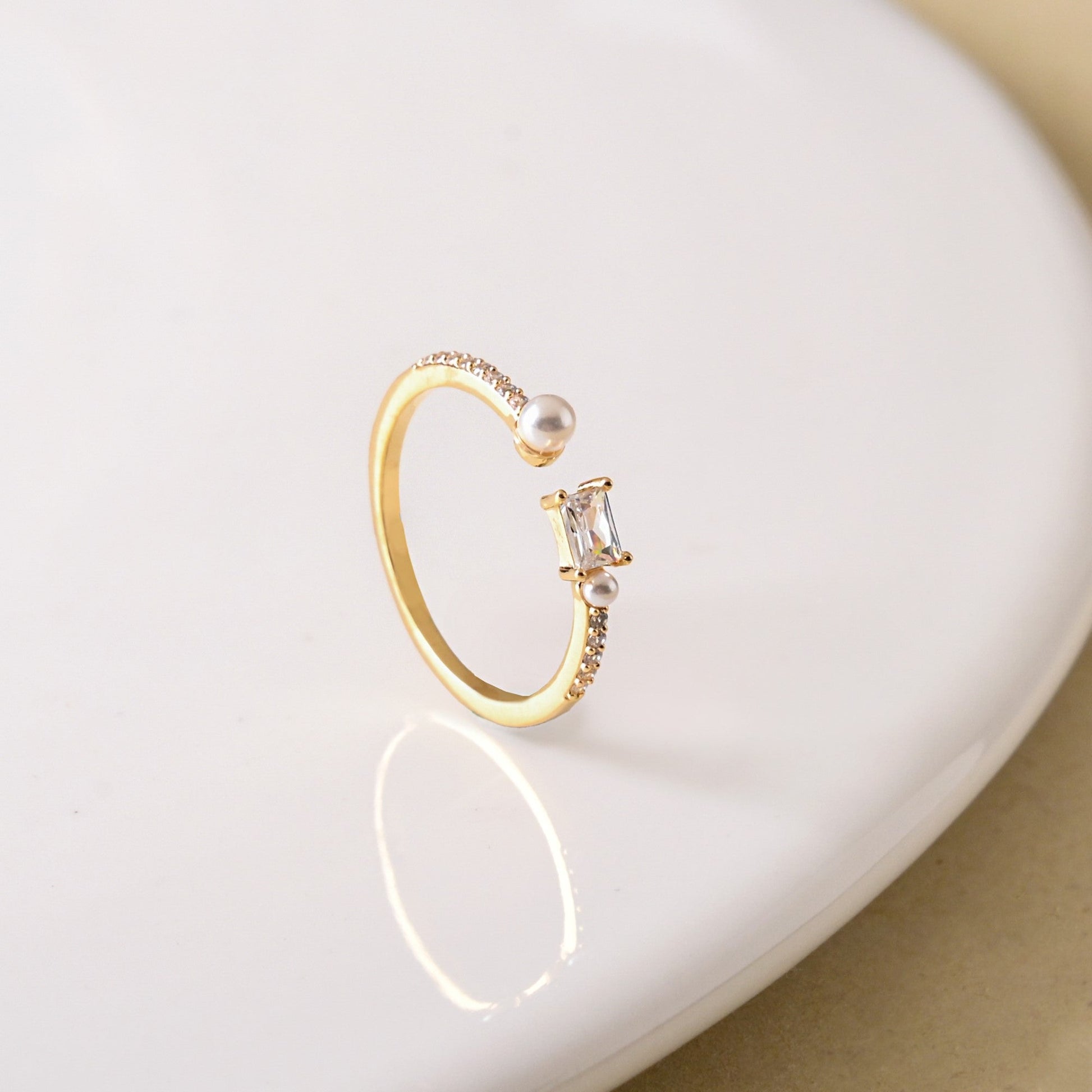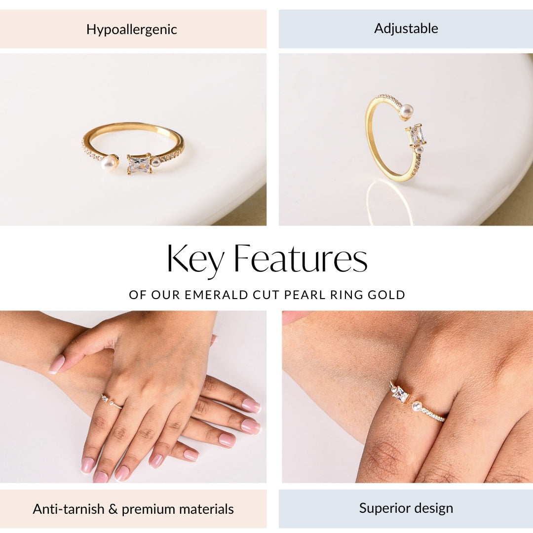 A little sparkle, a lot of elegance! This gold ring is all about effortless charm, featuring a dazzling emerald-cut stone nestled between two delicate pearls. Set on a slim, stone-studded band, it adds just the right amount of shimmer to your look. Plus, the adjustable fit means it’s comfy, versatile, and perfect for gifting! Wear it solo for a touch of sophistication or stack it up for a statement—either way, it’s a stunner for every occasion.