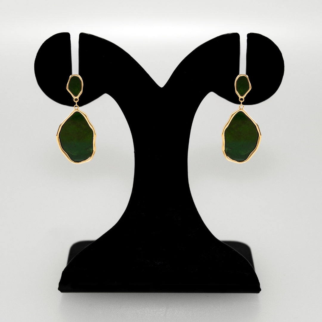 Channel the perfect mix of modern elegance and timeless charm with these exquisite abstract dangle earrings. Inspired by the harmony of bold shapes and rich hues, the earrings feature a striking emerald green centerpiece, accented with sleek gold borders that exude sophistication. The geometric design is a nod to contemporary art, making these earrings a wearable piece of modern creativity.