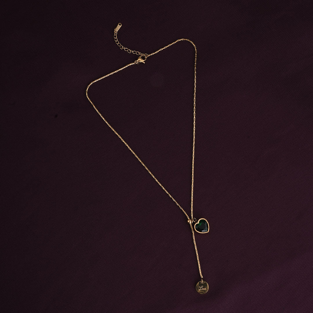 This captivating piece embodies the true essence of love with the shimmering green stone nestled within a gold heart-shaped pendant.