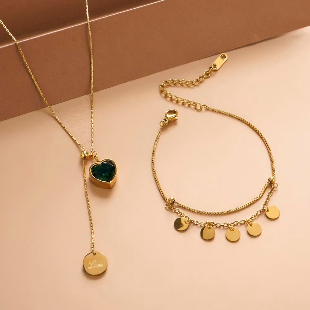 Emerald Love Necklace & Tiny Plates Bracelet Combo Set
