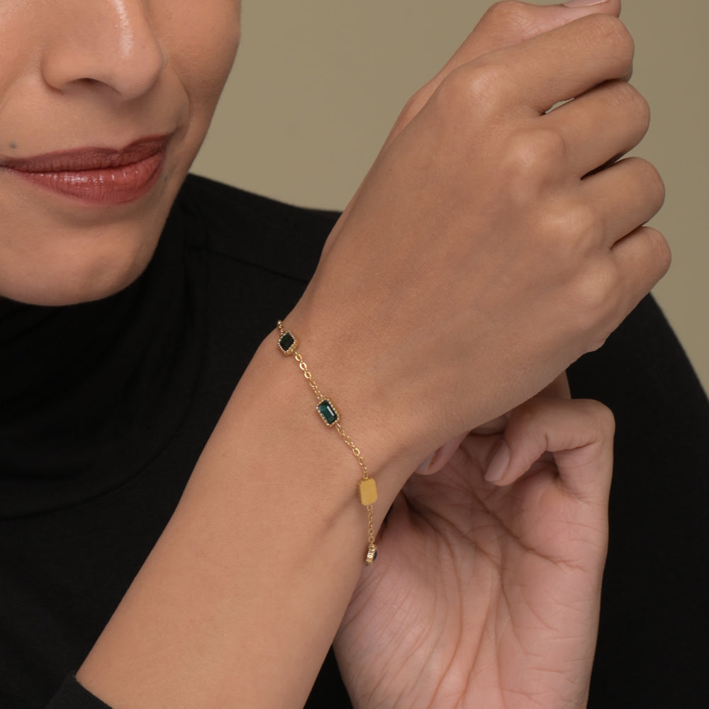 The emerald stone bracelet has a thick plating of 18k gold tone plated and is made of high quality metal.