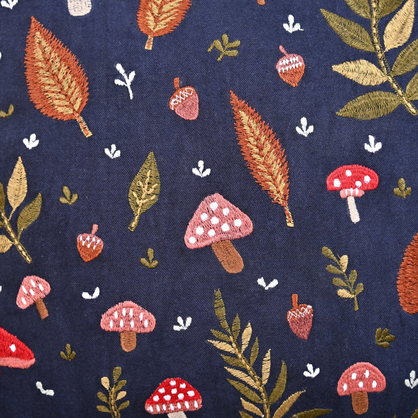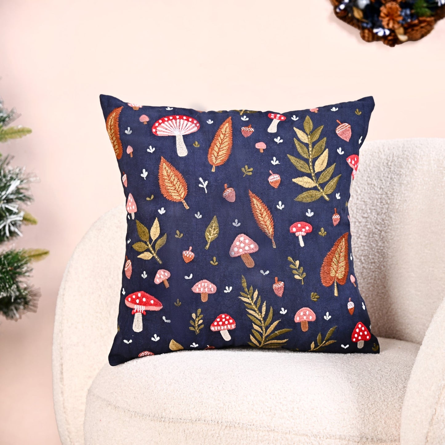 Design: The couch cushion cover showcases a fall-inspired motif with intricately embroidered red button mushrooms and vibrant leaves against the dark blue backdrop, adding a natural and whimsical touch to your space. The smooth concealed bottom zipper ensures a neat and refined finish.
