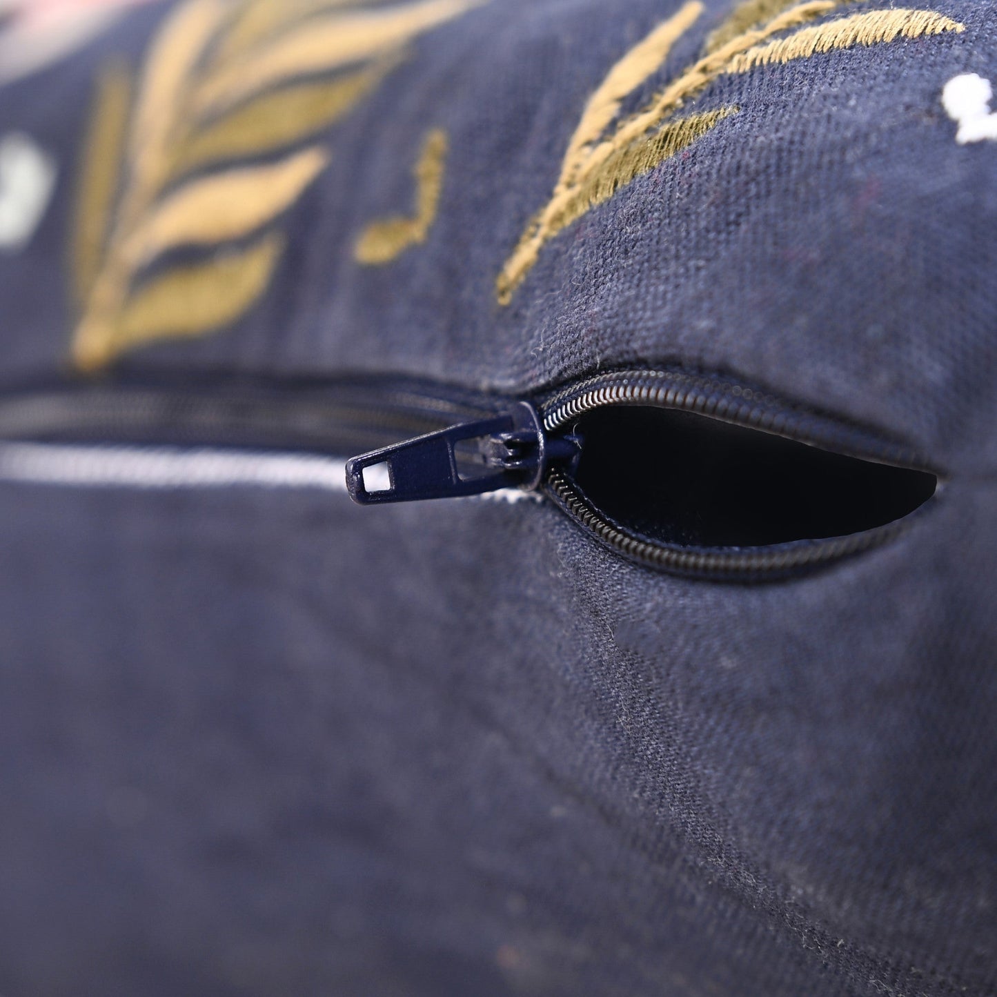 Benefits: Crafted from 100% cotton chambray fabric in a rich dark blue shade, this pillow cover offers a soft, breathable texture. The delicate embroidery on cotton not only enhances its visual appeal but also ensures durability and long-lasting quality.