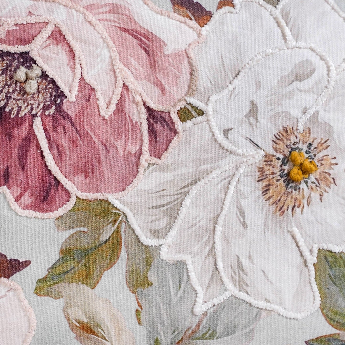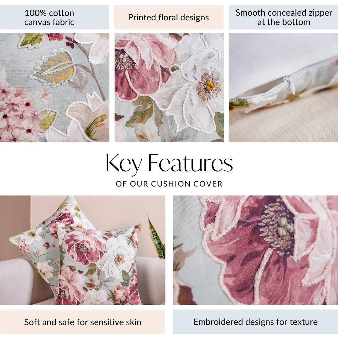 Design: Made from 100% cotton canvas, this set of cushion covers features lush floral prints and embroidery in a striking colour palette. One cover showcases hydrangeas, lilies, and tiny blossoms in hues of blush, ivory, wine red, and sage green, both embroidered and printed on a soft pastel base. The other cover dazzles with bold peonies and wild roses in shades of maroon, dusty pink, and cream, detailed with textured threadwork.