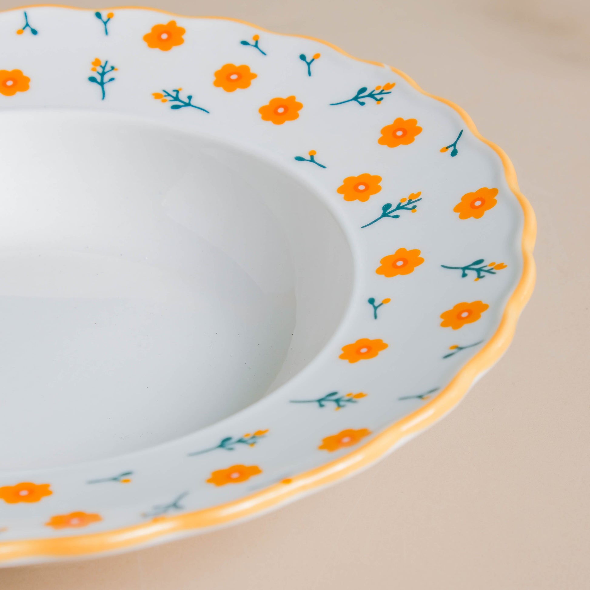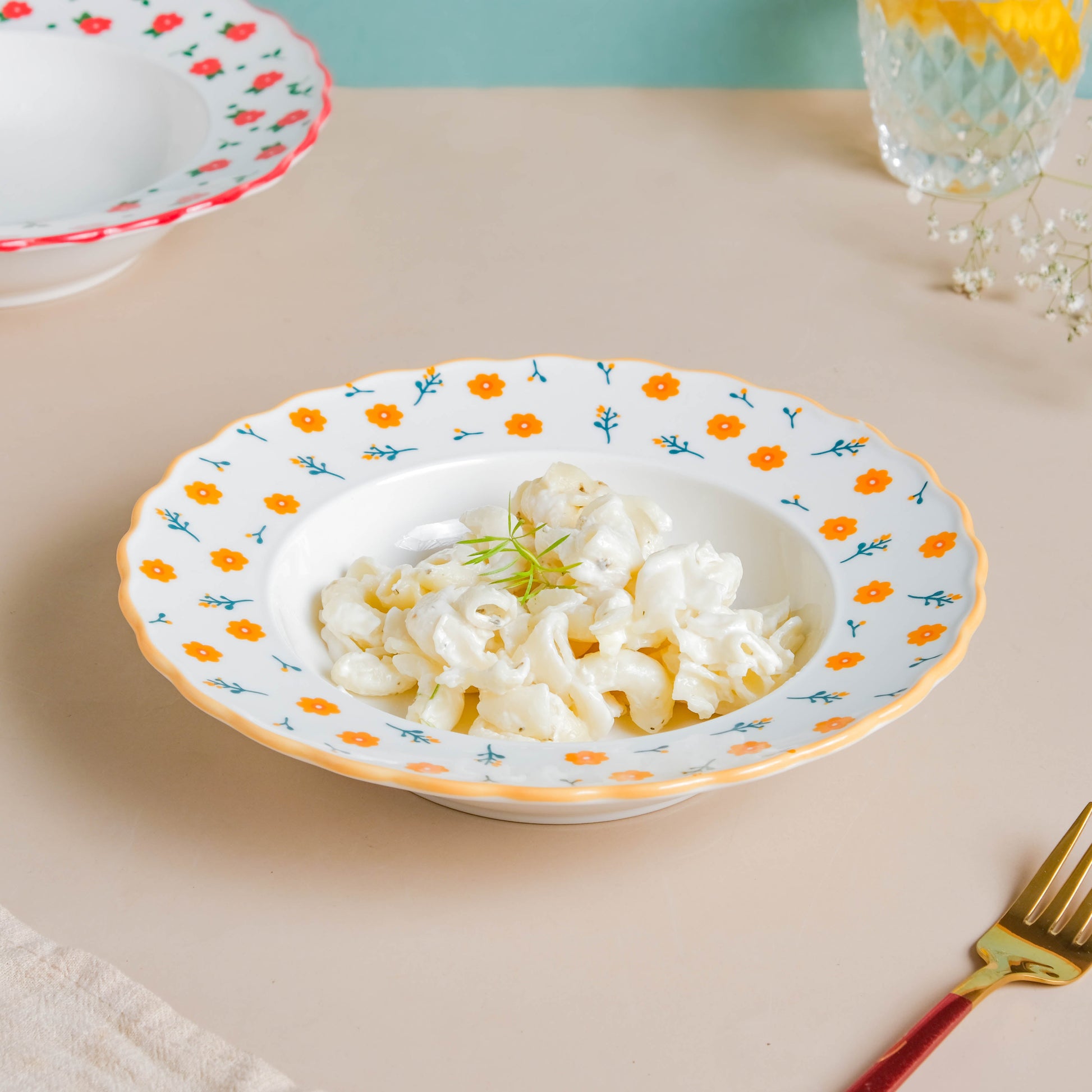 Radiate the summer beams with a floral arrangement of a tangerine flower wreath, that's crowned on the white ceramic pasta plate. The wavy rimmed orange pasta plate is made of high-quality ceramic and gives a space to hold and carry it without the thought of how to serve a steaming, hot dish. The material quality assures a ceramic microwave safe and dishwasher safe usage. Present a delightful serving of creamy, pesto ravioli or penne pasta which would totally fit the color contrast of the orange pasta plate.