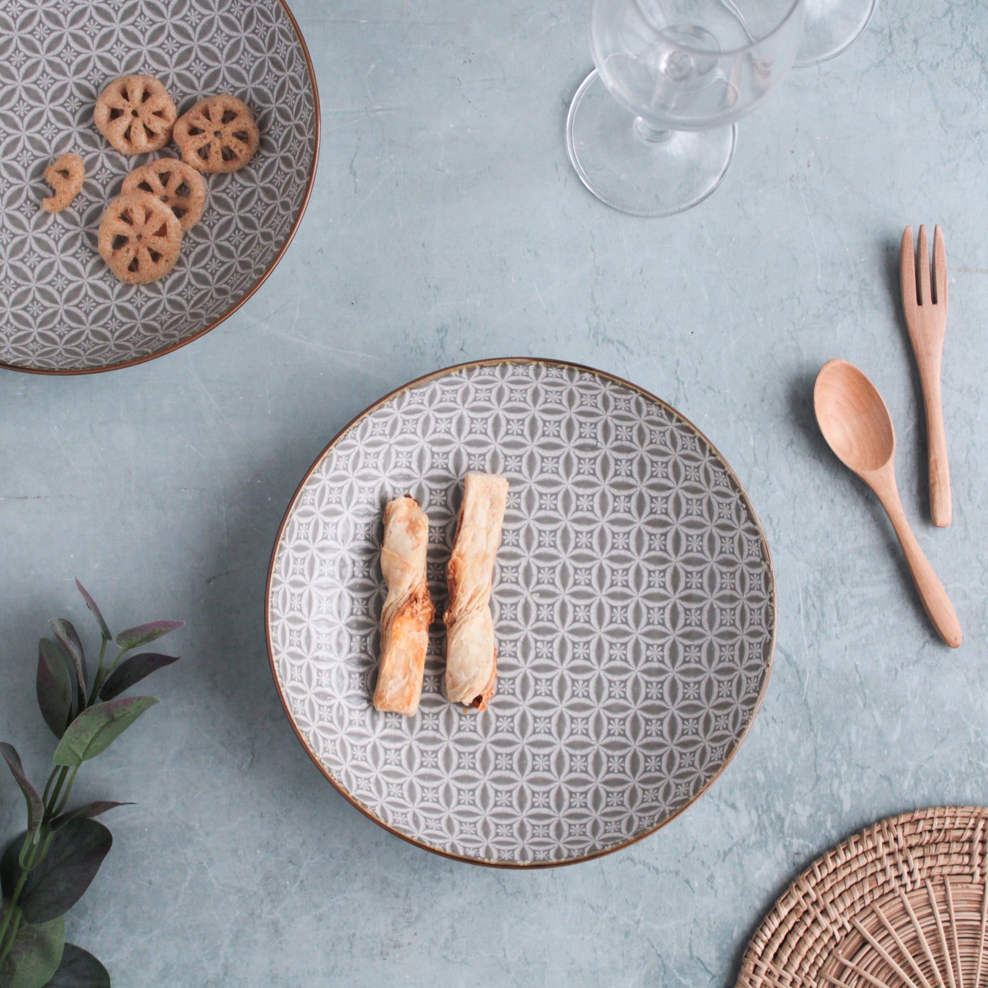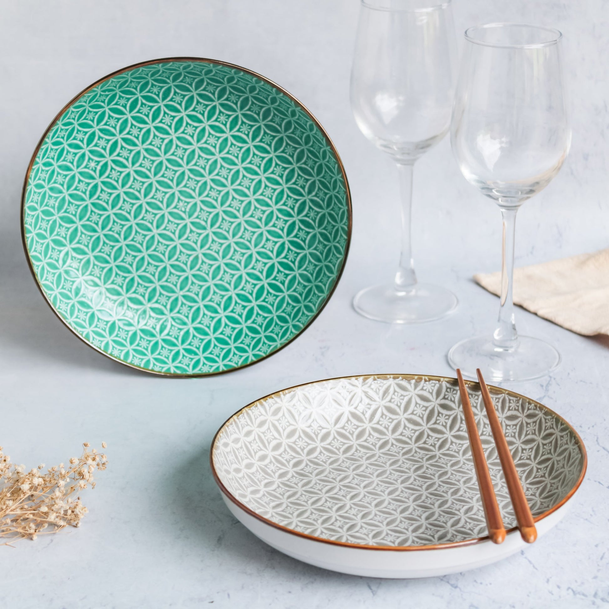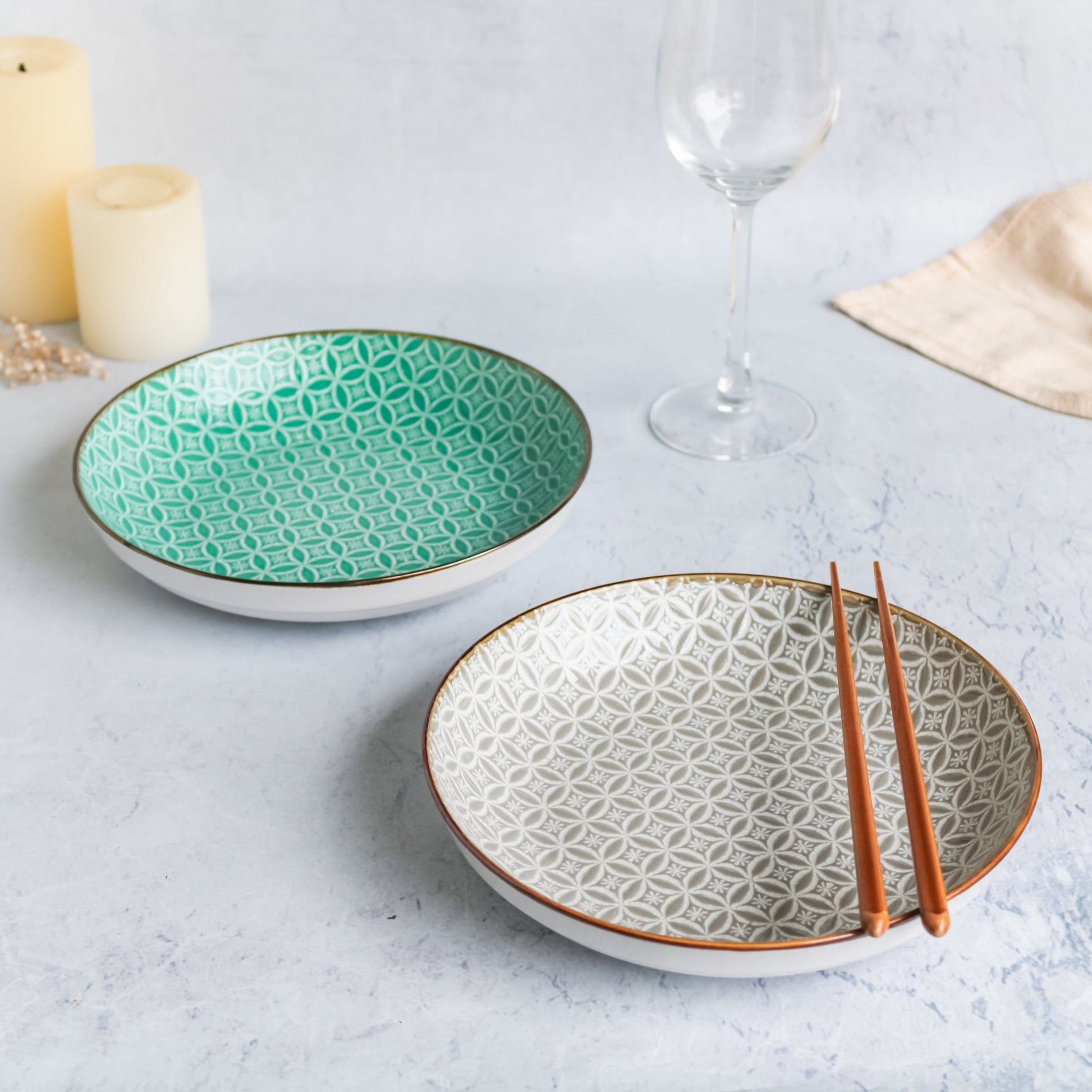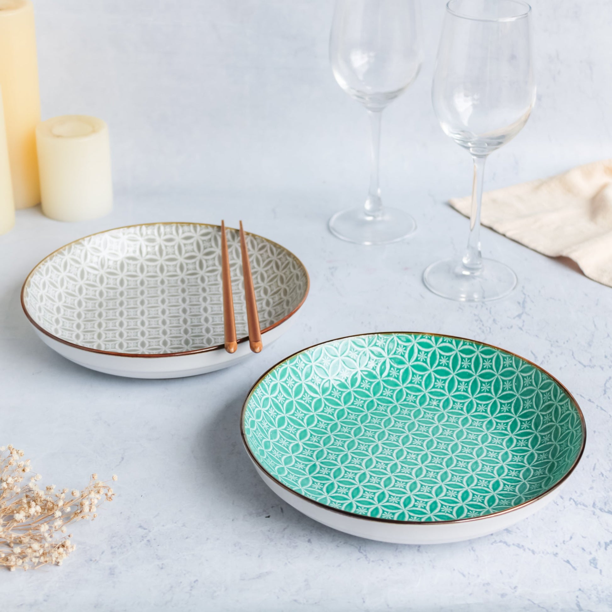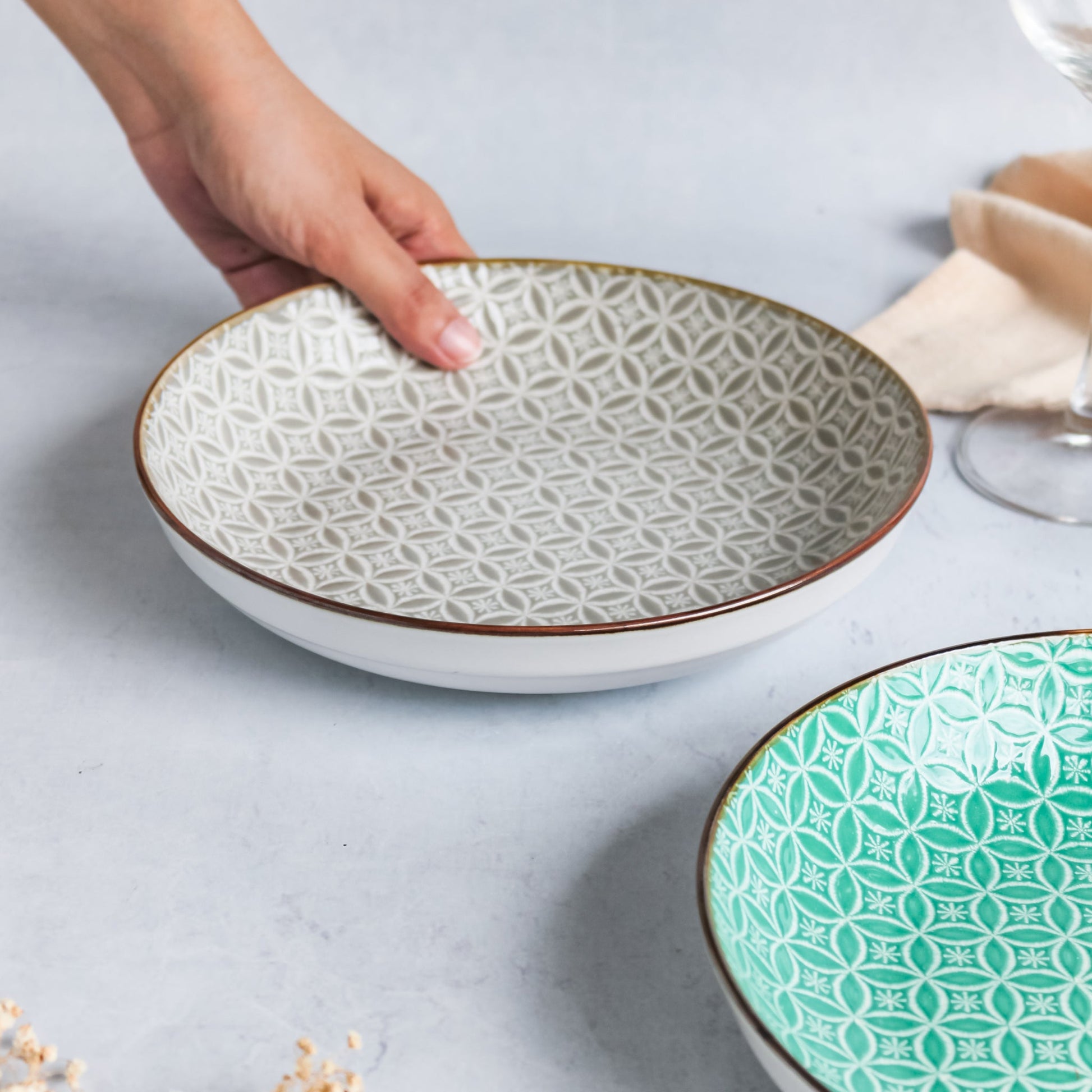 Engraved ceramic plate with beautiful geometric patterns on the inner surface is the ideal dish to bring some color into the kitchen. The plate has a raised bottom with a slightly elevated rim which makes it the perfect crockery for eating slightly gravy-is dishes like ramen or soupy noodles. The engraved floral motifs adds to the aesthetic when paired with the two soothing tones which it is available in.