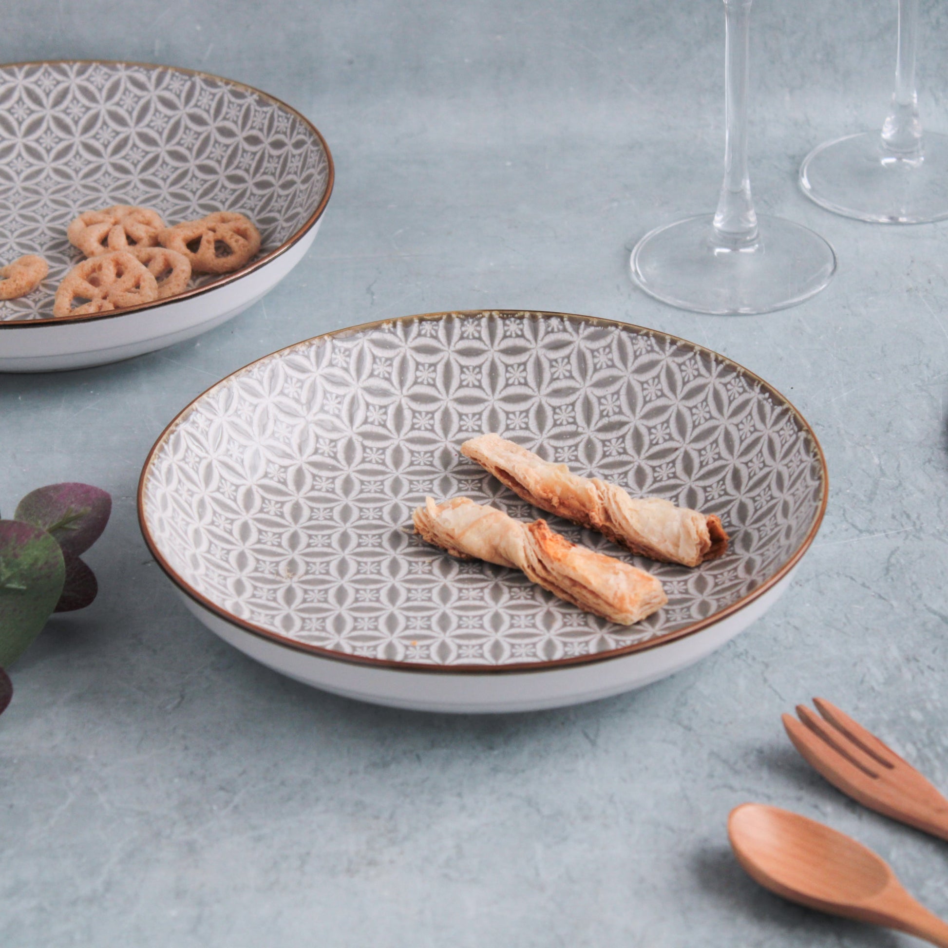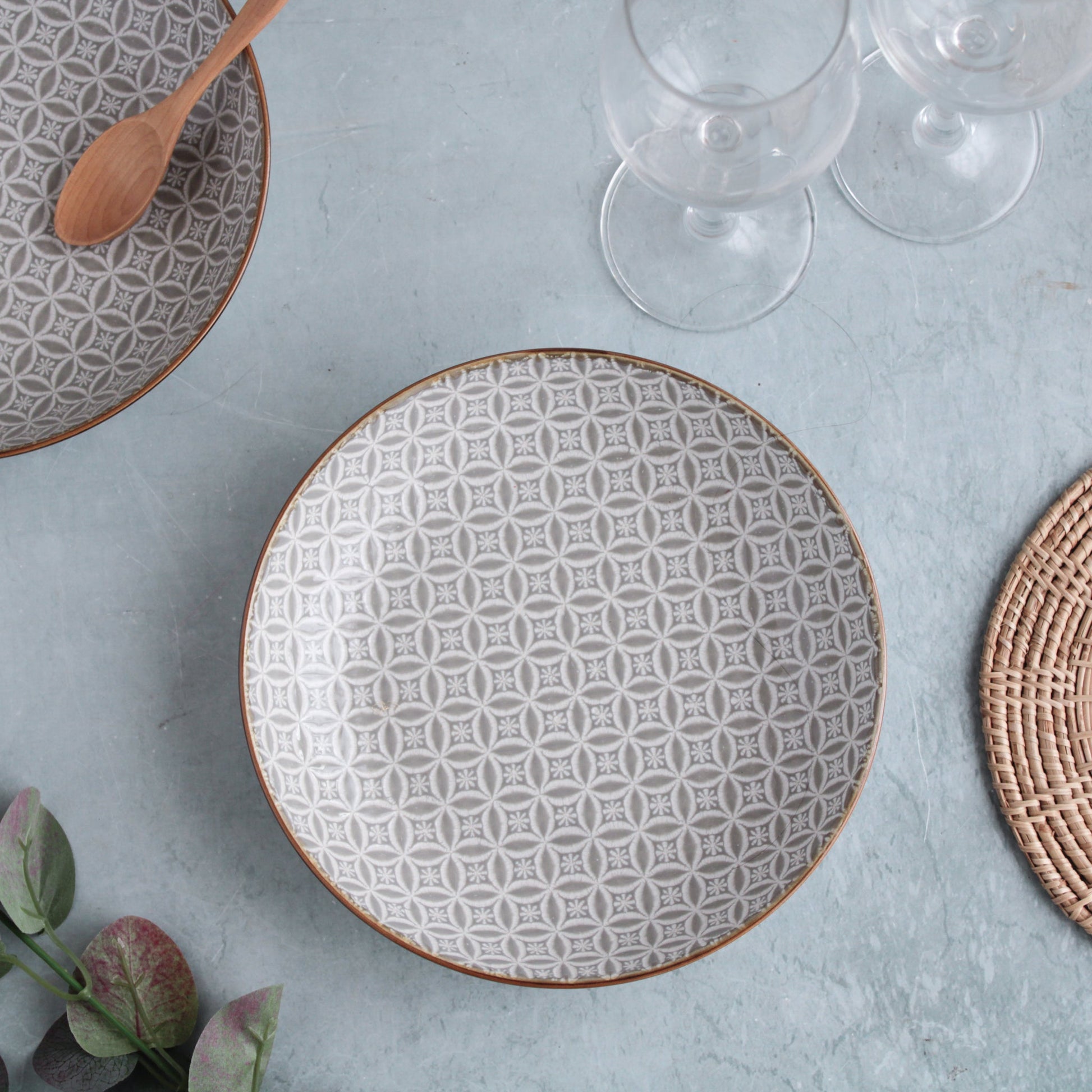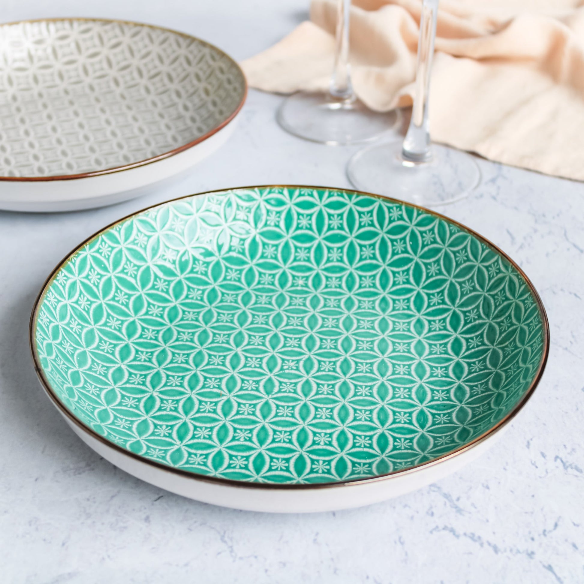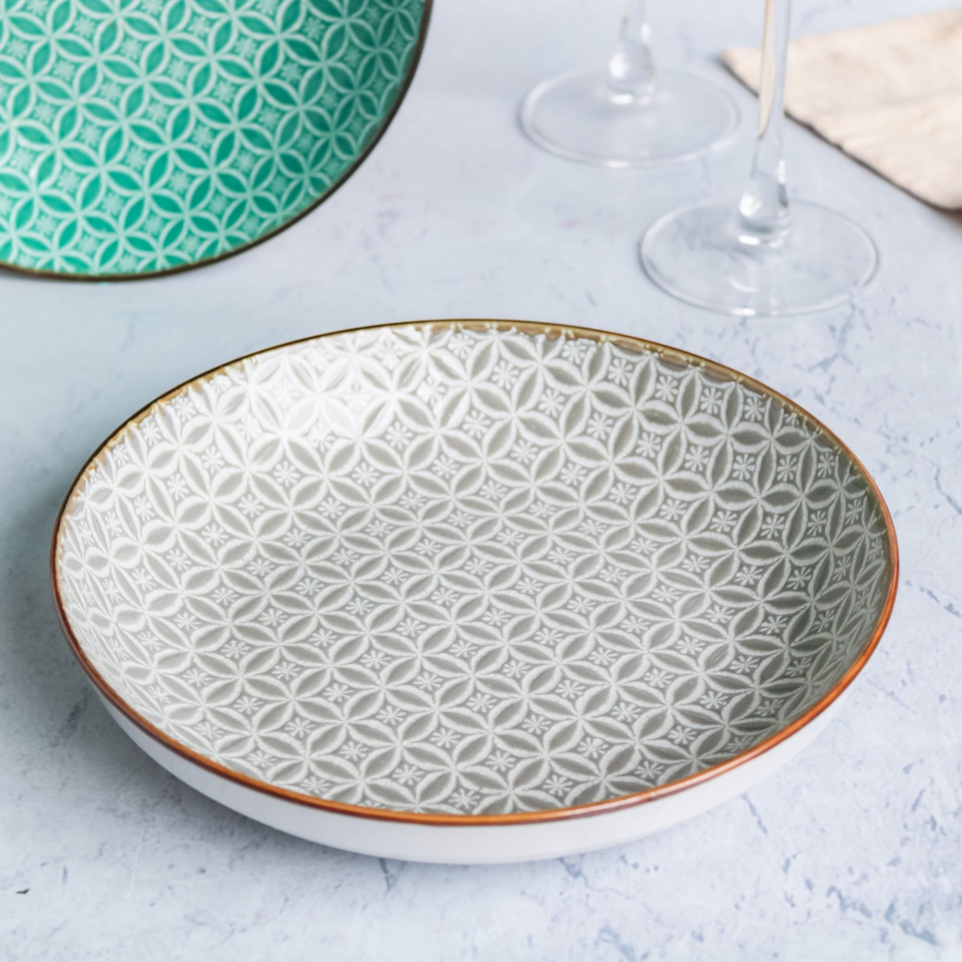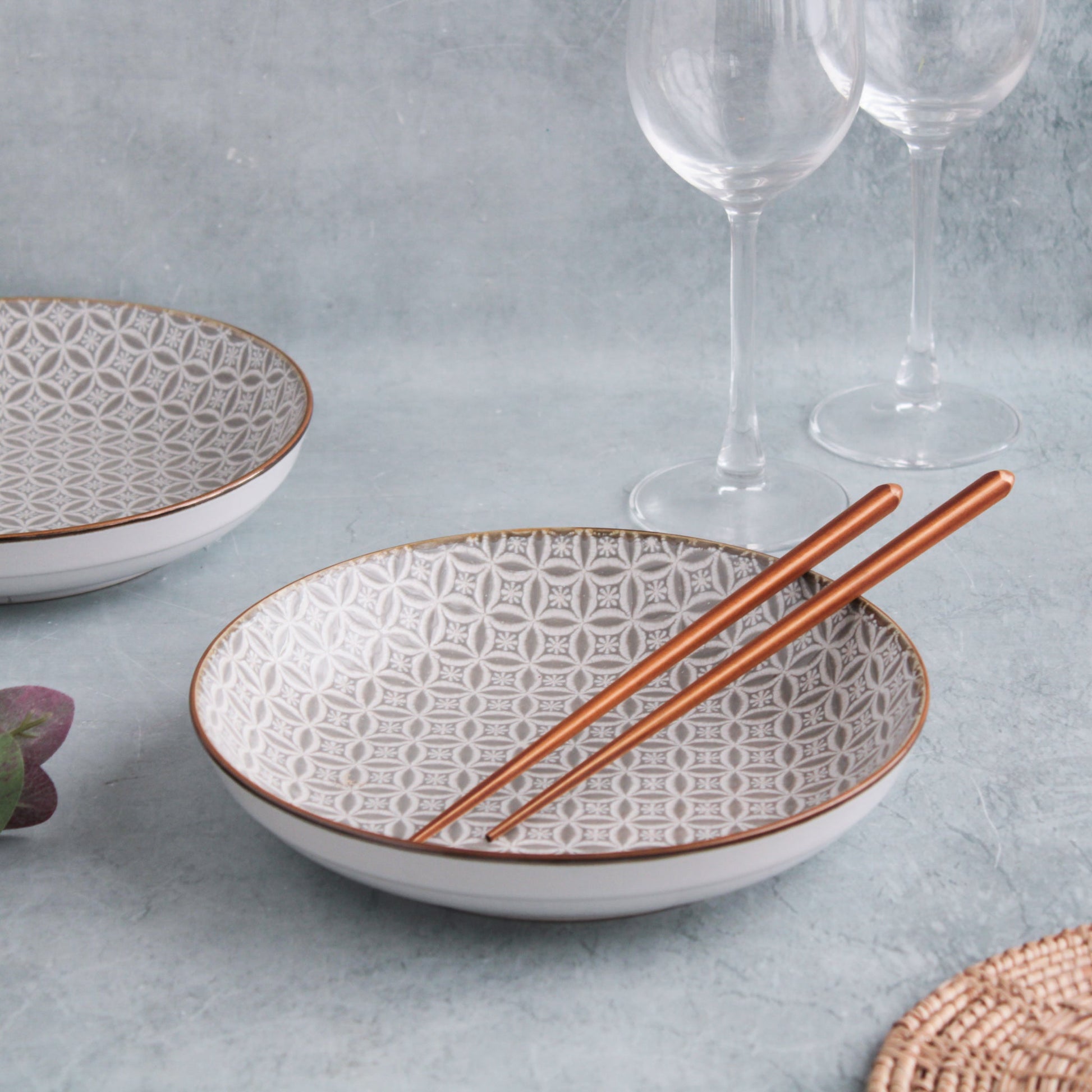 Engraved ceramic plate with beautiful geometric patterns on the inner surface is the ideal dish to bring some color into the kitchen. The plate has a raised bottom with a slightly elevated rim which makes it the perfect crockery for eating slightly gravy-is dishes like ramen or soupy noodles. The engraved floral motifs adds to the aesthetic when paired with the two soothing tones which it is available in.