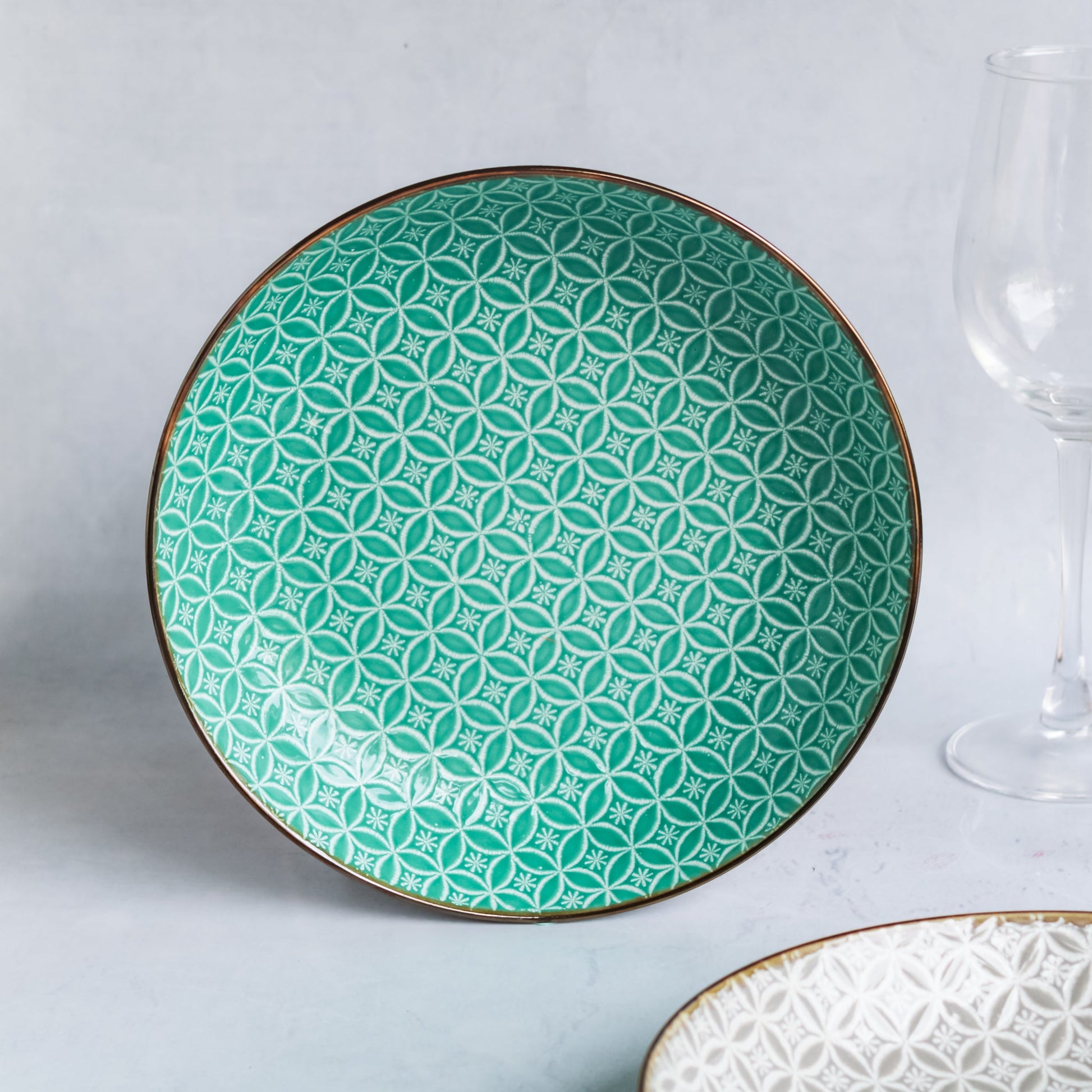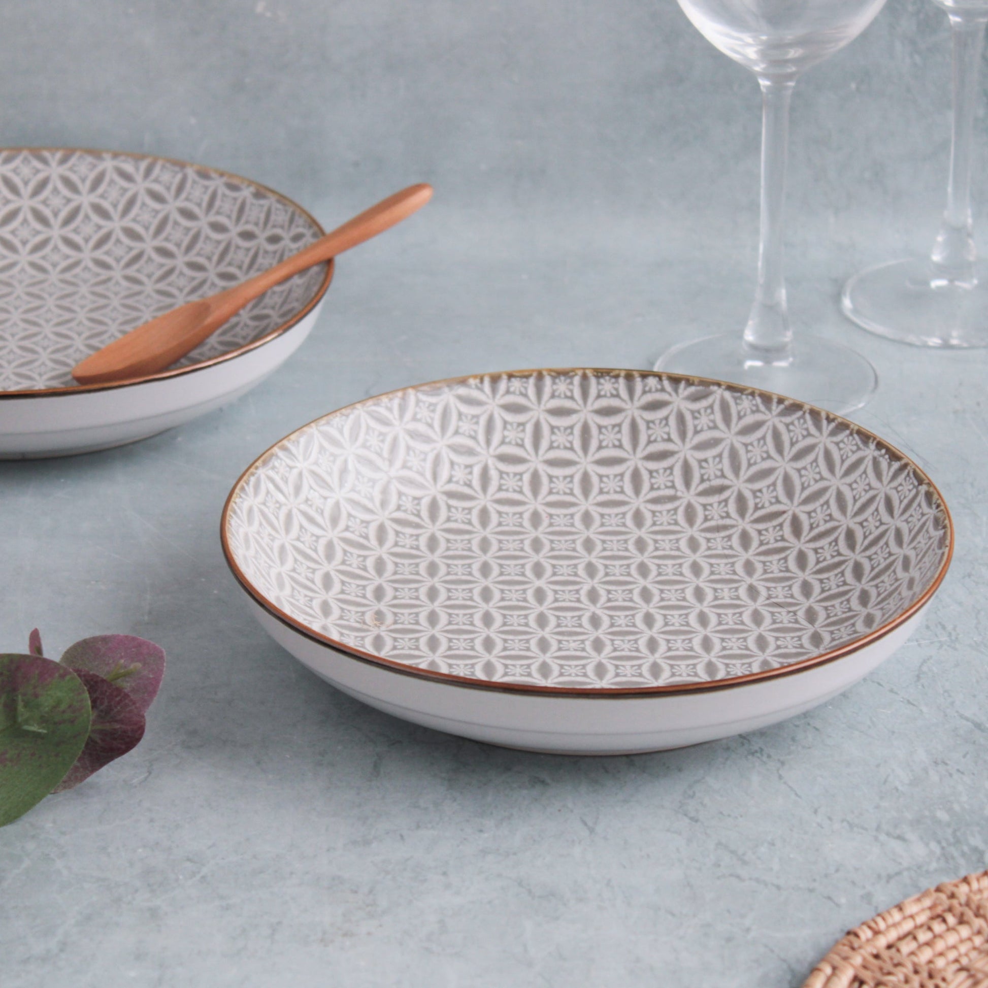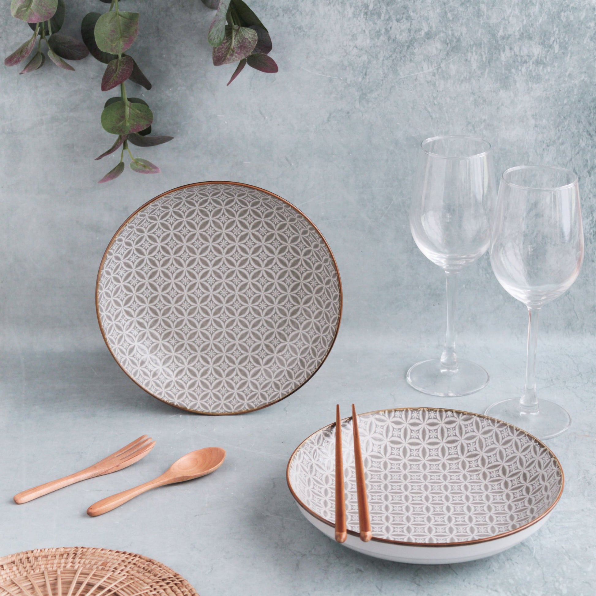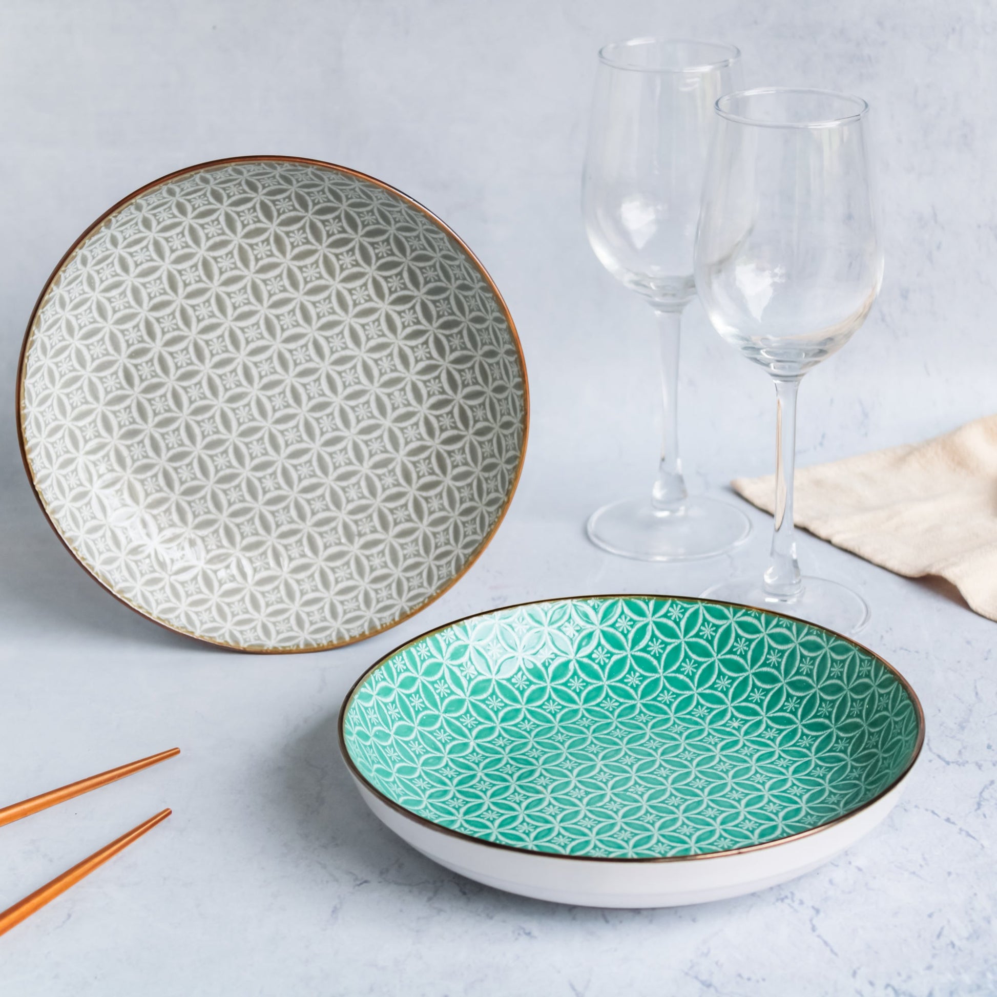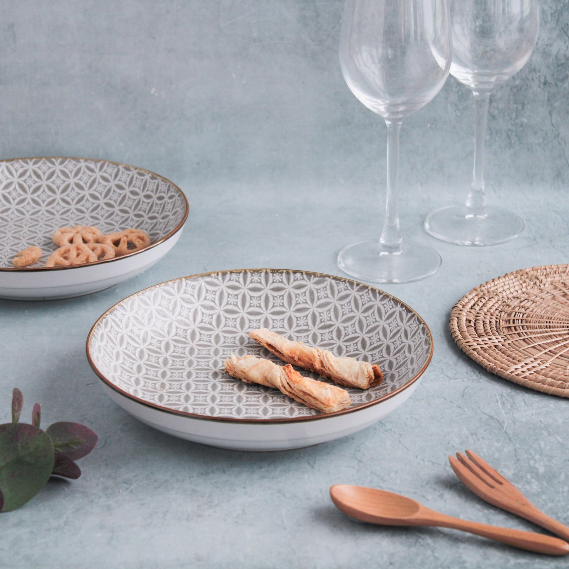 Engraved ceramic plate with beautiful geometric patterns on the inner surface is the ideal dish to bring some color into the kitchen. The plate has a raised bottom with a slightly elevated rim which makes it the perfect crockery for eating slightly gravy-is dishes like ramen or soupy noodles. The engraved floral motifs adds to the aesthetic when paired with the two soothing tones which it is available in.