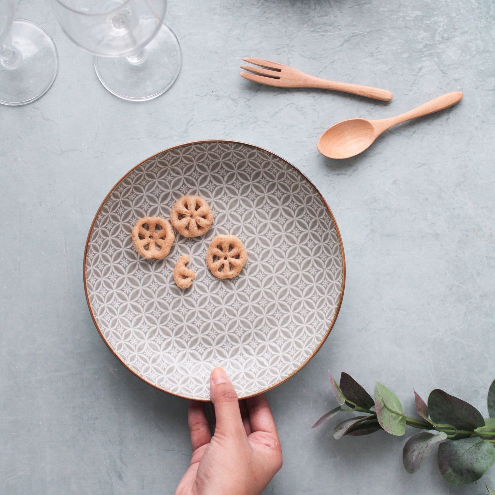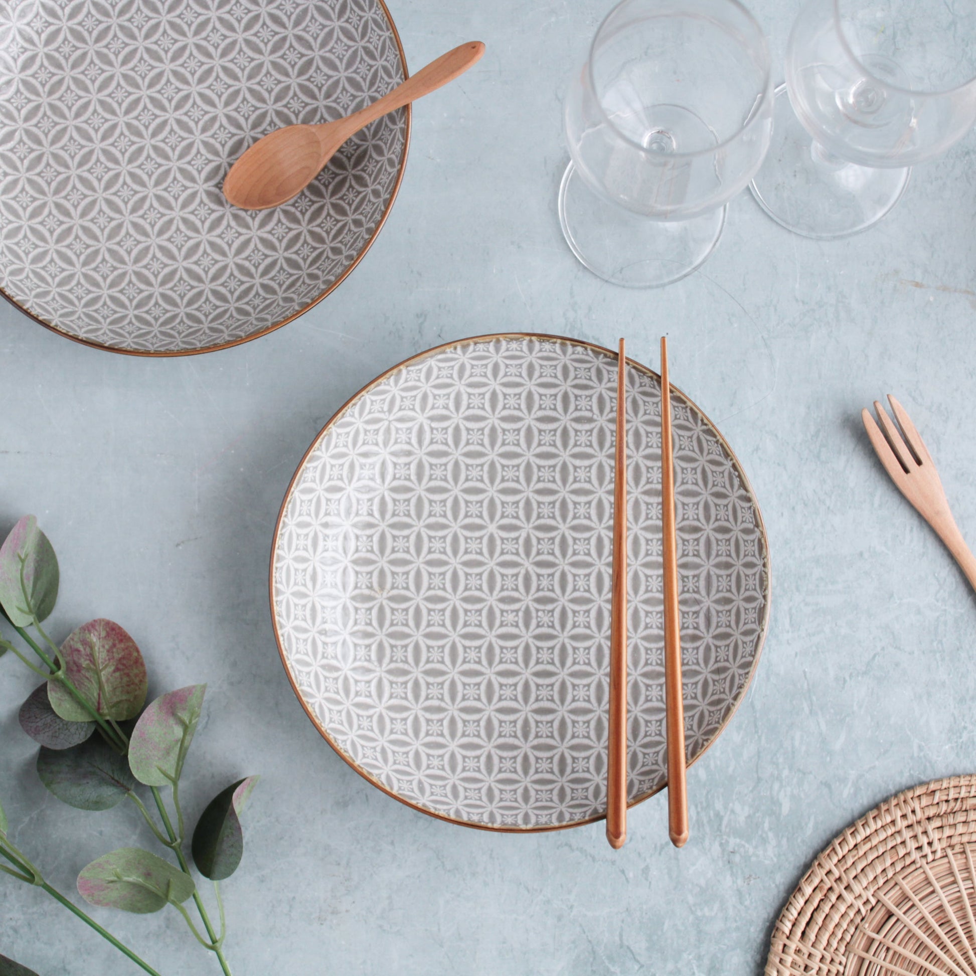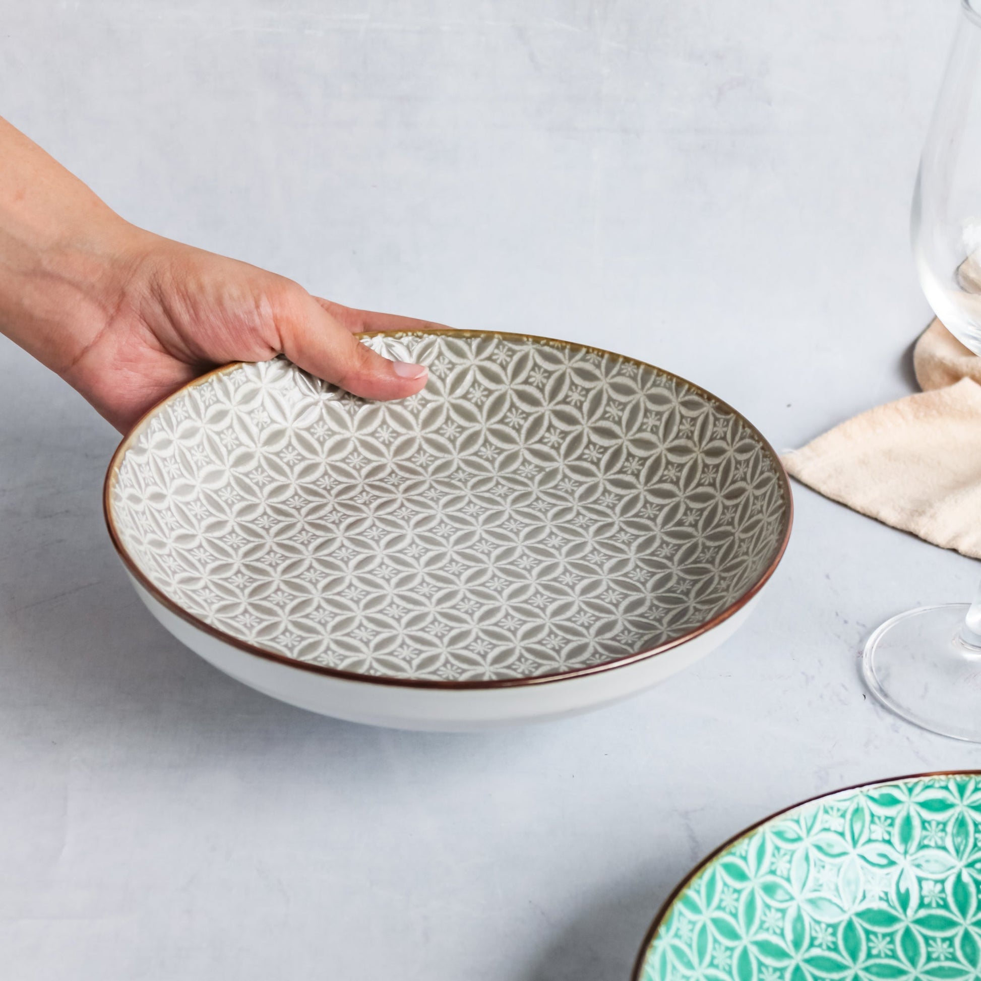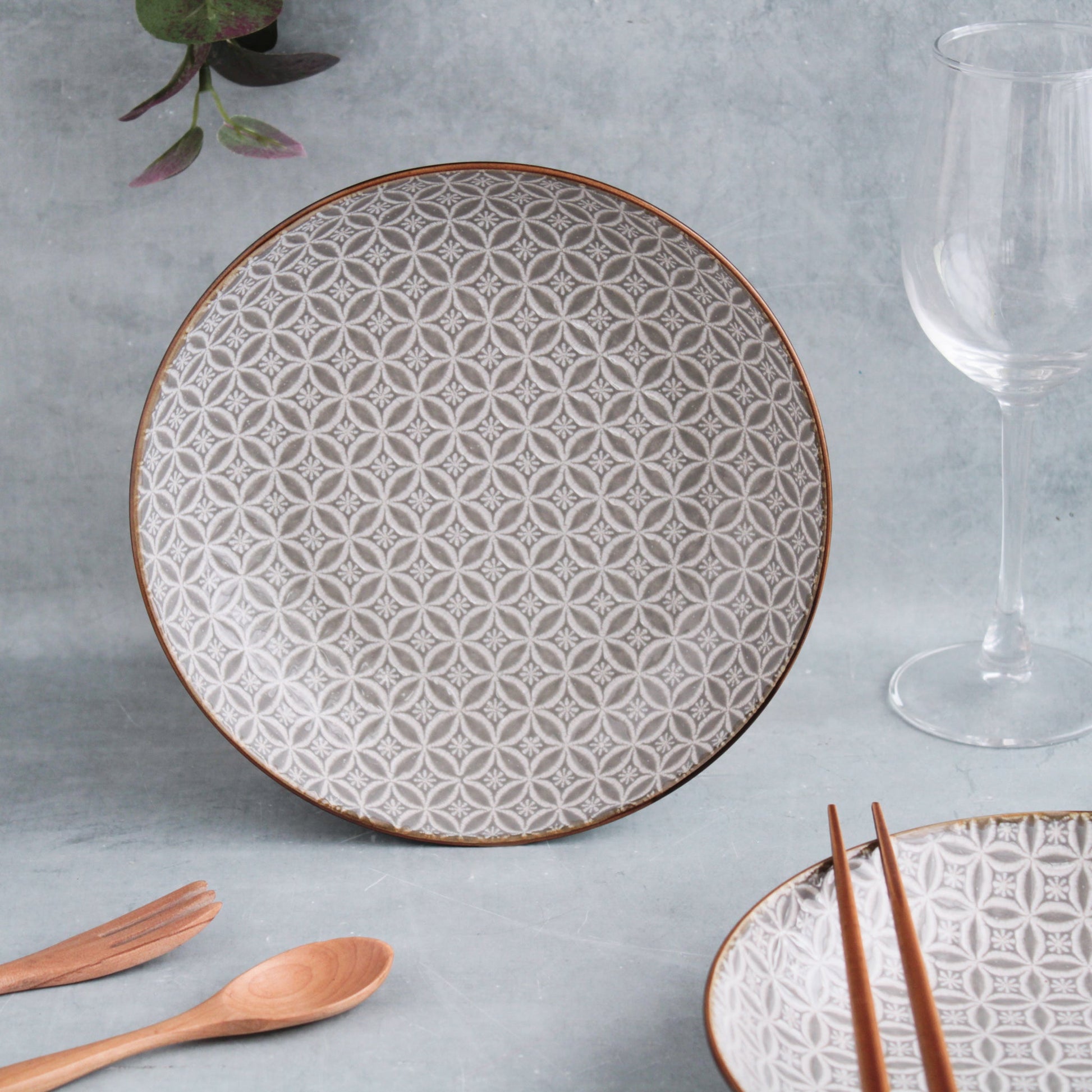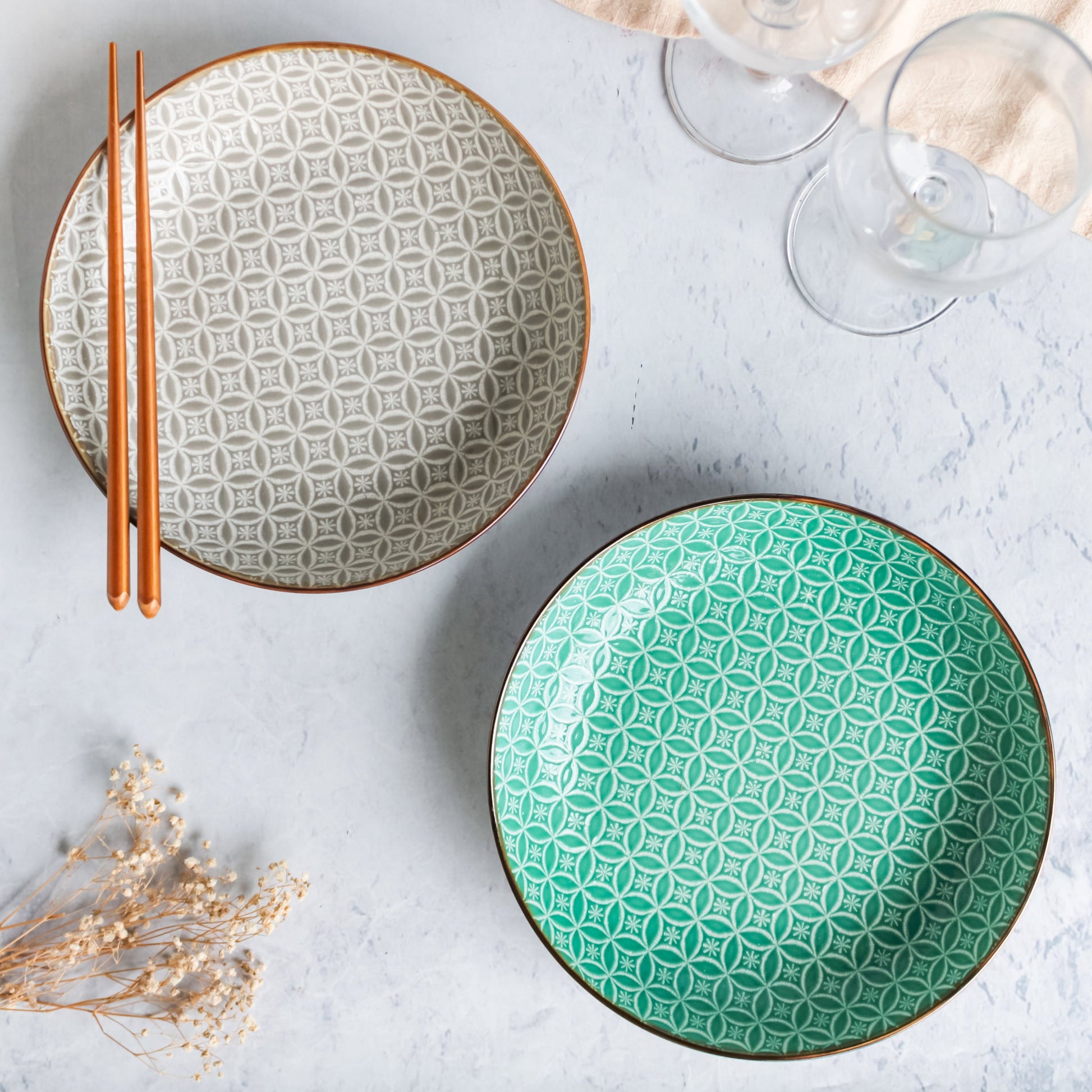 Engraved ceramic plate with beautiful geometric patterns on the inner surface is the ideal dish to bring some color into the kitchen. The plate has a raised bottom with a slightly elevated rim which makes it the perfect crockery for eating slightly gravy-is dishes like ramen or soupy noodles. The engraved floral motifs adds to the aesthetic when paired with the two soothing tones which it is available in.
