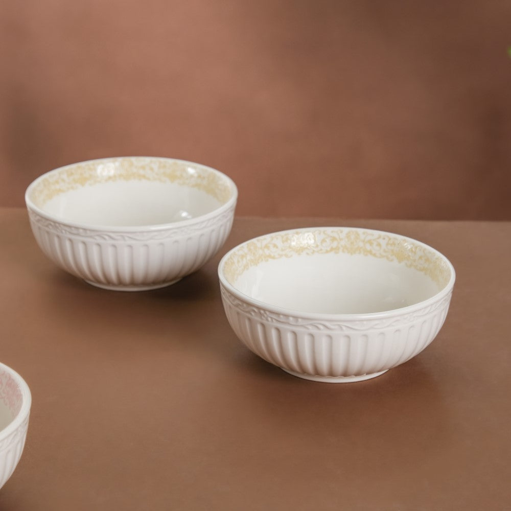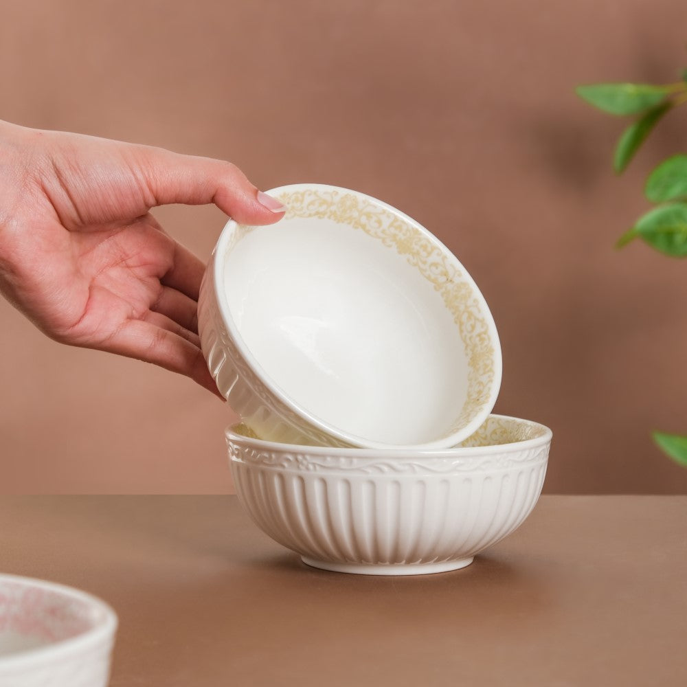 A bowl of popcorn is all you need to relax and unwind after a long day at work and the ceramic bowl set with 2 snack bowls can make snacking extra delicious. The beautiful and intricate yellow engravings on the rims of the snack bowls add to their aesthetic yet minimalistic charm. The yellow engravings on the rim stand out beautifully against the pure white colour of the ceramic snack bowls. You can pair the ceramic bowl set with a white dinner set to create a fancy dinner party spread to woo guests. The ceramic snack bowl set can also be excellent for gifting purposes on special occasions, like anniversaries or housewarmings.