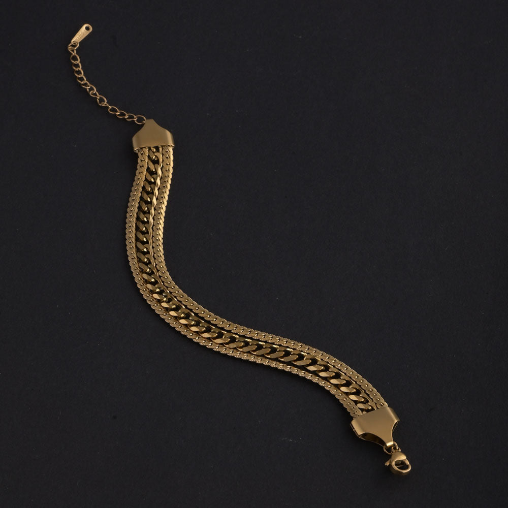 This bracelet features polished interlinked design crafted with balance and symmetry, reflecting harmony in style. Its golden finish offers shine and durability, while the adjustable clasp ensures comfort. A versatile accessory that merges timeless design with modern craftsmanship for refined elegance.
