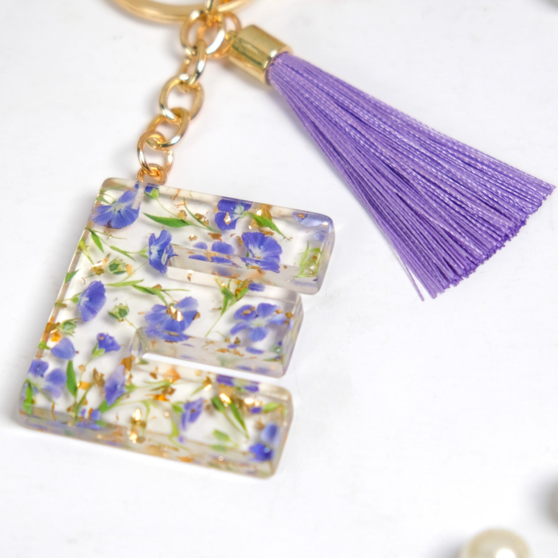 The fancy "E" resin keyring combines elegance with functionality. Enclosed in a transparent resin base are pressed lavender forget-me-not flowers complemented by flecks of golden accents, which make this keychain simply irresistible!