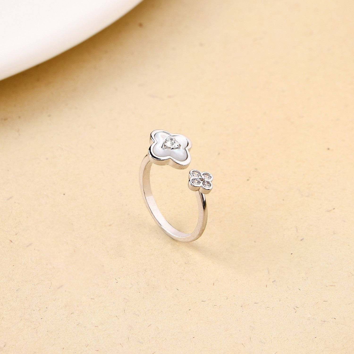 A little floral, a little glam—this ring is the perfect mix of elegance and edge. The silver-toned bypass design wraps around your finger like a delicate embrace, ending in two breathtaking blooms. One side features a white resin flower framed in silver, with a tiny stone-studded triangle embossed at its heart—because details matter. The other end sparkles with a smaller silver-framed flower, filled with crusted iridescent stones that catch the light just right.