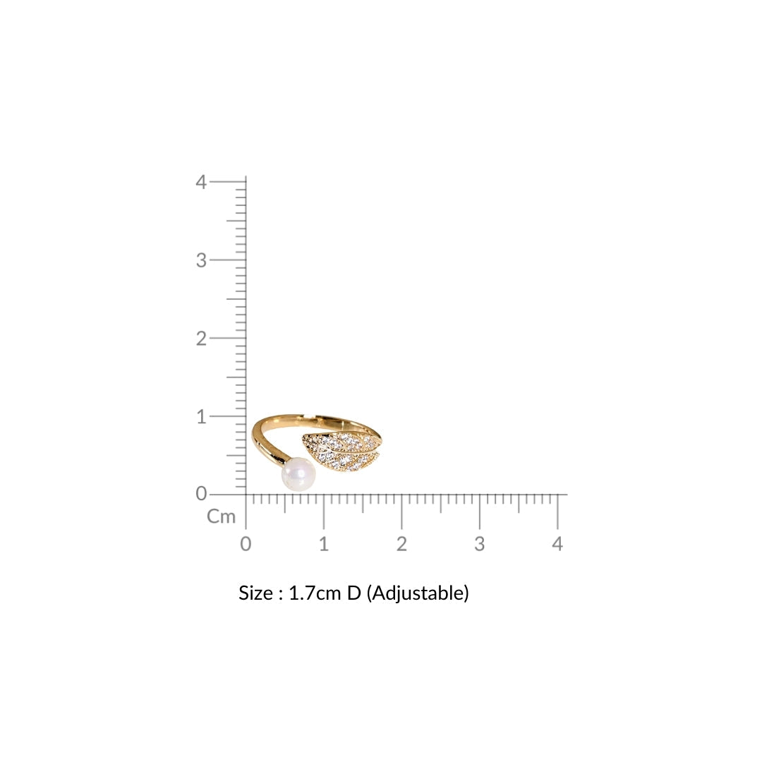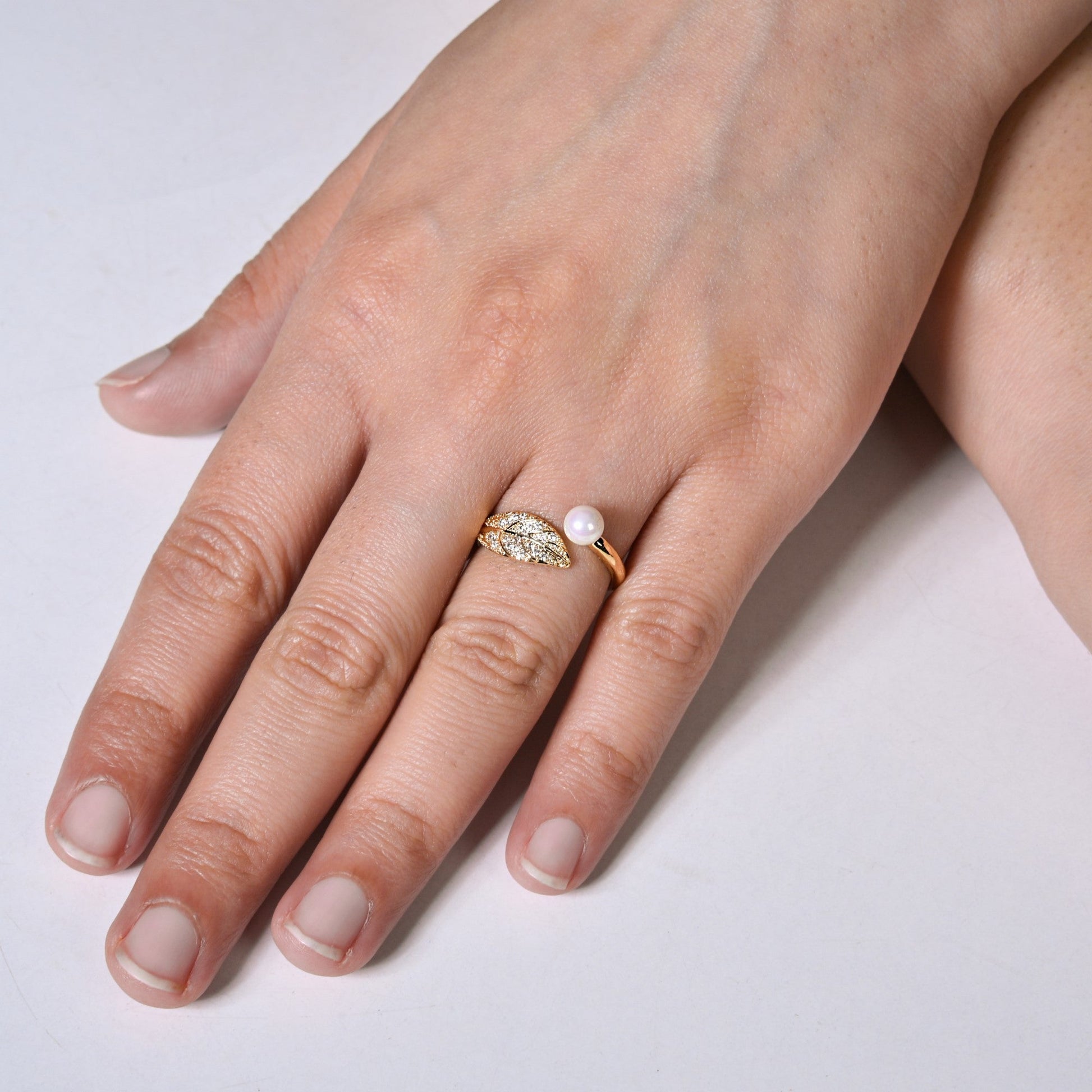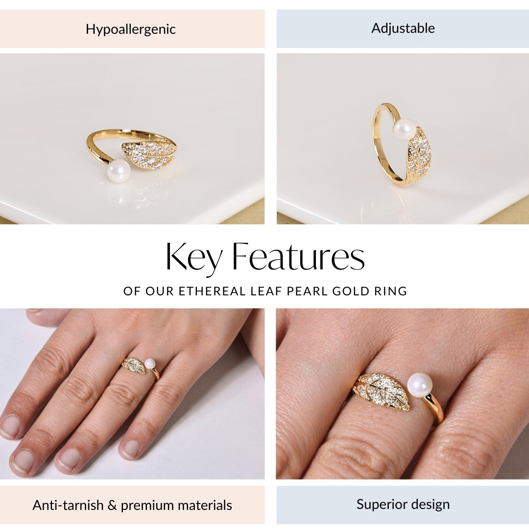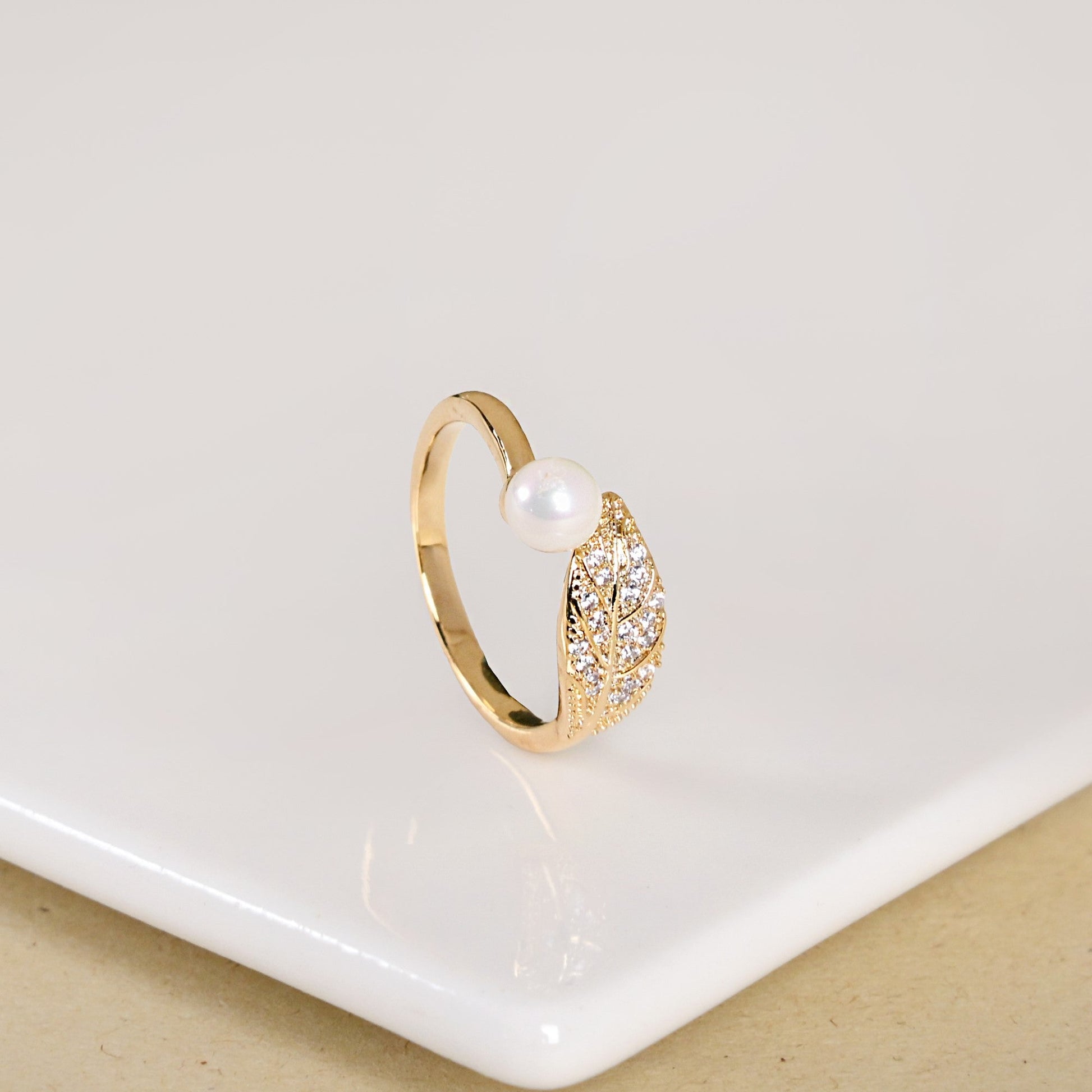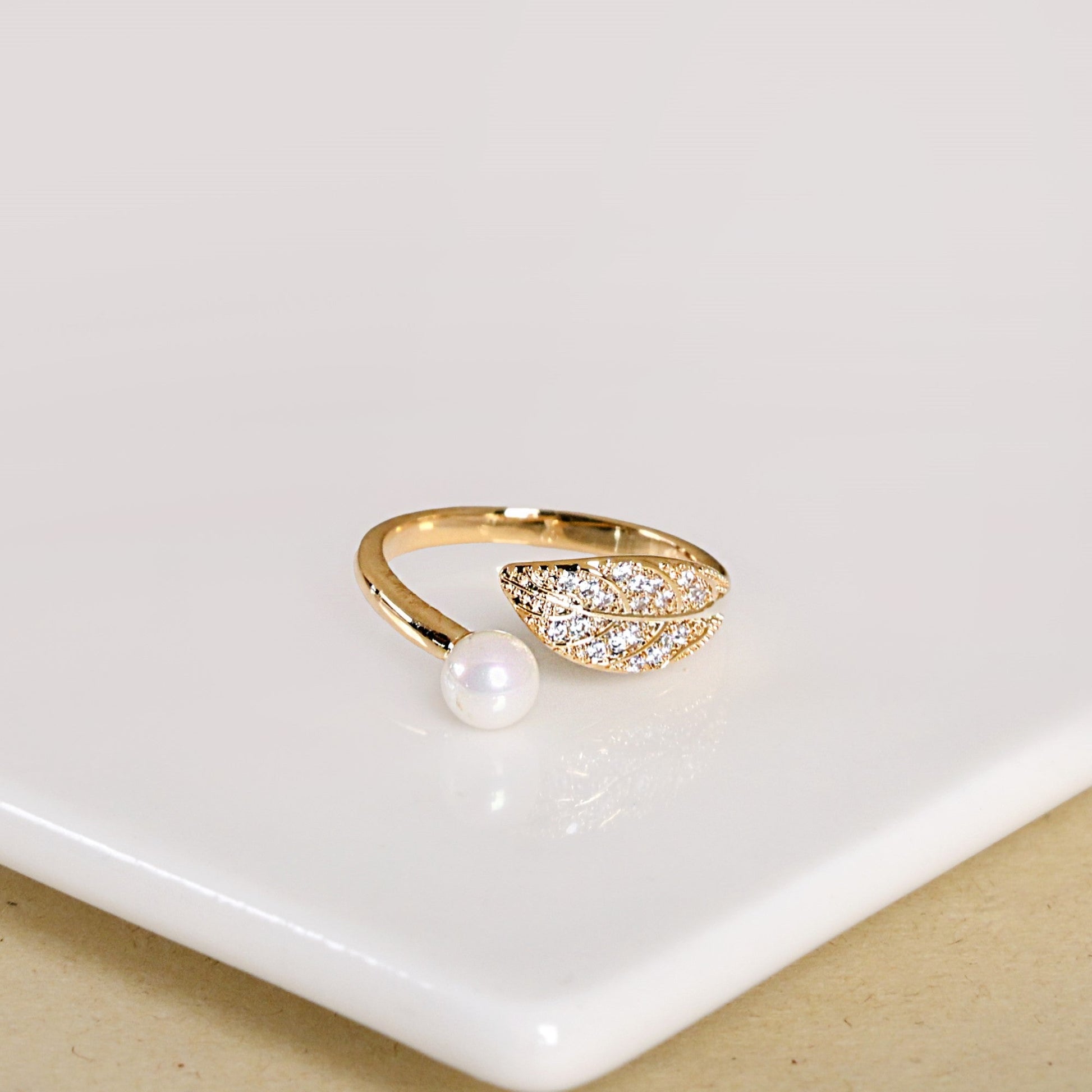 Inspired by nature's quiet elegance, this leaf pearl ring captures the beauty of contrast and harmony. One end blooms into a lifelike gold metal leaf, its intricate veins carved with precision, while crusted iridescent stones shimmer like dewdrops on its surface. Opposing this organic brilliance, a luminous pearl rests gracefully, adding a touch of timeless sophistication. A perfect fusion of earth and ocean, this ring is a poetic statement—delicate yet bold, intricate yet effortless, just like nature itself.