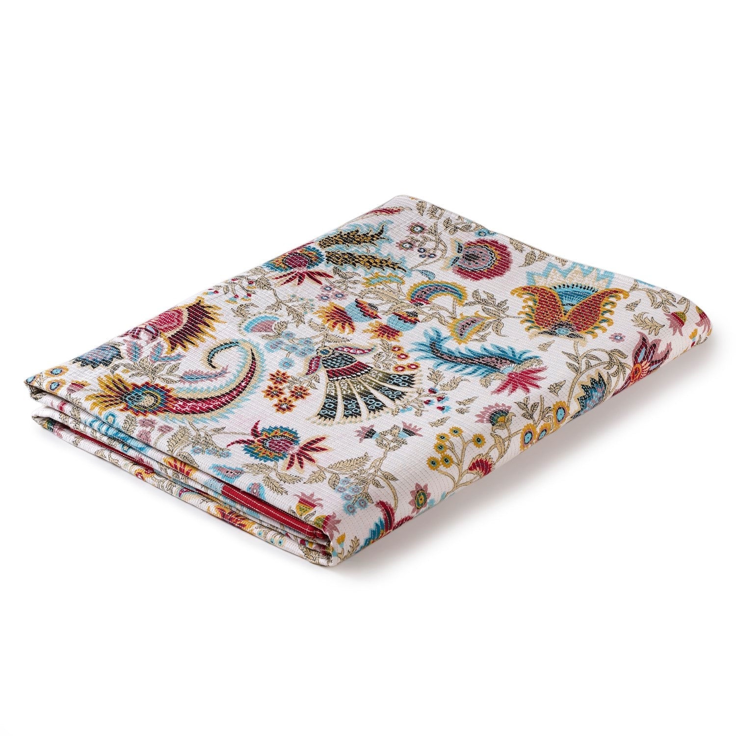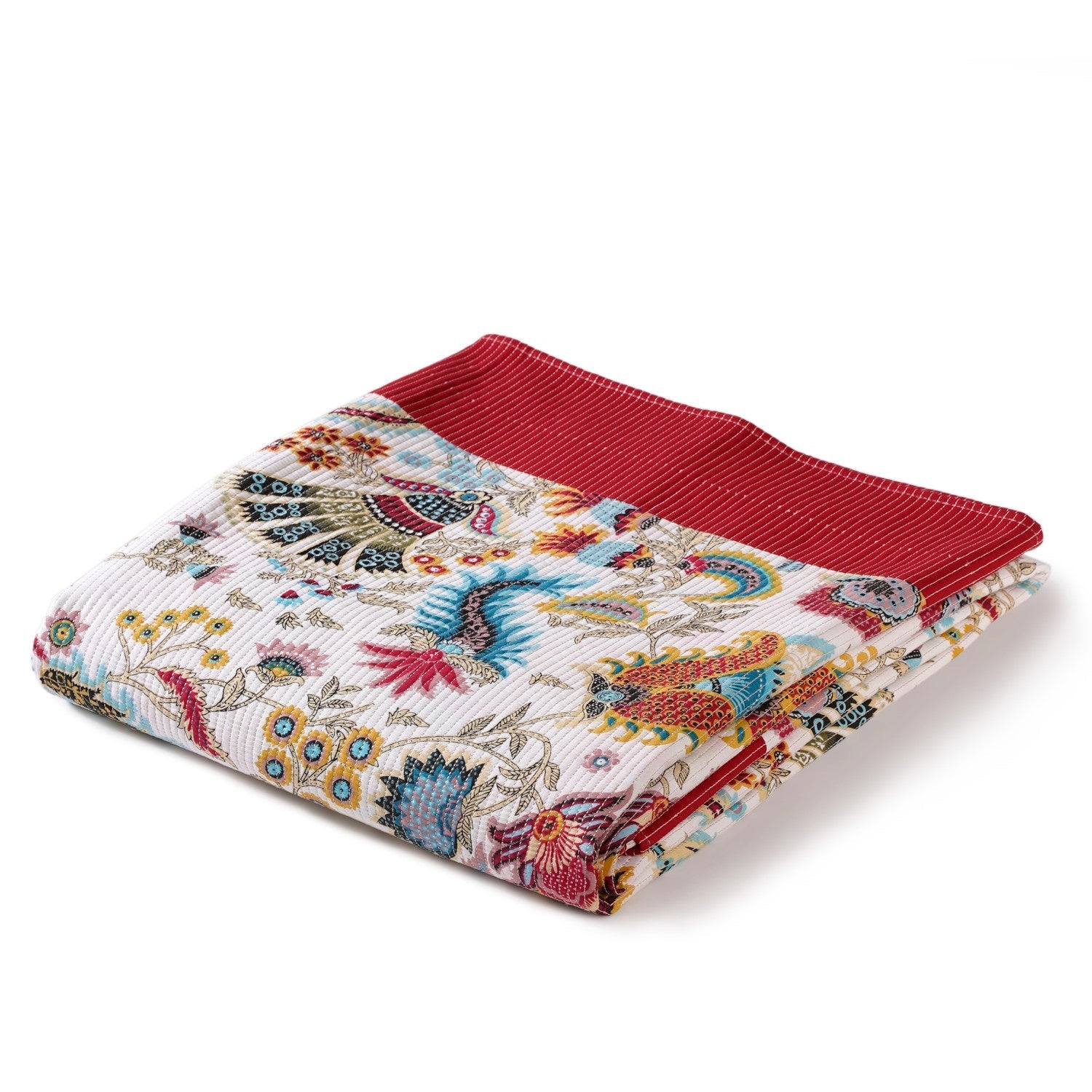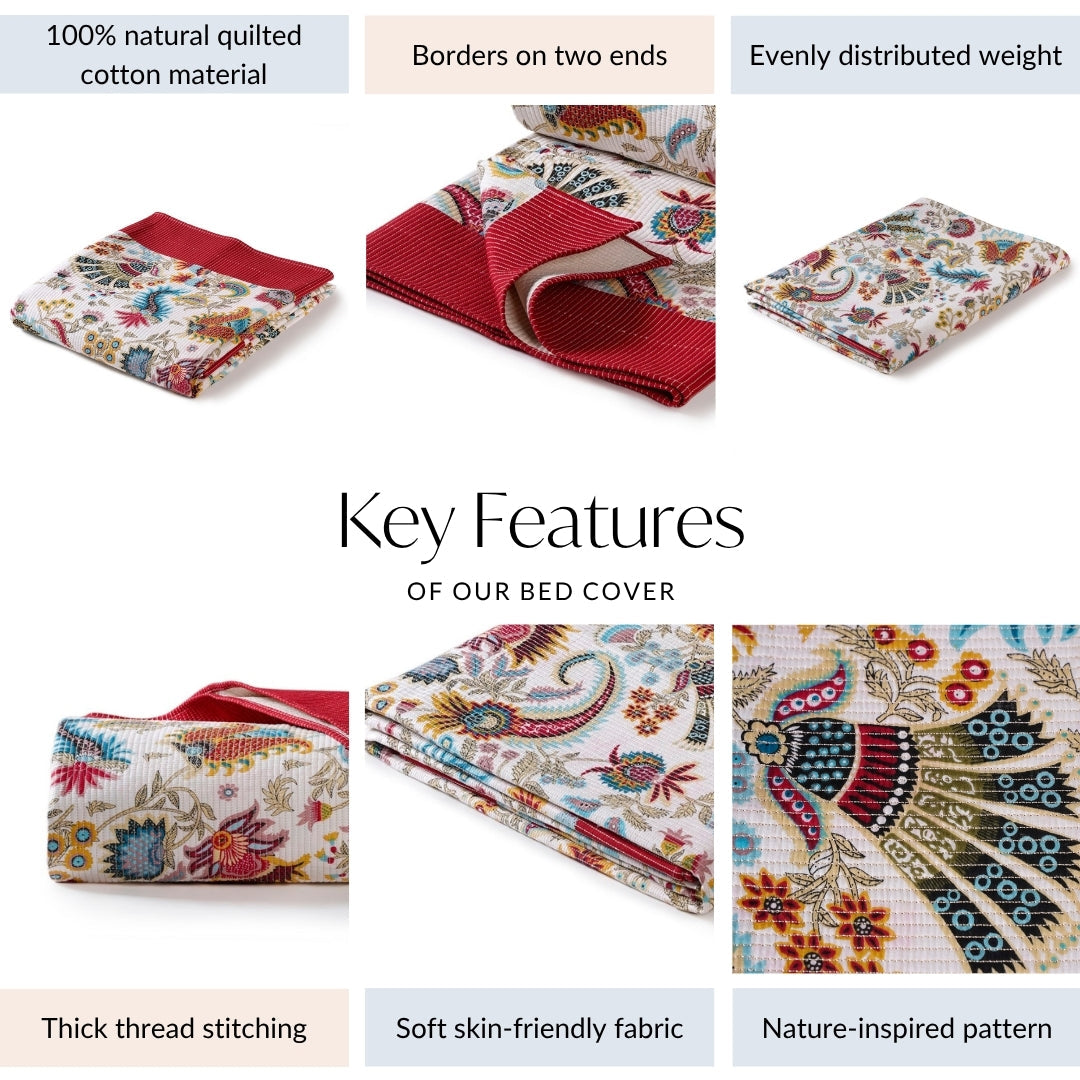 Design: This bedcover features a classic quilted design that adds both texture and comfort. The timeless floral pattern beautifully captures a sense of elegance and cheerfulness. With red borders at two ends, it brings a lively contrast that frames your bed perfectly. The evenly distributed weight keeps the bedcover neatly in place, avoiding any shifting during the night. Its vibrant colour patterns bring a lively and welcoming energy to any bedroom. Finally, the white thread stitch detail complements the overall design, tying it all together with a neat finish.