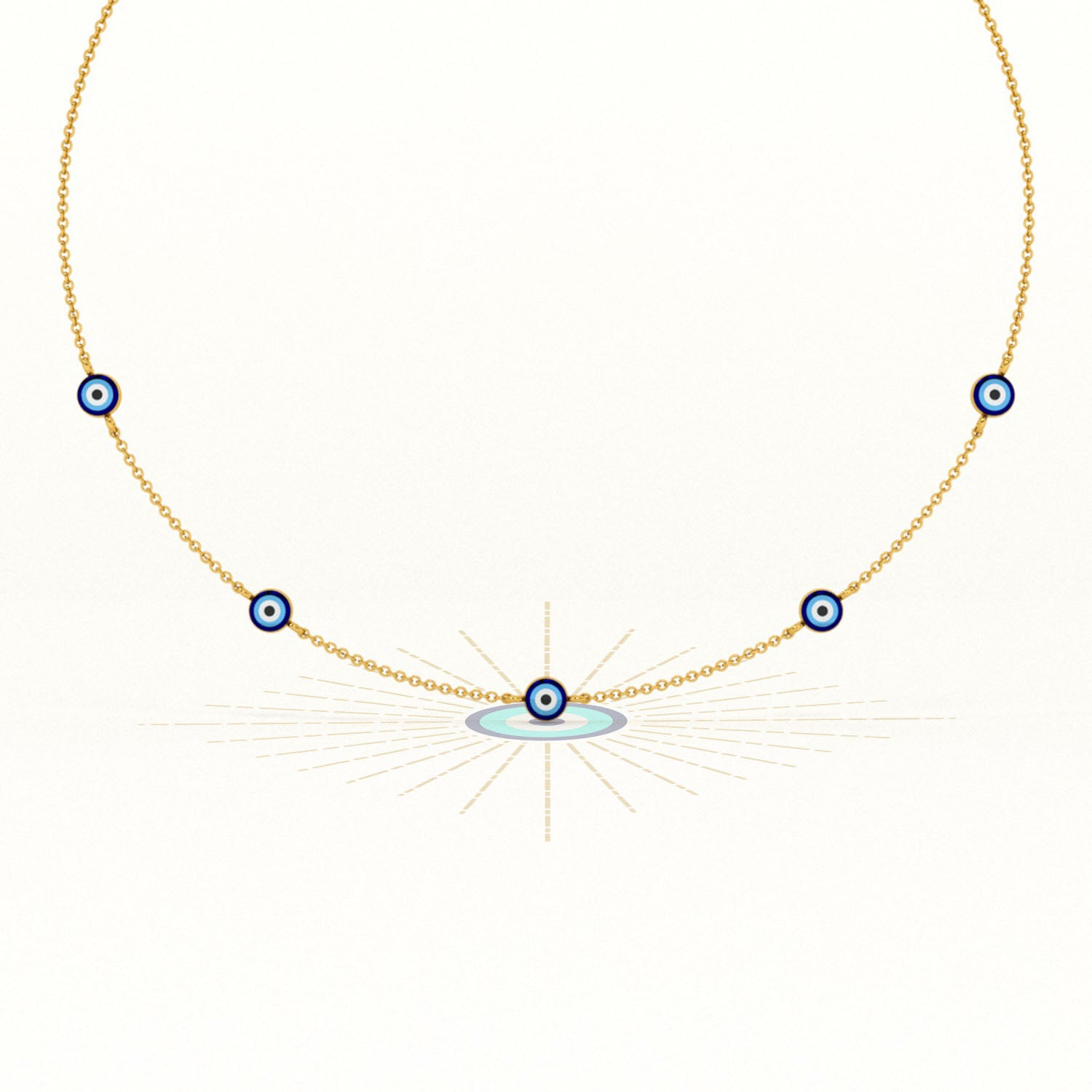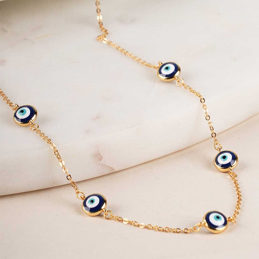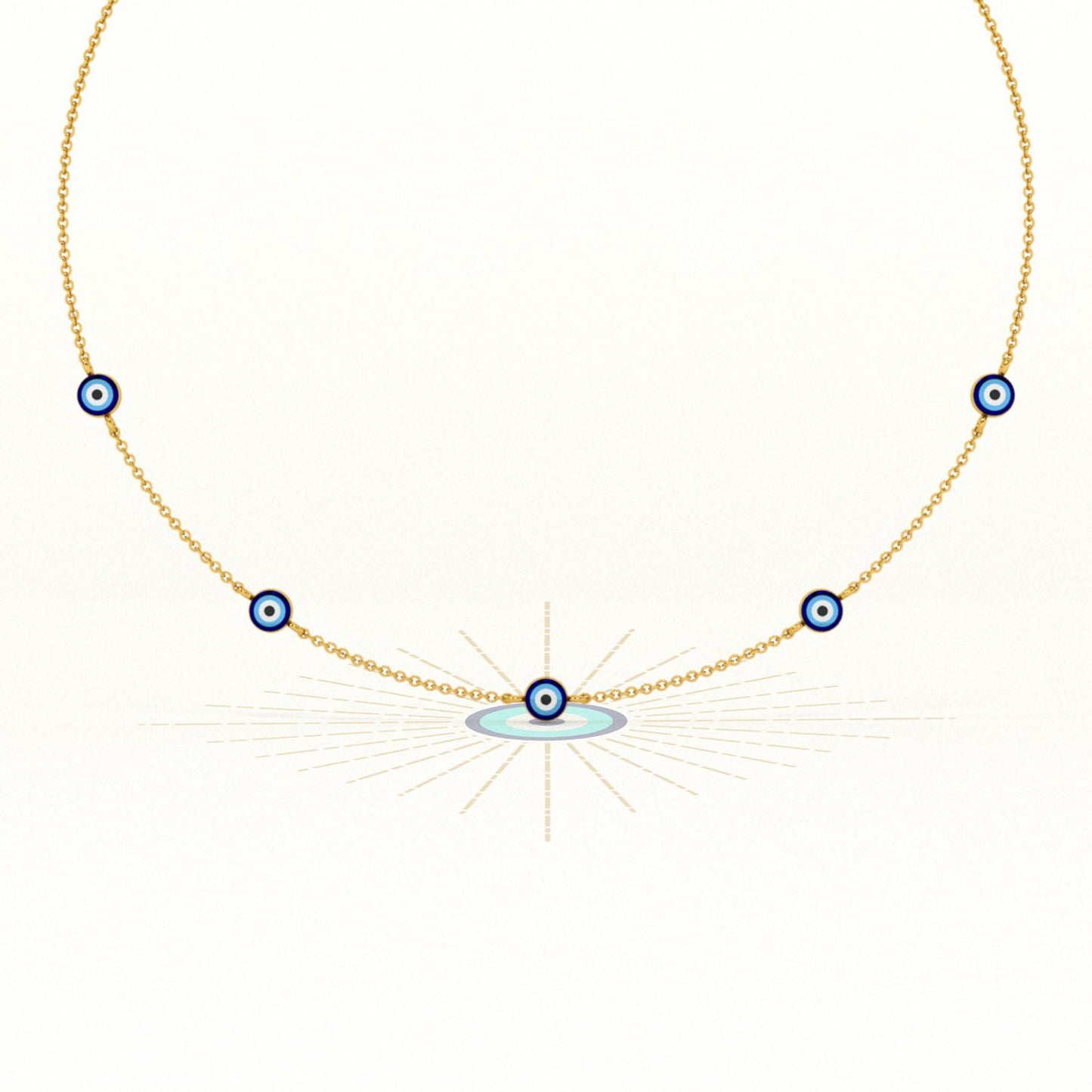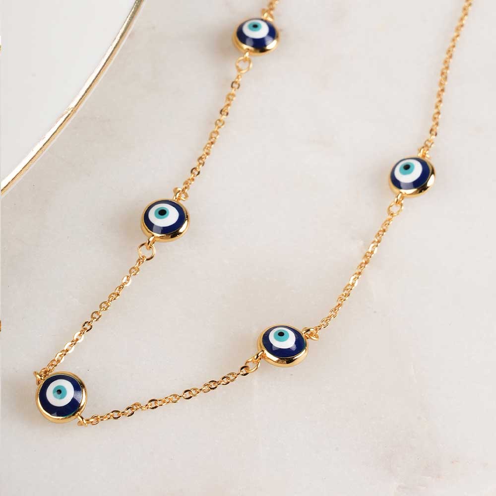 The Evil Eye Station Necklace embodies effortless elegance and spiritual symbolism. Crafted in luminous 925 sterling silver, it features evenly spaced evil eye charms that offer both style and protection. Delicate yet striking, this necklace layers beautifully or stands alone as a subtle statement of strength, positivity, and grace - a perfect fusion of timeless craftsmanship and modern jewellery design.