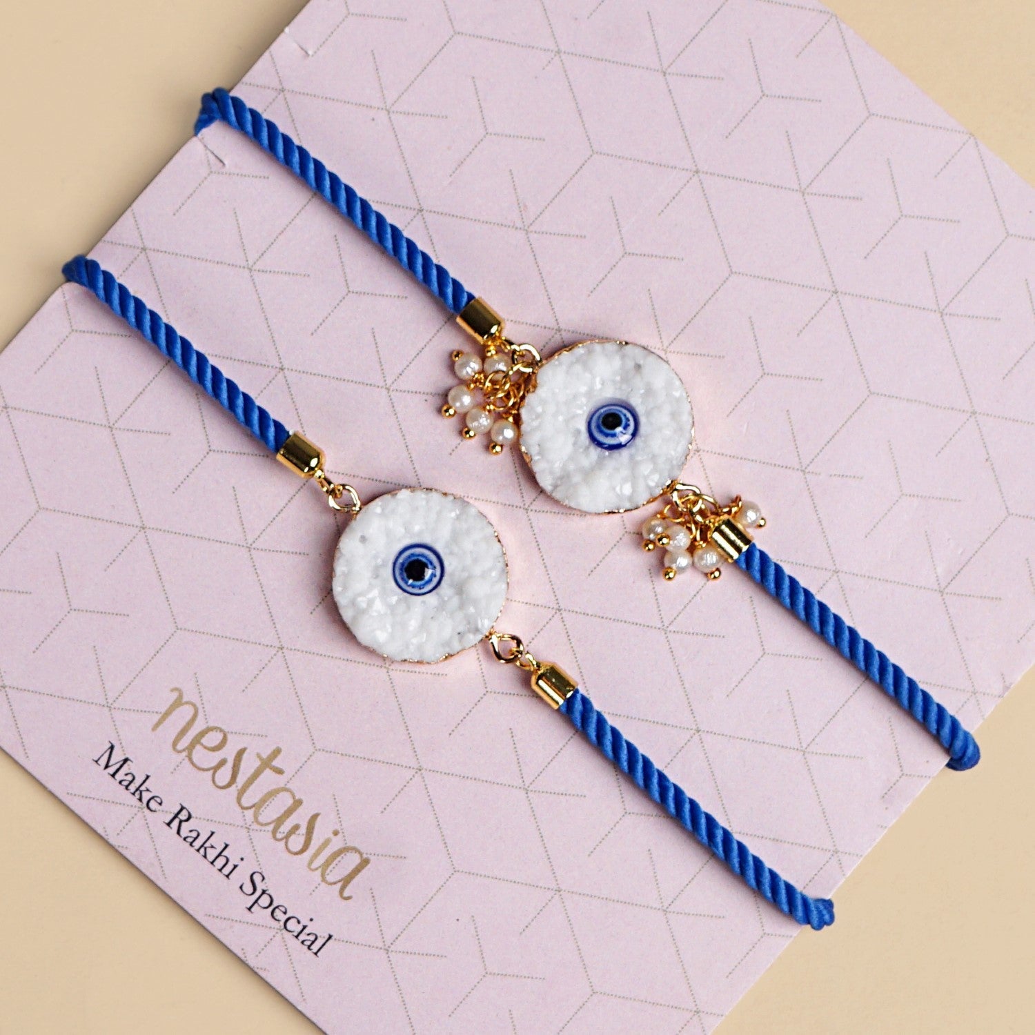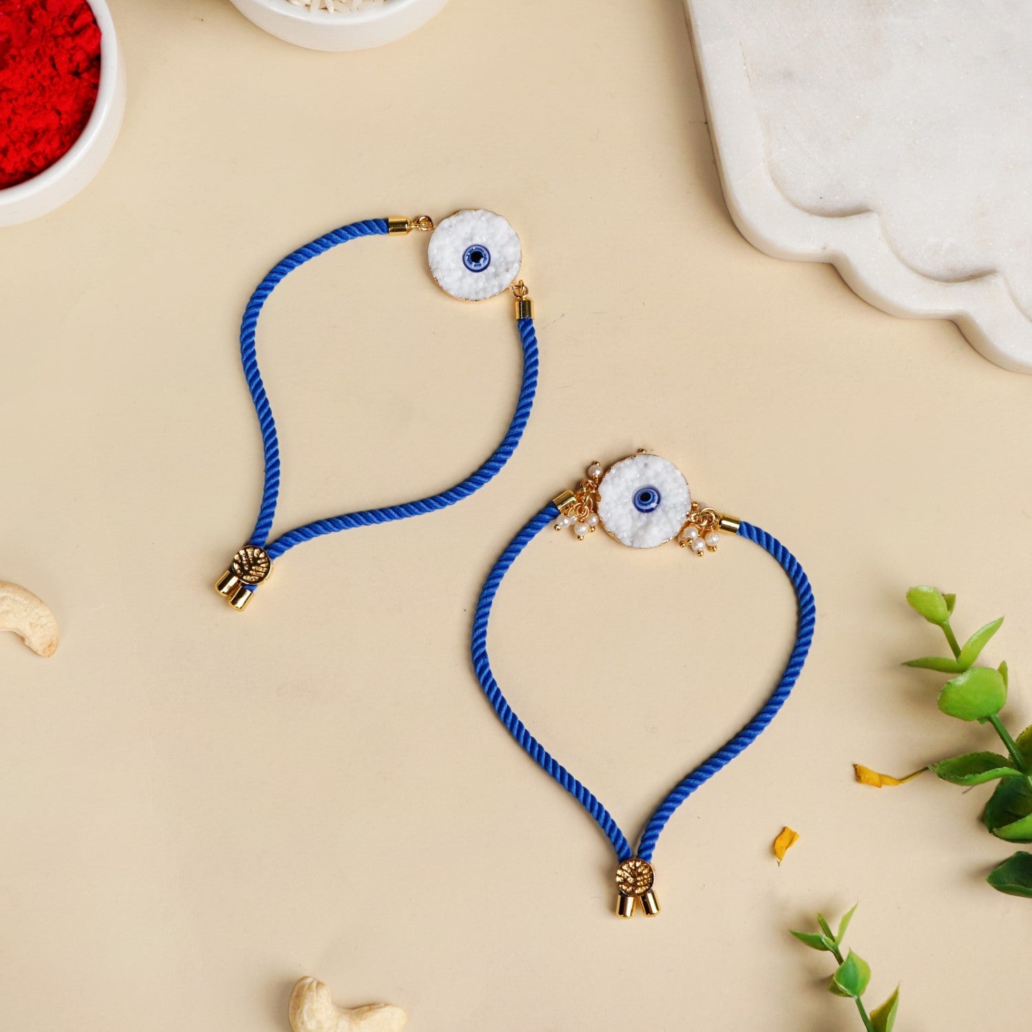 Celebrate the sacred bond of protection and love with this exquisitely crafted evil eye rakhi bracelet set. At the heart of the adjustable rakhi and bracelet lie textured white discs, reminiscent of marble-like crushed stone, featuring a striking blue evil eye motif. The set is truly a timeless symbol for safeguarding against negative energy and ill will. It is beautifully complemented by a rich royal blue braided thread, offering a vivid contrast that enhances its visual appeal. Accents of gleaming gold-toned metal caps and delicate embellishments, including tiny charms and faux pearls, add a refined touch of opulence.