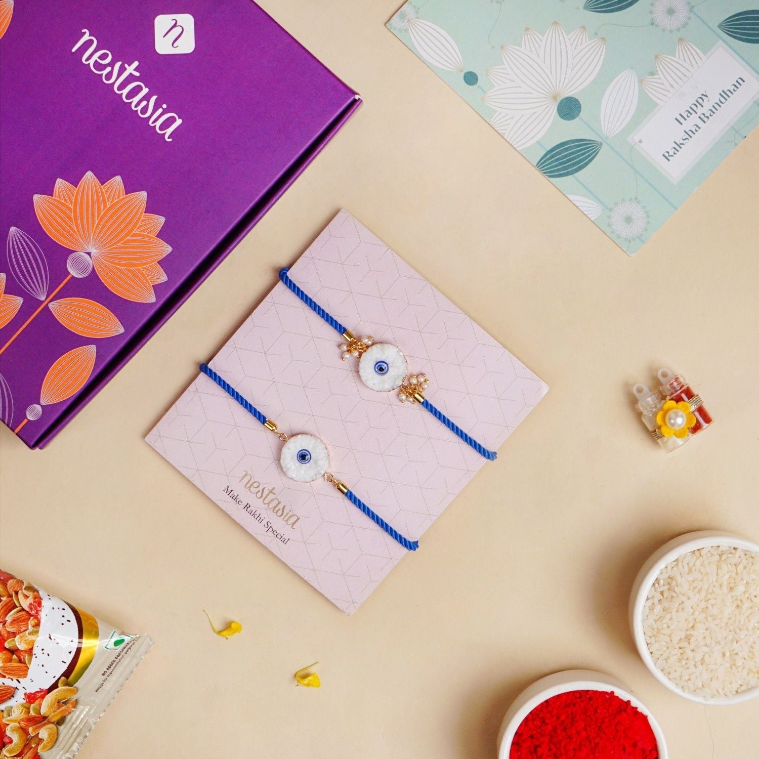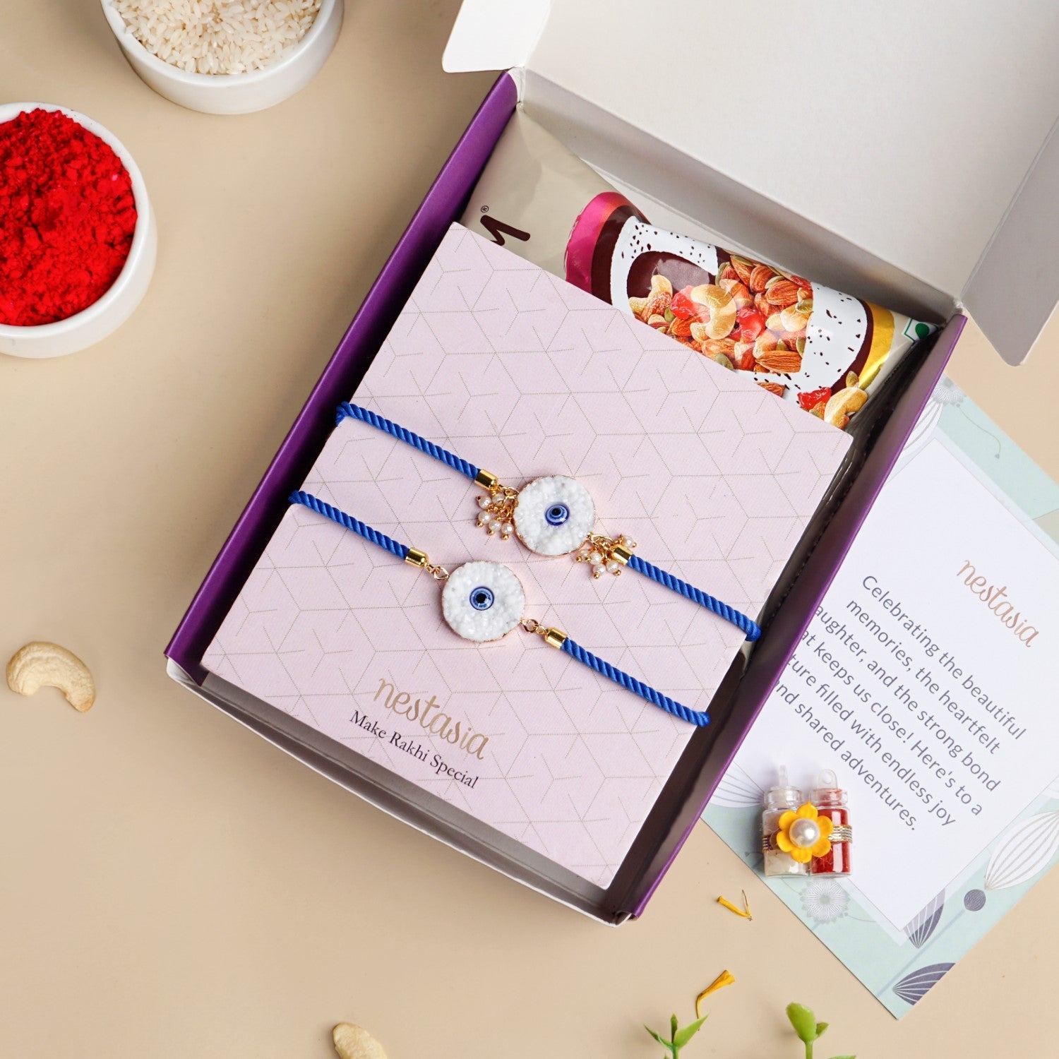 The set includes 1 rakhi band & 1 bracelet, 1 roli chawal bottle set, 1 pack of mixed dry fruits (free gift), 1 gift box, and 1 wish card.