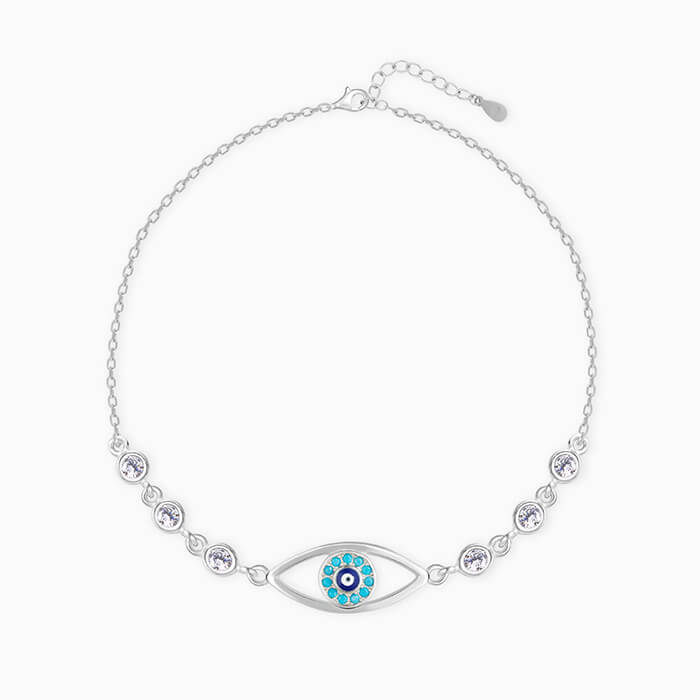 The silver bracelet has circular beads studded with zircons and an eye shape structure at the centre with a coloured stone.